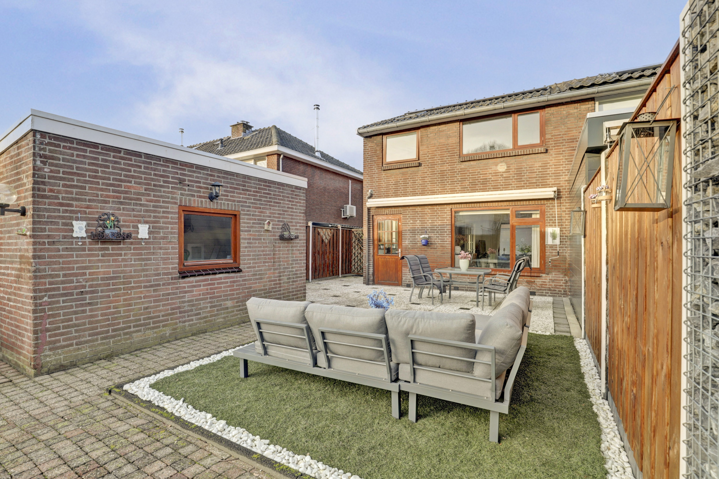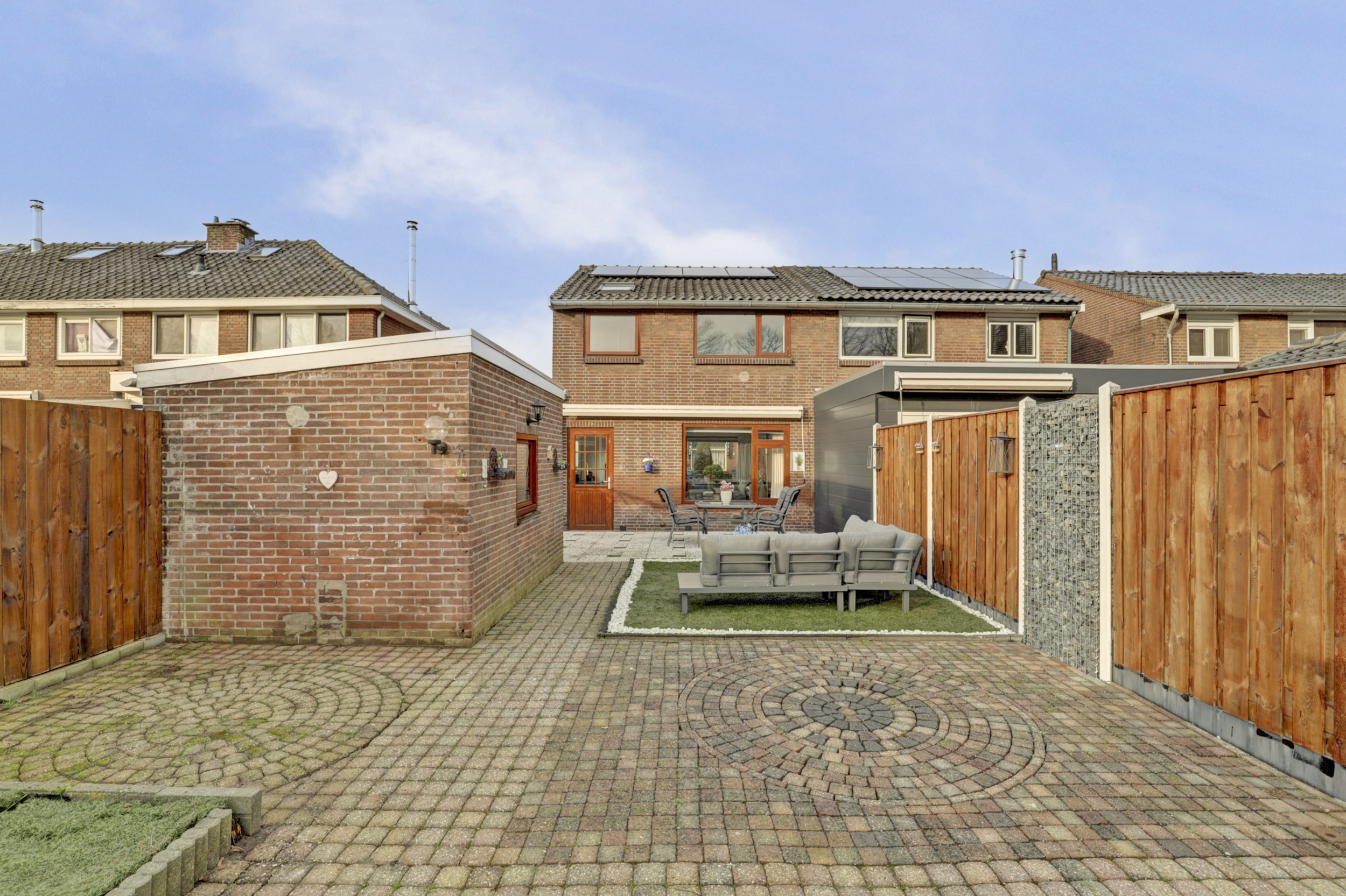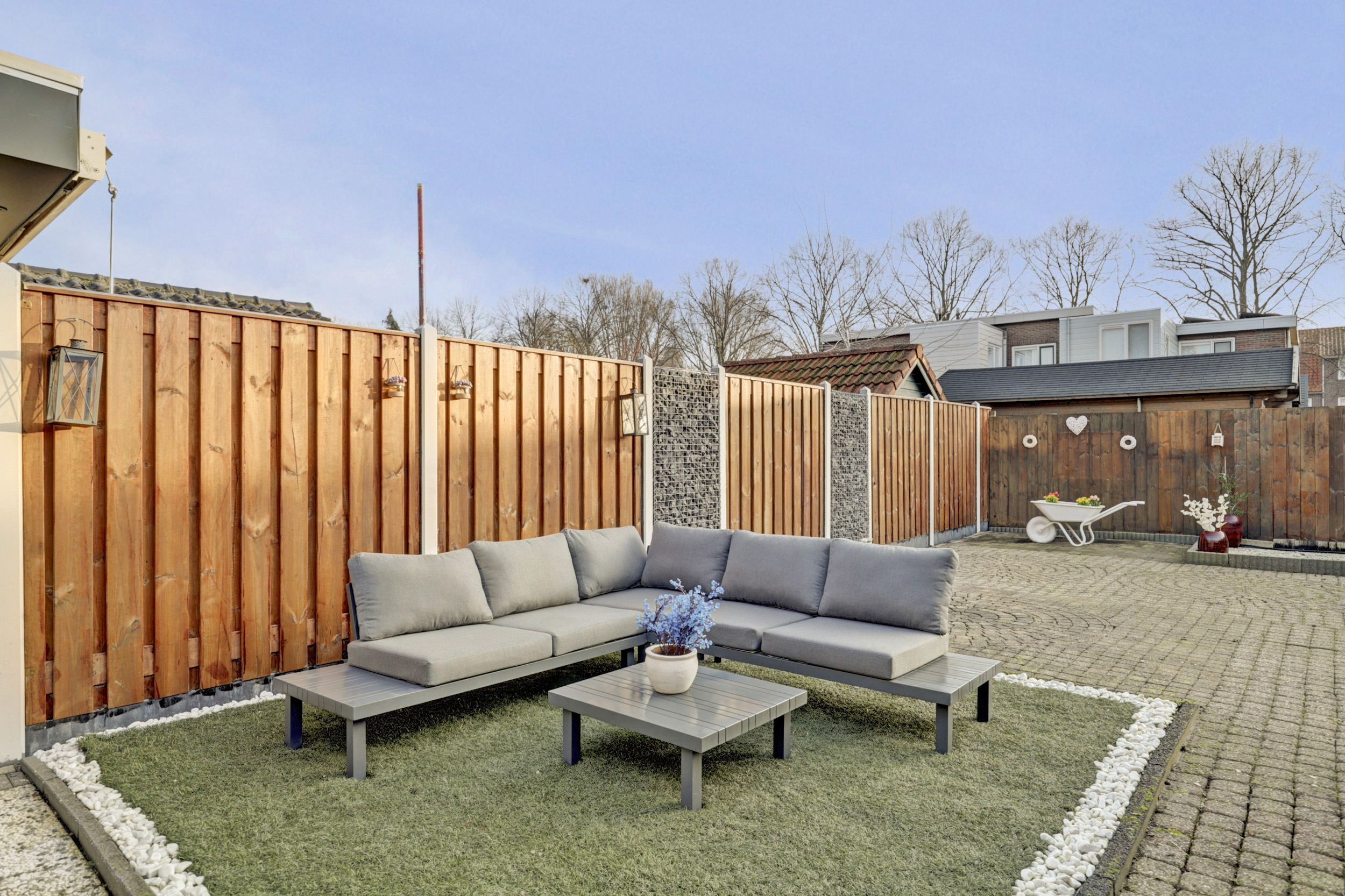 Bij aankomst valt direct de verzorgde voortuin op, die is betegeld en speels is ingericht met twee kleine boompjes. Via de zijtuin is er toegang tot de achtertuin, wat zorgt voor een praktische en prettige routing rondom de woning. Aan de voorzijde van de woning is zonwering aanwezig in een geel-wit gestreepte uitvoering, geplaatst bij het woonkamerraam.