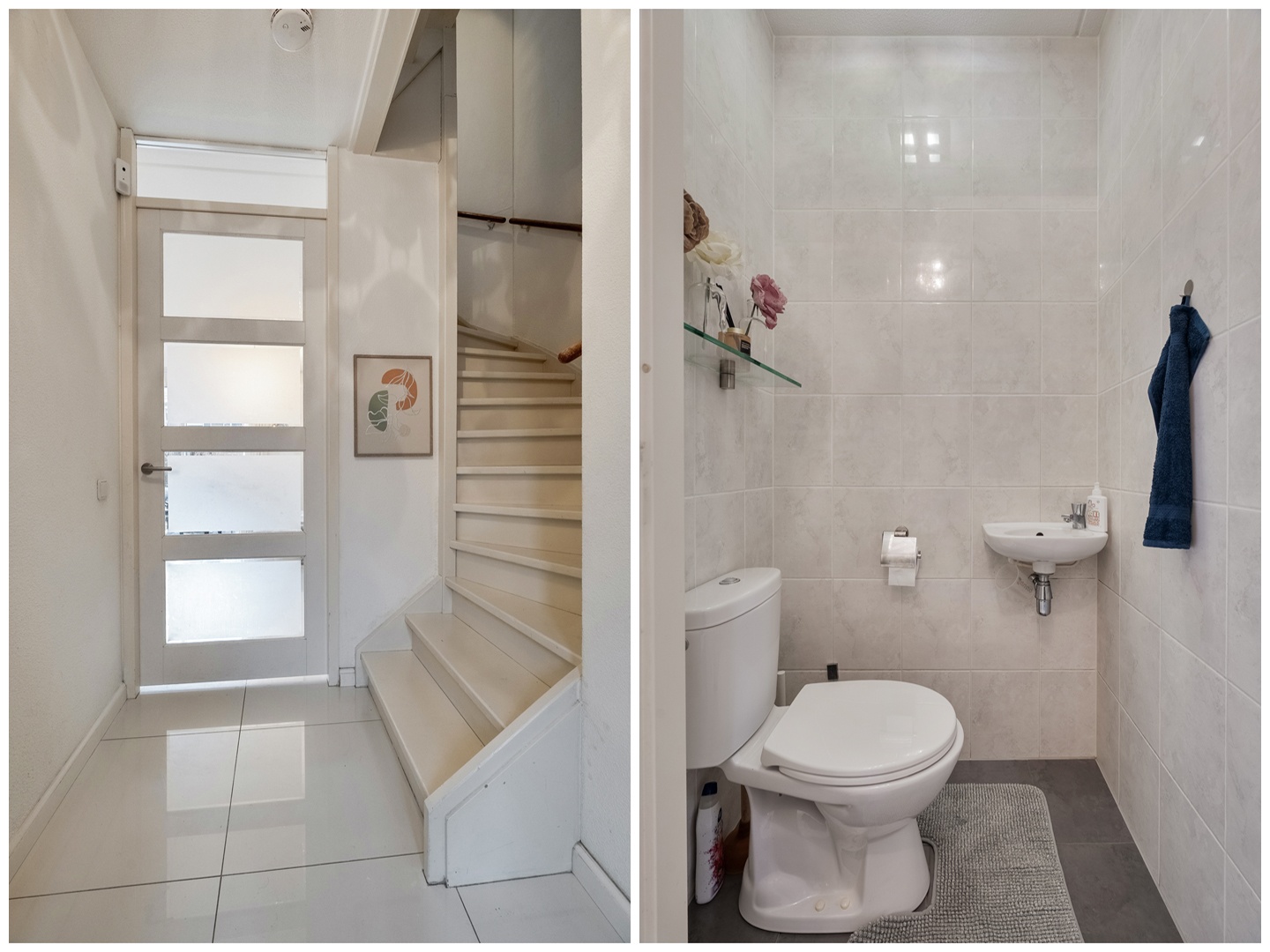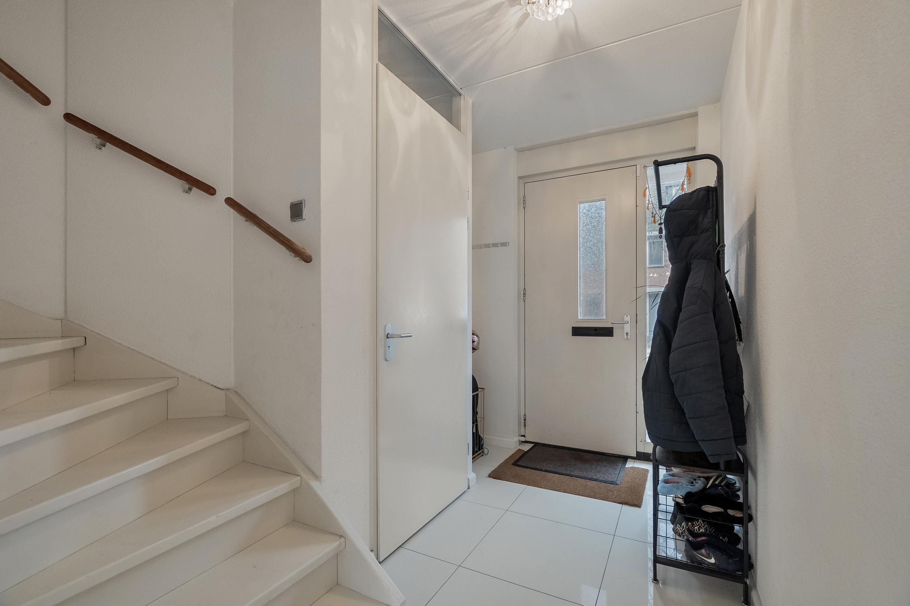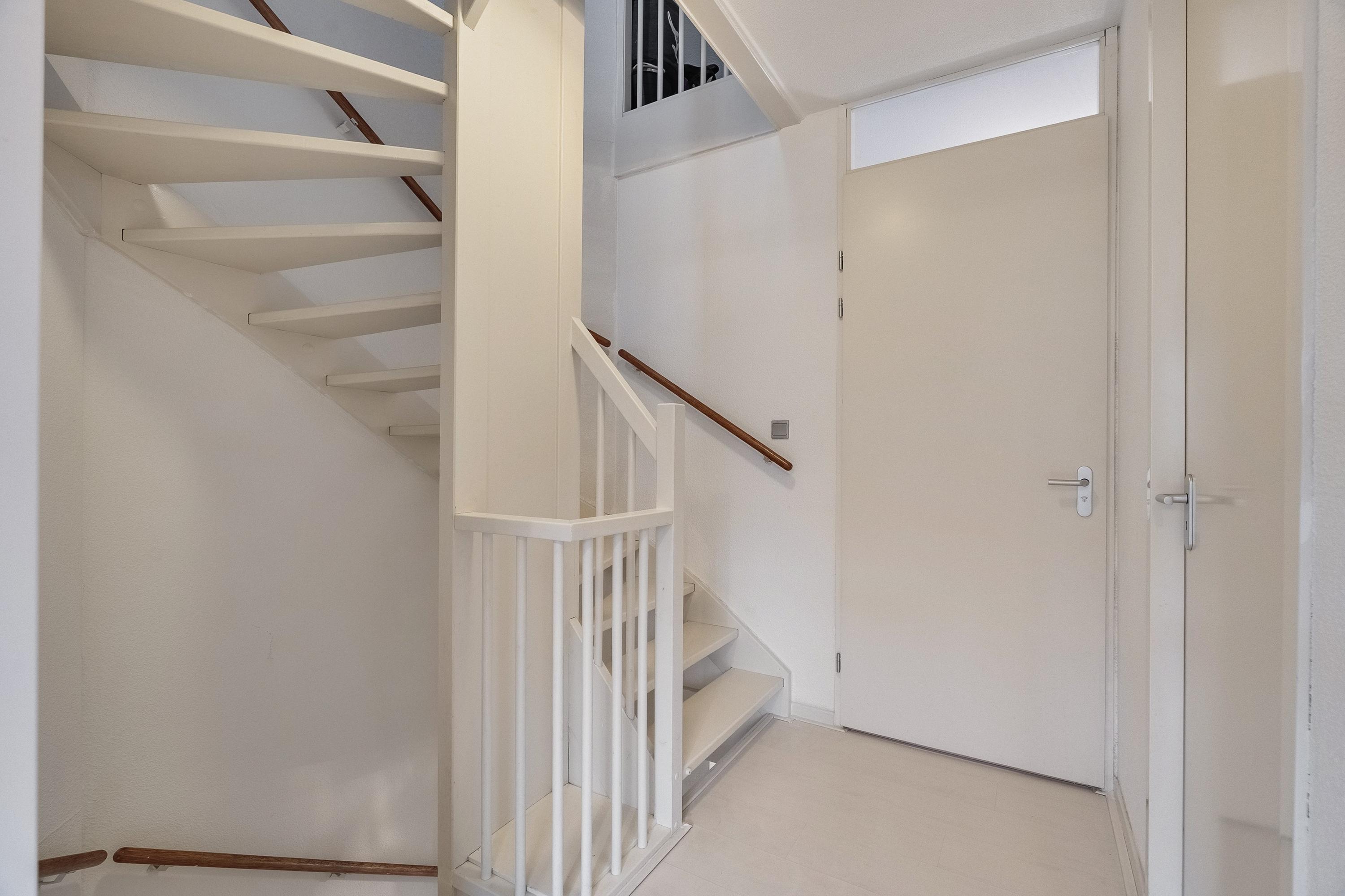 Via de voortuin bereikt u de entree van de woning. De ruime hal is voorzien van een meterkast, de trapopgang naar de eerste verdieping en een modern afgewerkte toiletruimte met duoblok toilet en fonteintje. De toiletruimte is volledig betegeld in een neutrale kleurstelling.