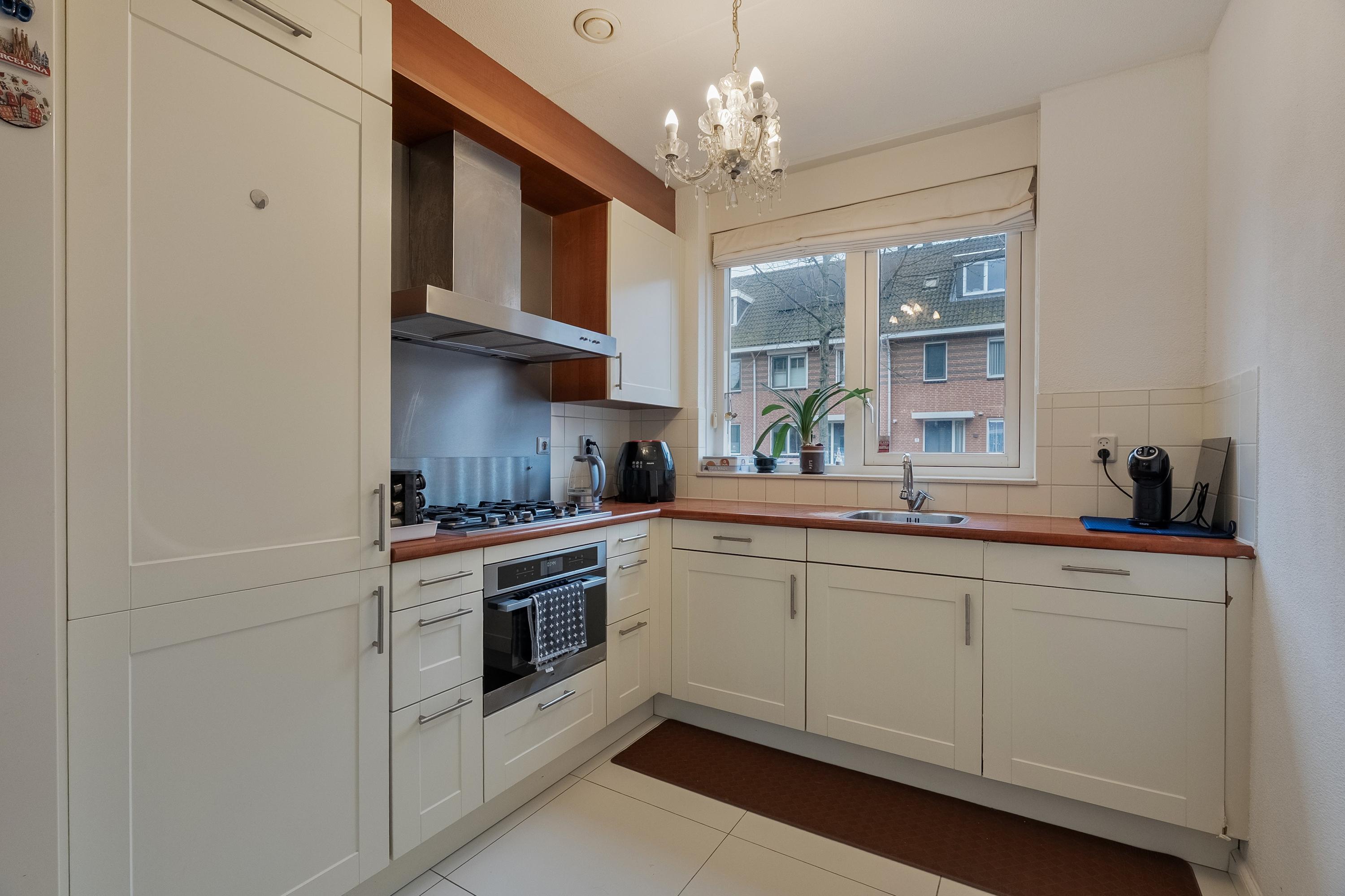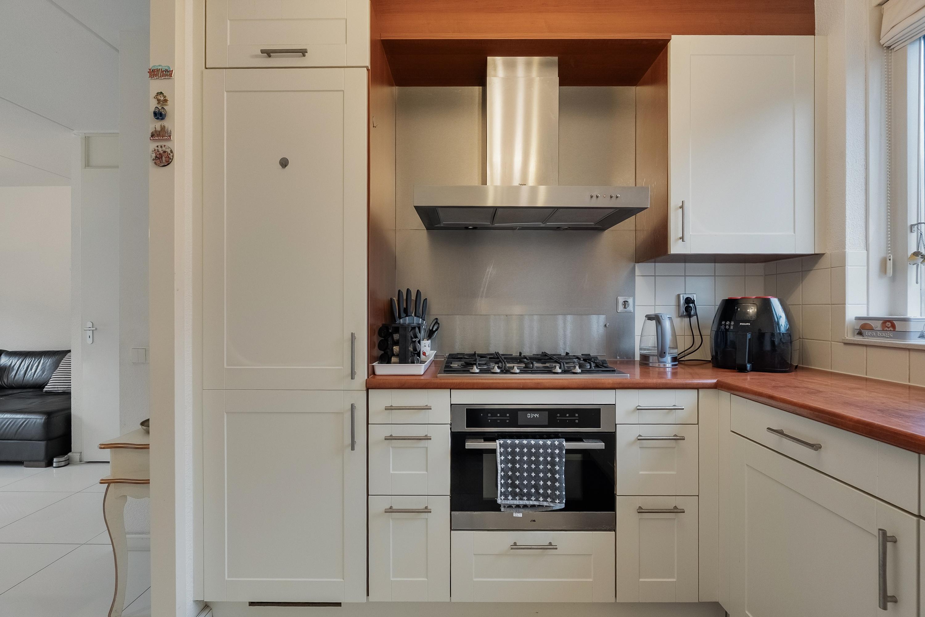 Aan de voorzijde van de woning bevindt zich de open keuken, uitgevoerd in een moderne hoekopstelling. De keuken is uitgerust met een spoelbak, koelkast, vriezer, combimagnetron, 5-pits gaskookplaat, RVS afzuigschouw en vaatwasmachine. De lichte kleurstelling en het kunststof aanrechtblad zorgen voor een frisse en tijdloze uitstraling.