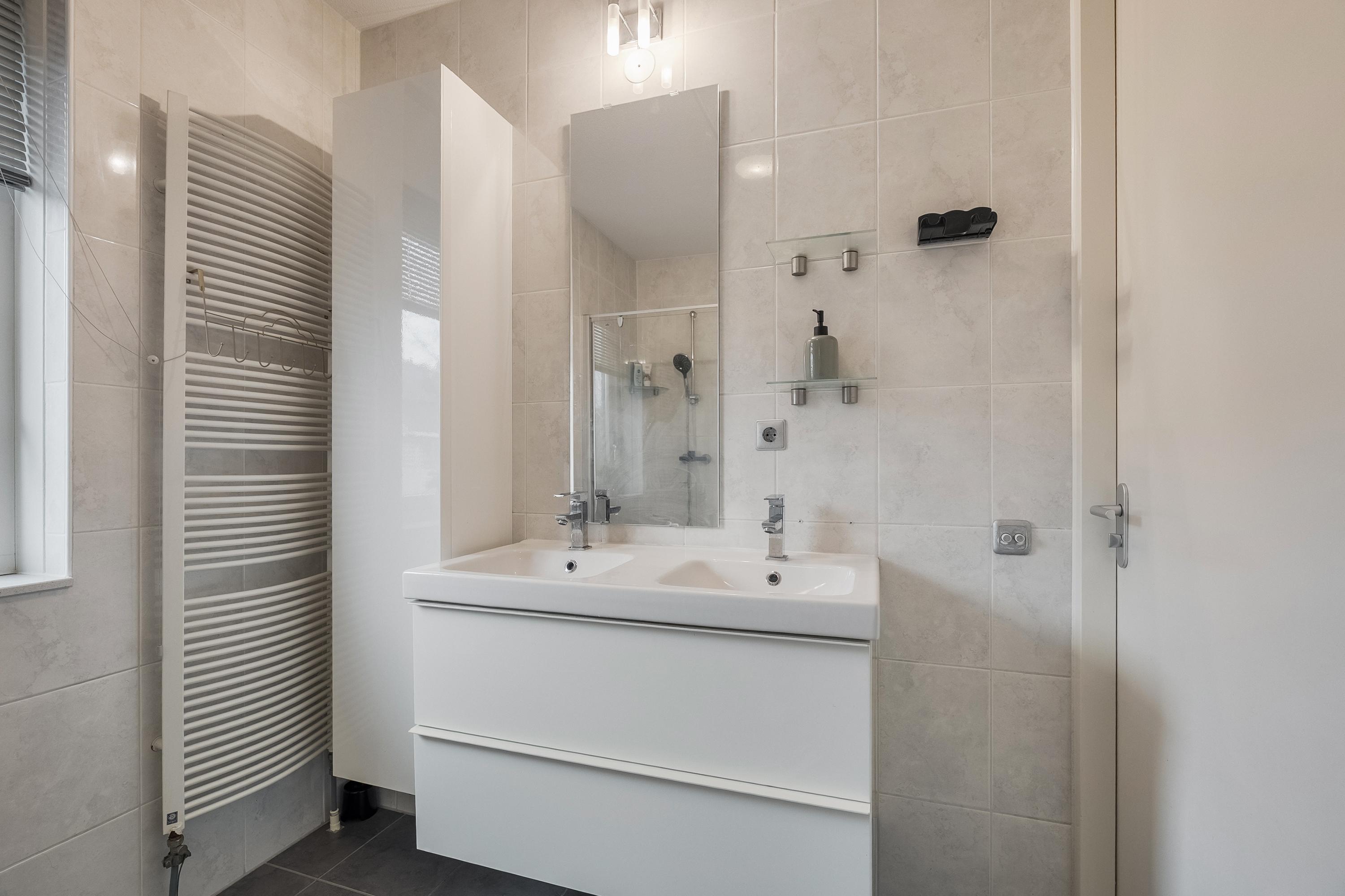 De moderne badkamer is compleet uitgevoerd met een douchecabine, radiator, hangend toilet en een dubbele wastafel met wandmeubel, spiegel en verlichting. De badkamer is volledig betegeld in een neutrale kleurstelling.