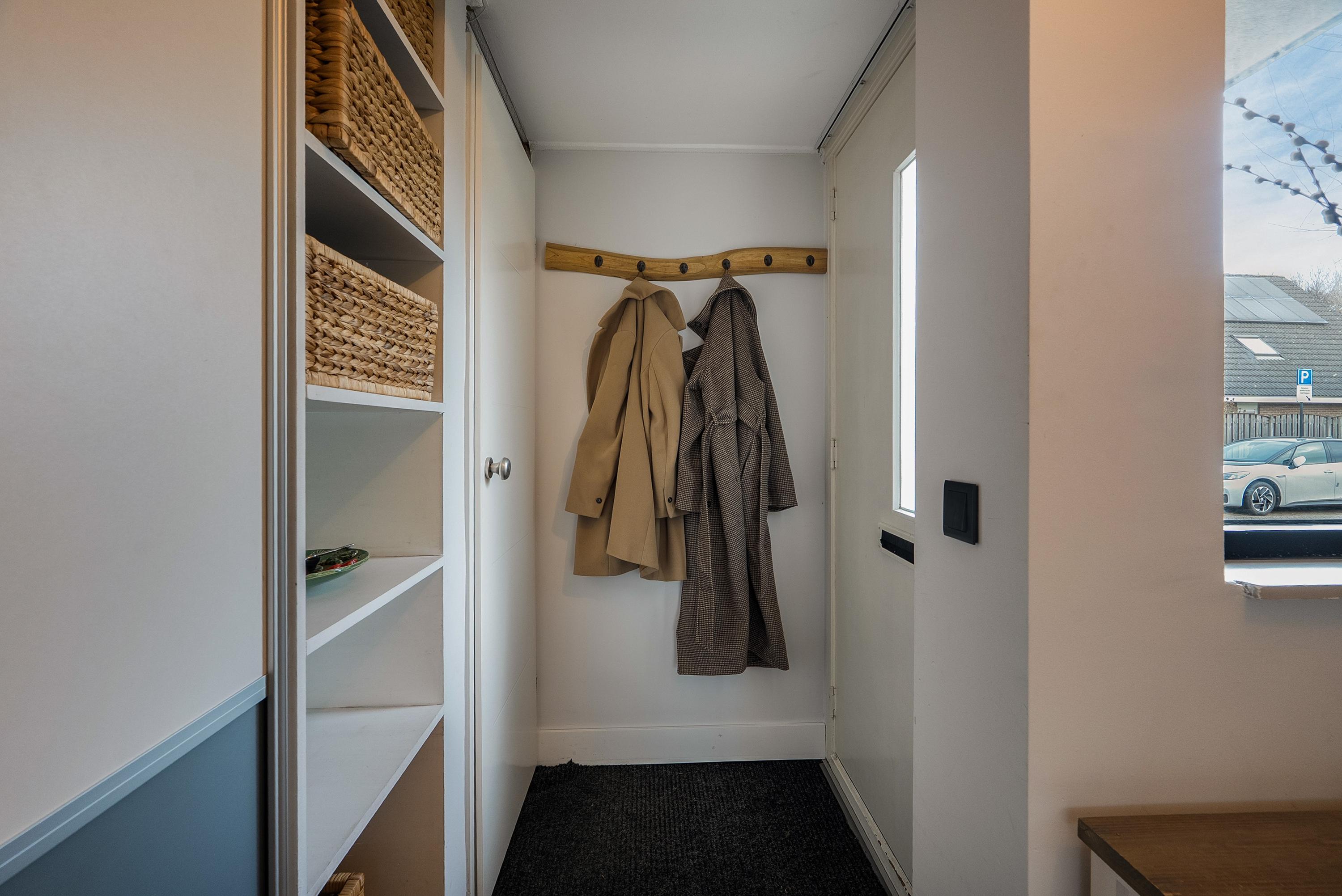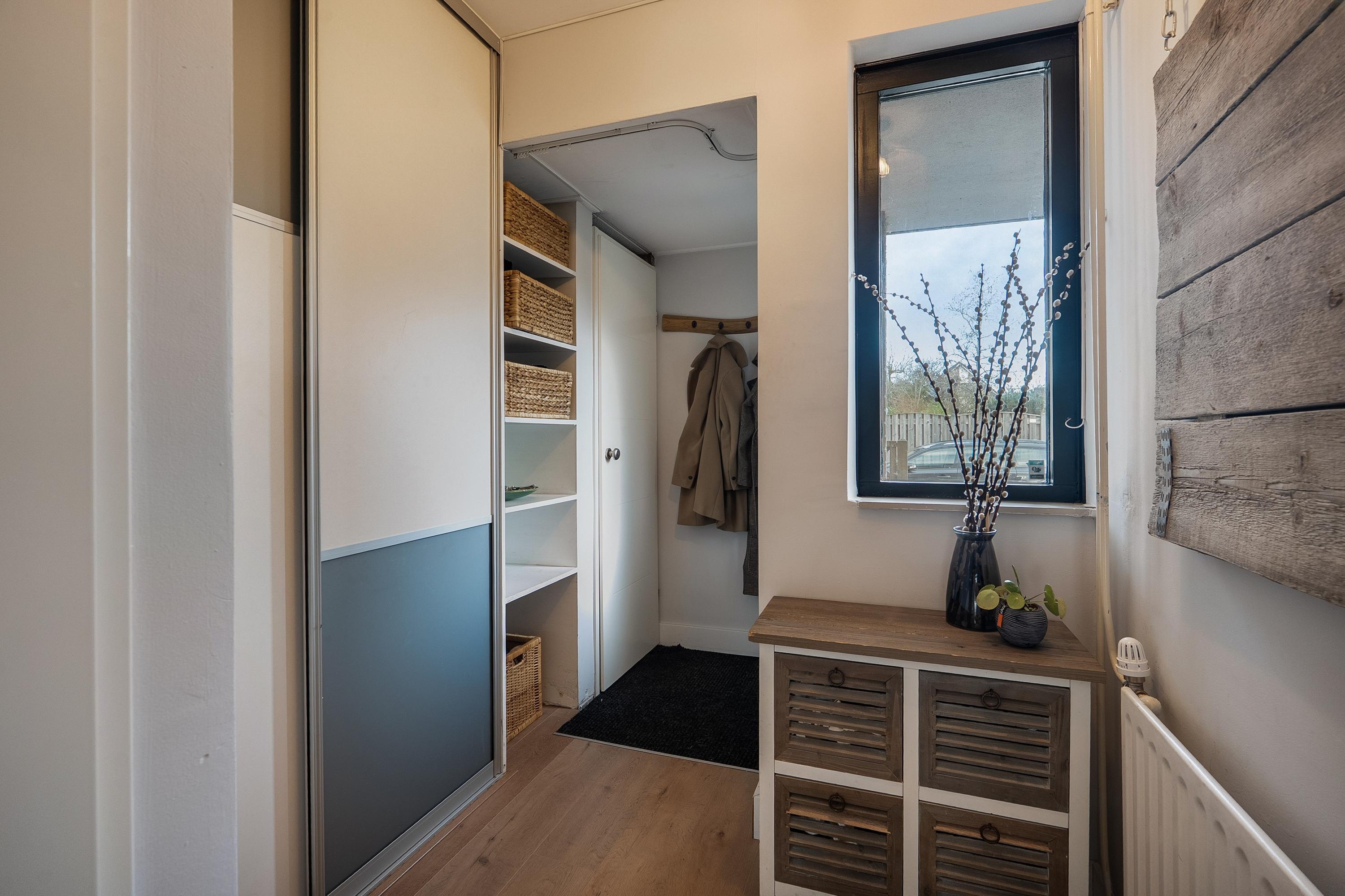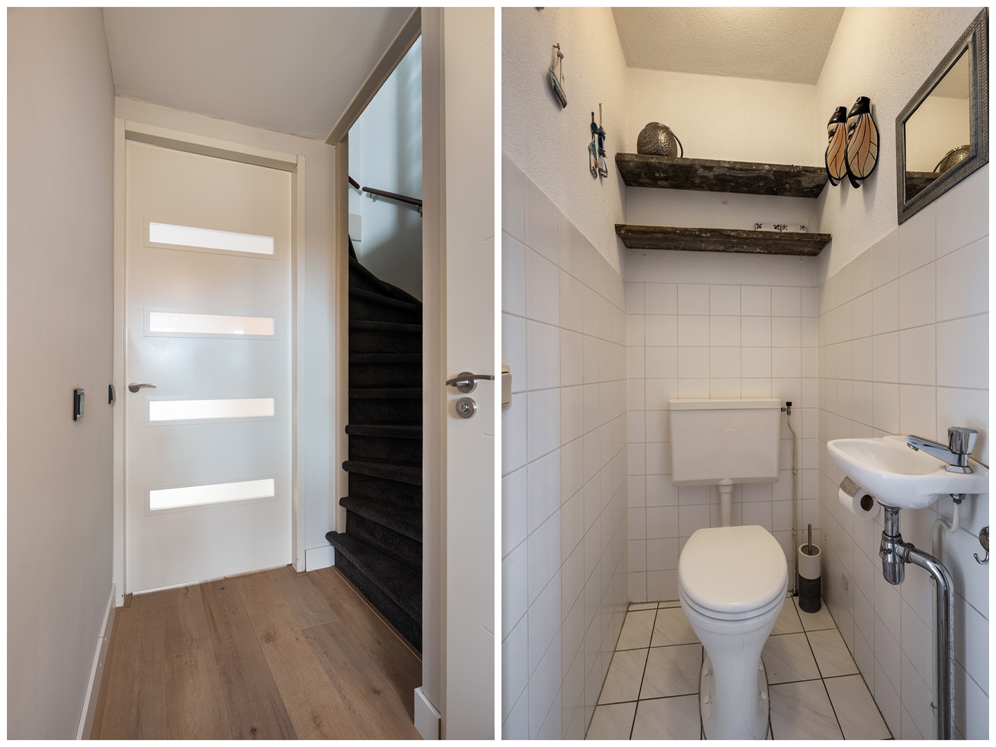 Entree, hal met meterkast en garderobe, trap naar de eerste verdieping, toiletruimte voorzien van een duoblok en fonteintje. De toiletruimte is gedeeltelijk betegeld in een lichte kleurstelling.