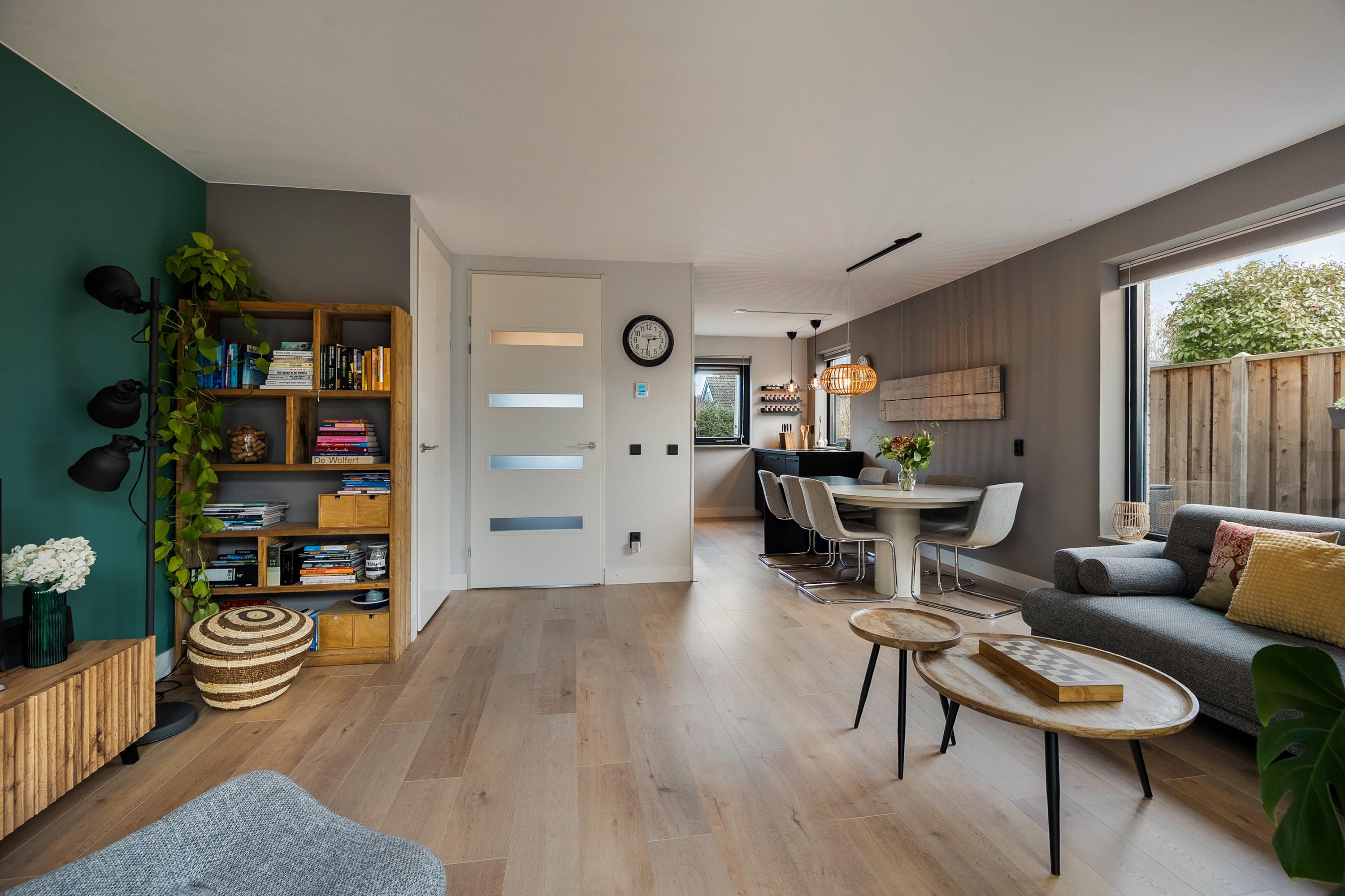 Lichte tuingerichte living (ca. 35 m2) voorzien van laminaatvloer met elektrische vloerverwarming en gestucte wanden en plafond. De woonkamer beschikt verder over een handige trapkast. Ideaal om te gebruiken als voorraadkast en/of extra bergruimte. De hoekligging, gecombineerd met de schuifpui aan de achterzijde, zorgt voor een uitzonderlijke lichtinval op de begane grond. Het natuurlijke licht stroomt overvloedig binnen en versterkt het ruimtelijke gevoel. Middels een schuifpui heeft u toegang tot de aangebouwde overkapping.