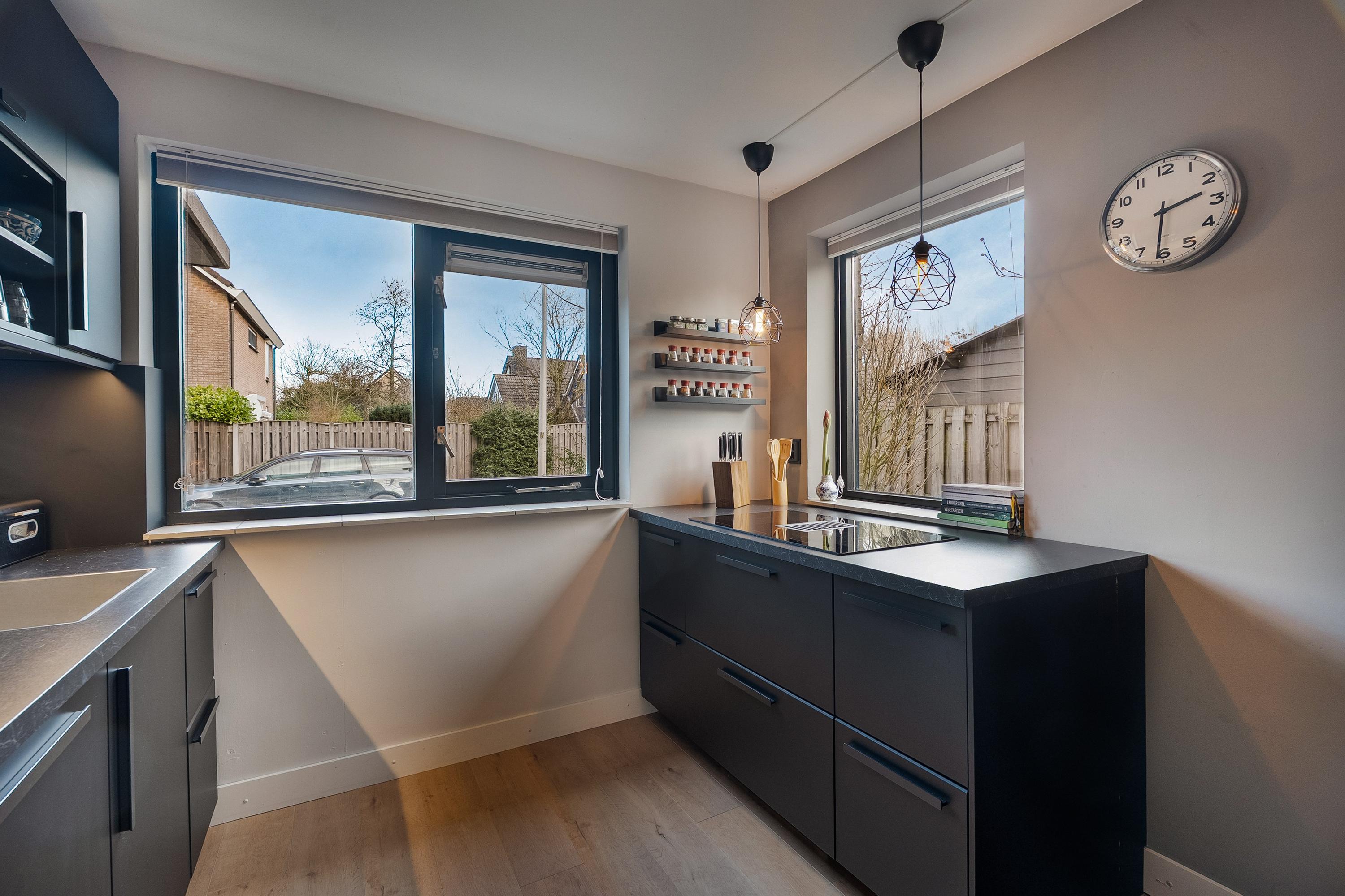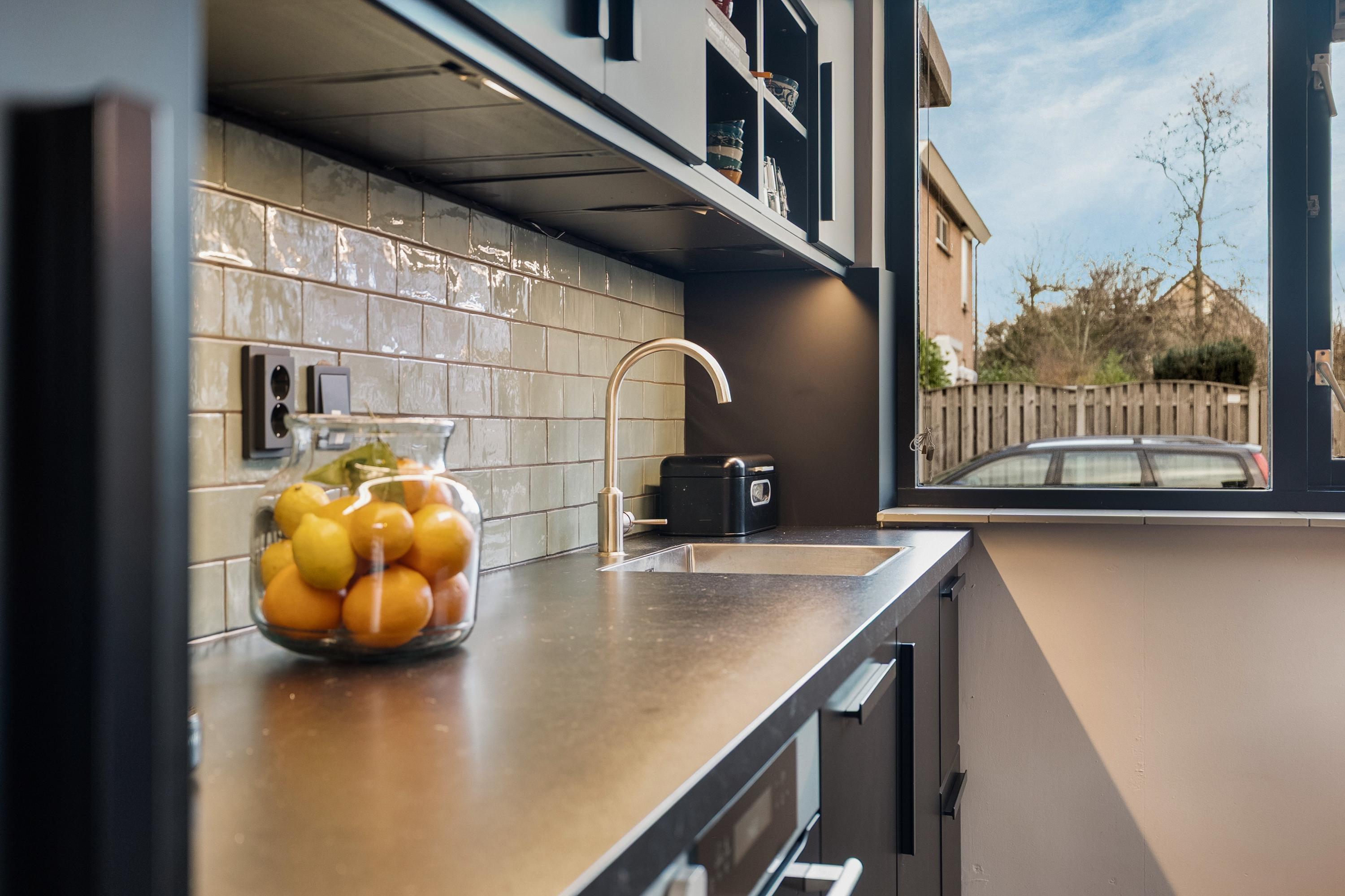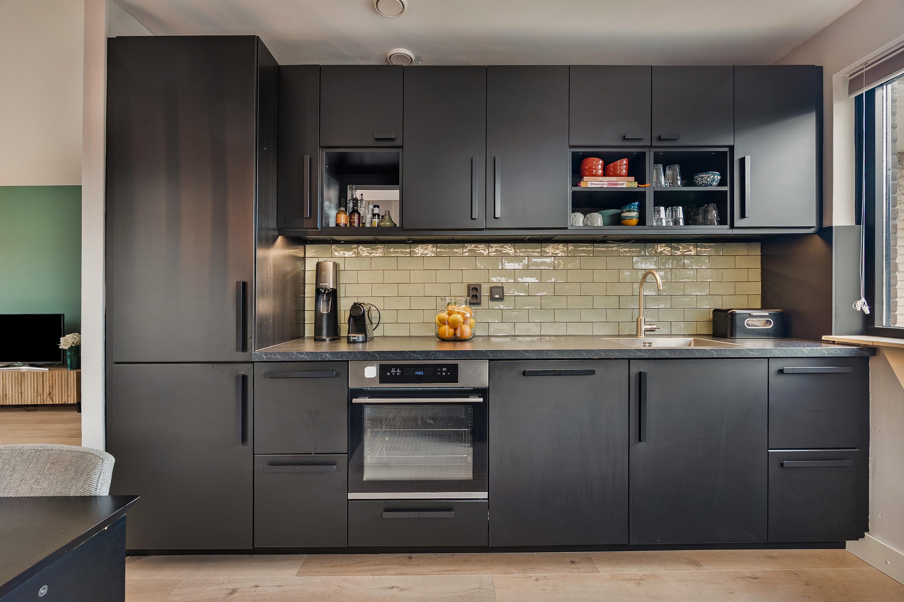De moderne open keuken is gelegen aan de voorzijde van de woning en is uitgevoerd in een rechte opstelling. De keuken is voorzien van diverse apparatuur zoals een koelkast, vrieskast, inductie kookplaat met ingebouwd afzuigsysteem, oven en een vaatwasser. Verder is de keuken voorzien van een enkele spoelbak en voldoende kastruimte. Het geheel is uitgevoerd in zwart en afgewerkt met een kunststof aanrechtblad en laminaatvloer met elektrische vloerverwarming.