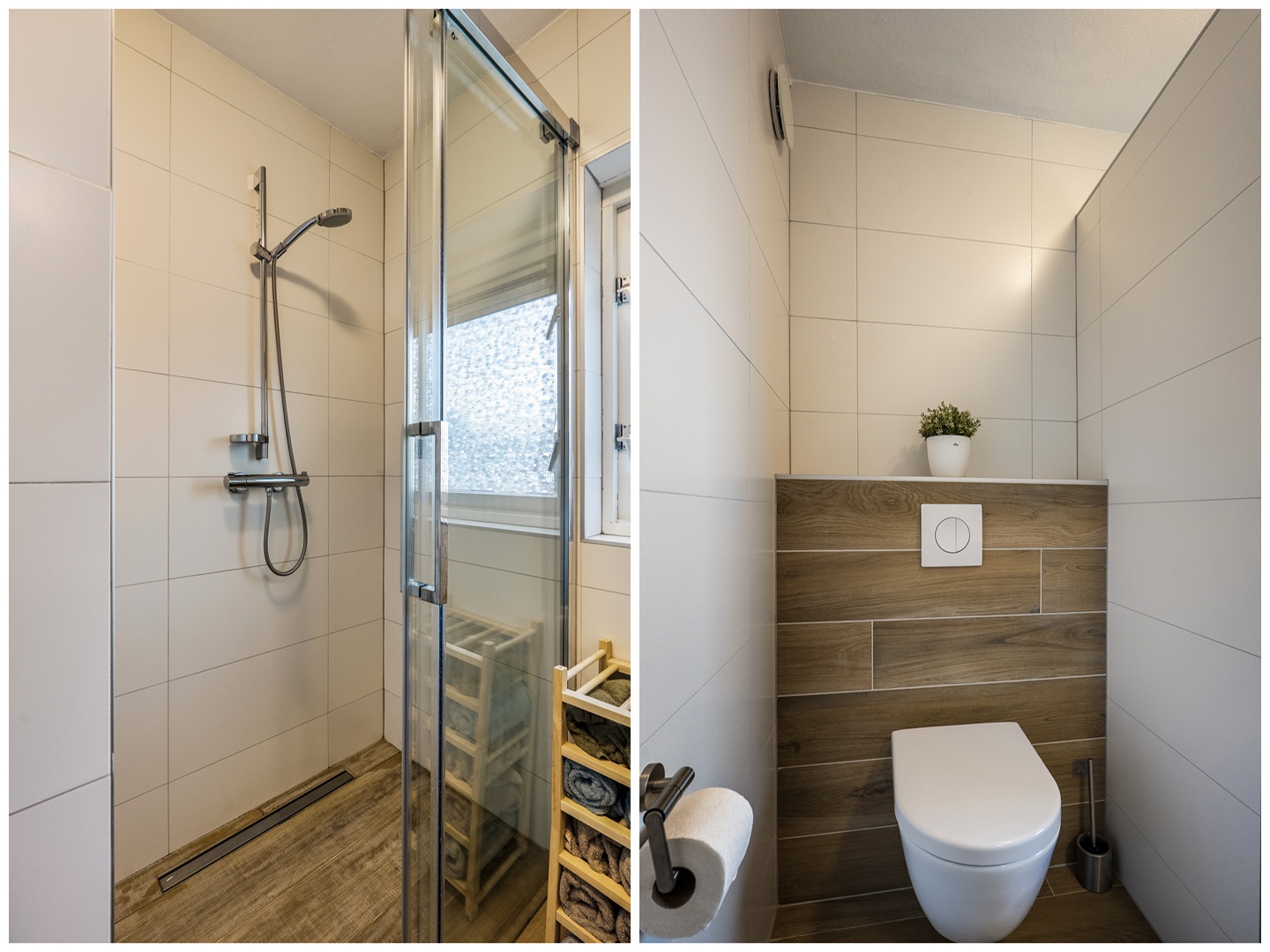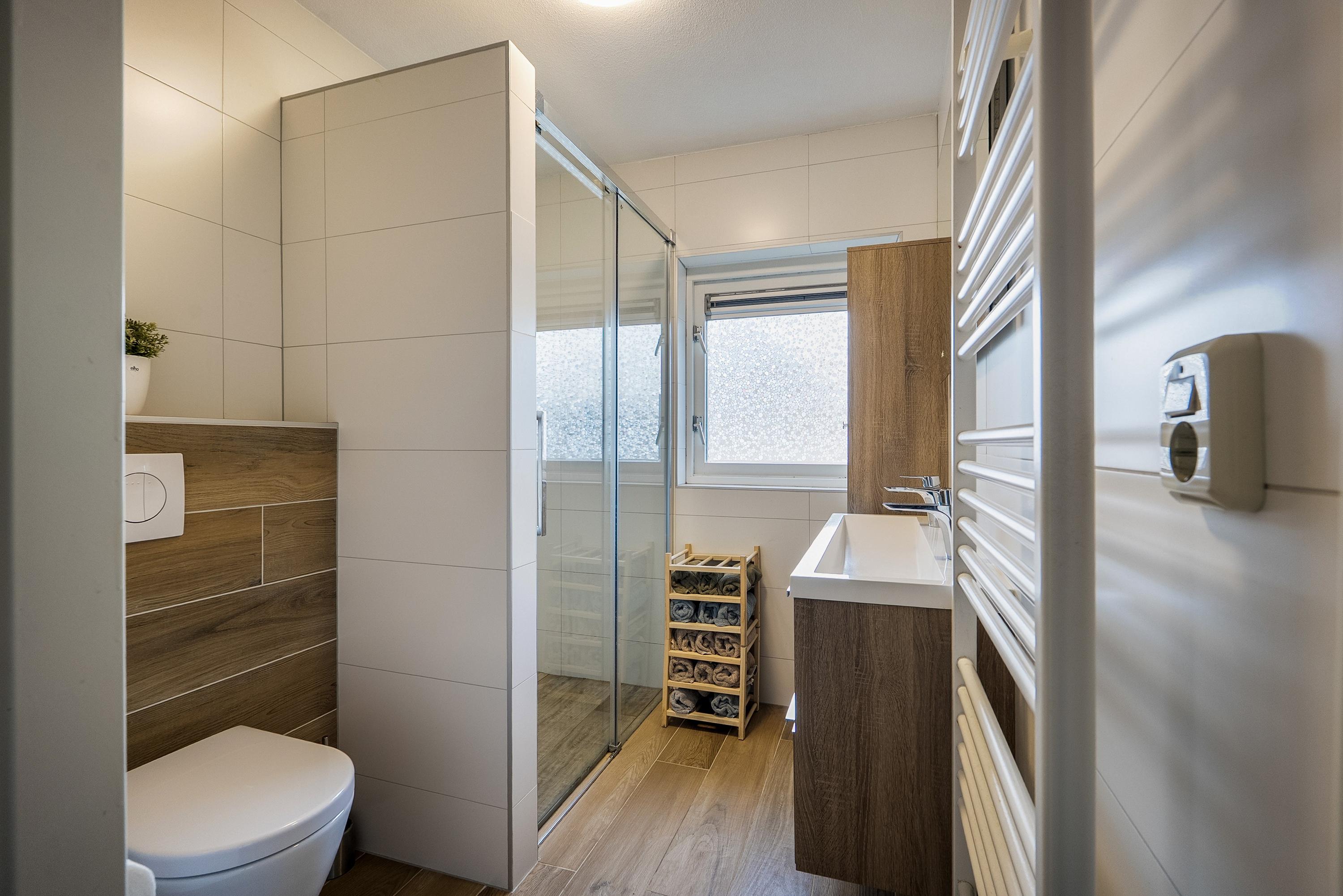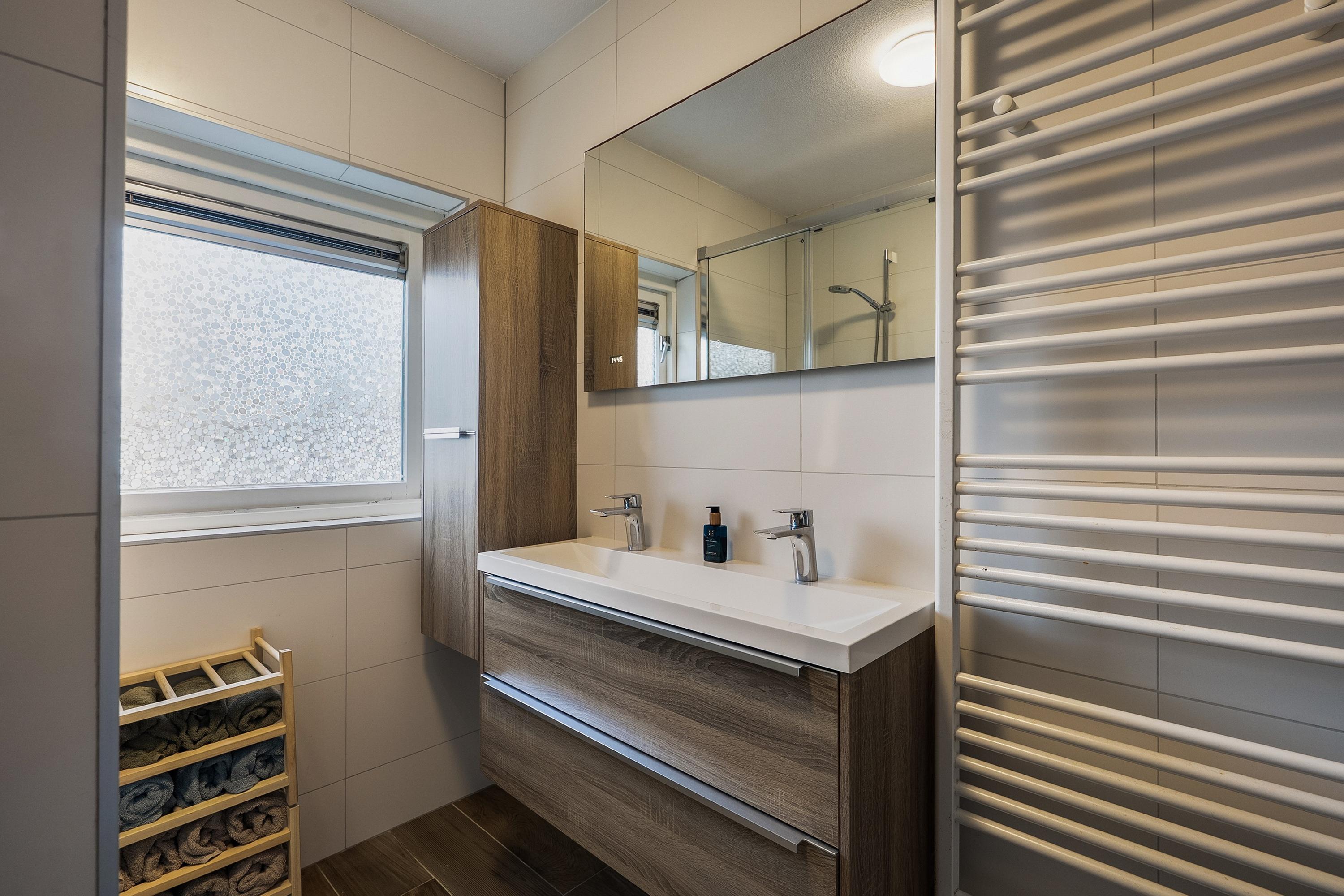 Moderne badkamer (ca. 4 m2) met sanitaire voorzieningen zoals dubbele wastafel met wastafelmeubel, spiegel, verlichting, hangcloset, inloopdouche en een designradiator. De badkamer is geheel betegeld en afgewerkt met houtlook tegelvloer.