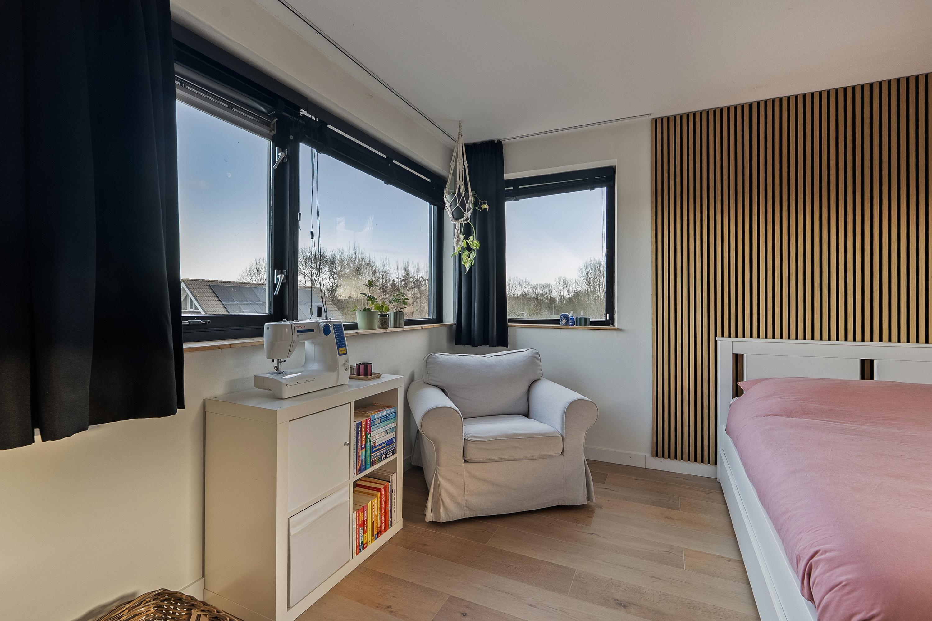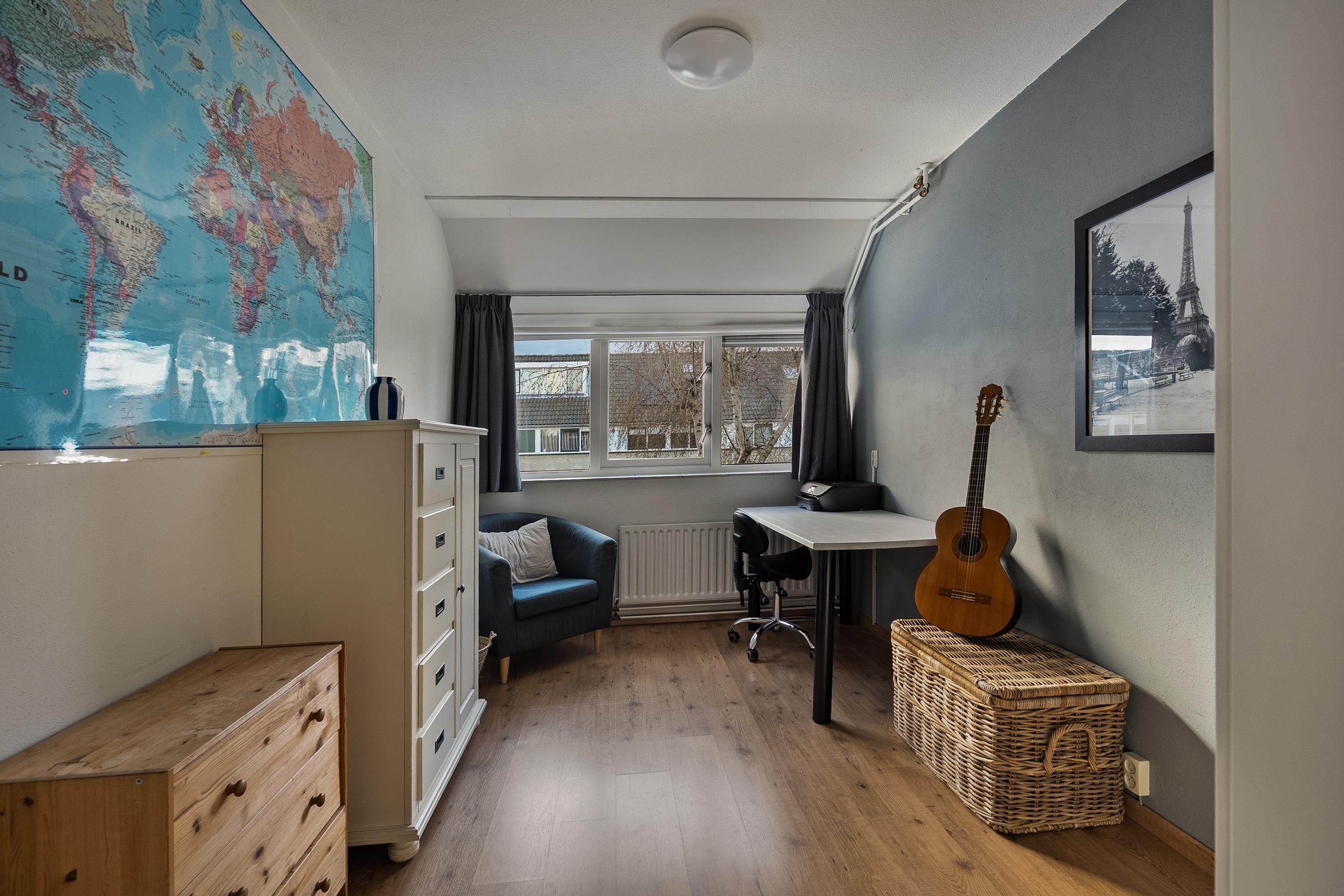 Slaapkamer 4 (ca. 18 m2) is voorzien van een Velux dakraam met hor en verduisterend gordijn, laminaatvloer, een vaste kast en bergruimte achter het knieschot.
