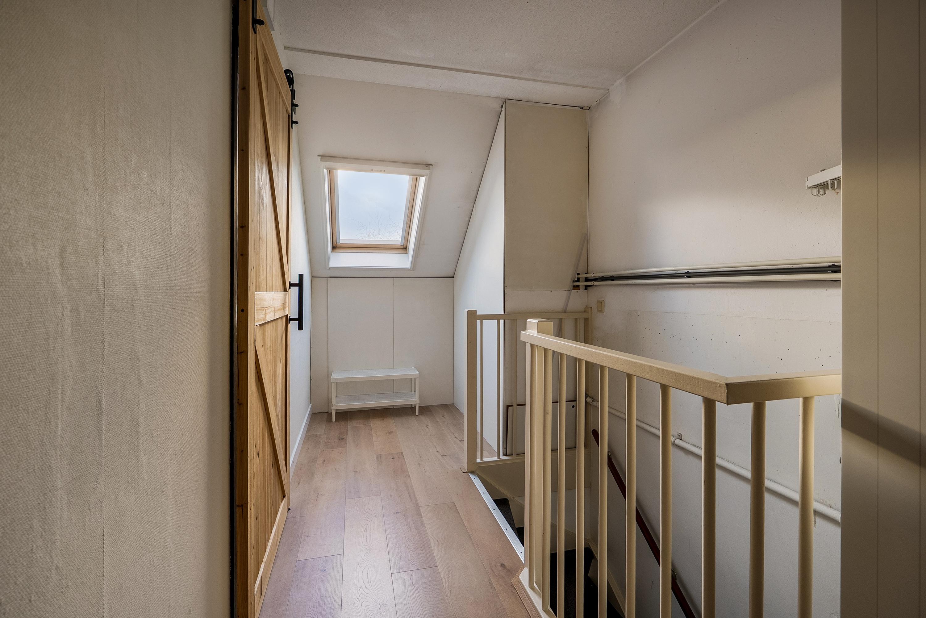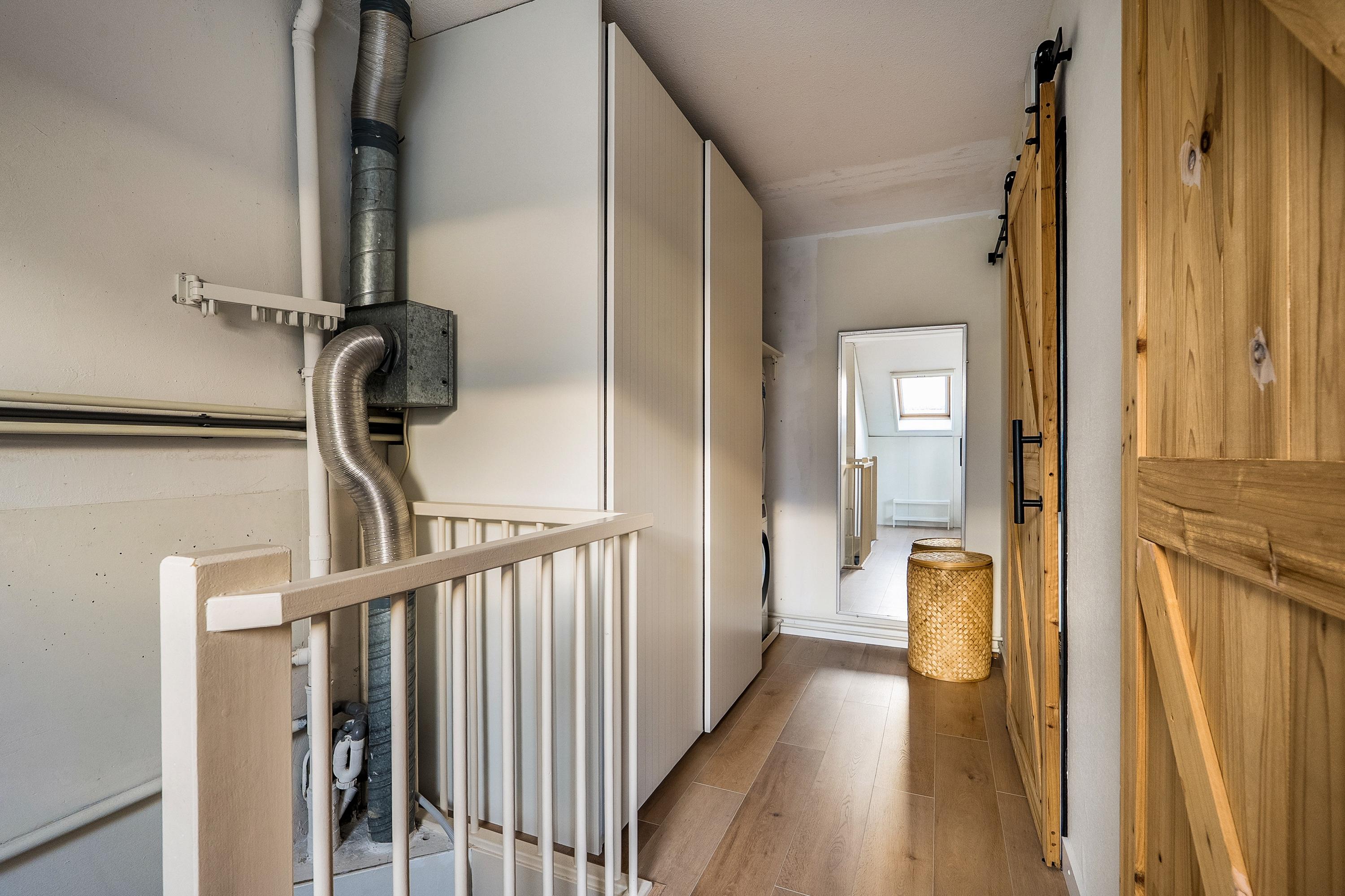 Voorzolder met stelplaats voor de HR C.V. combiketel (Remeha 2022), omvormer voor de 12 zonnepanelen, mechanisch ventilatie systeem, wasmachine- en drogeraansluiting, bergruimte achter het knieschot en een Velux dakraam met hor en verduisterend gordijn. Dankzij het dakraam beschikt de voorzolder over een aangename natuurlijke lichtinval. Middels twee schuifdeuren heeft u toegang tot de slaapkamer 4.