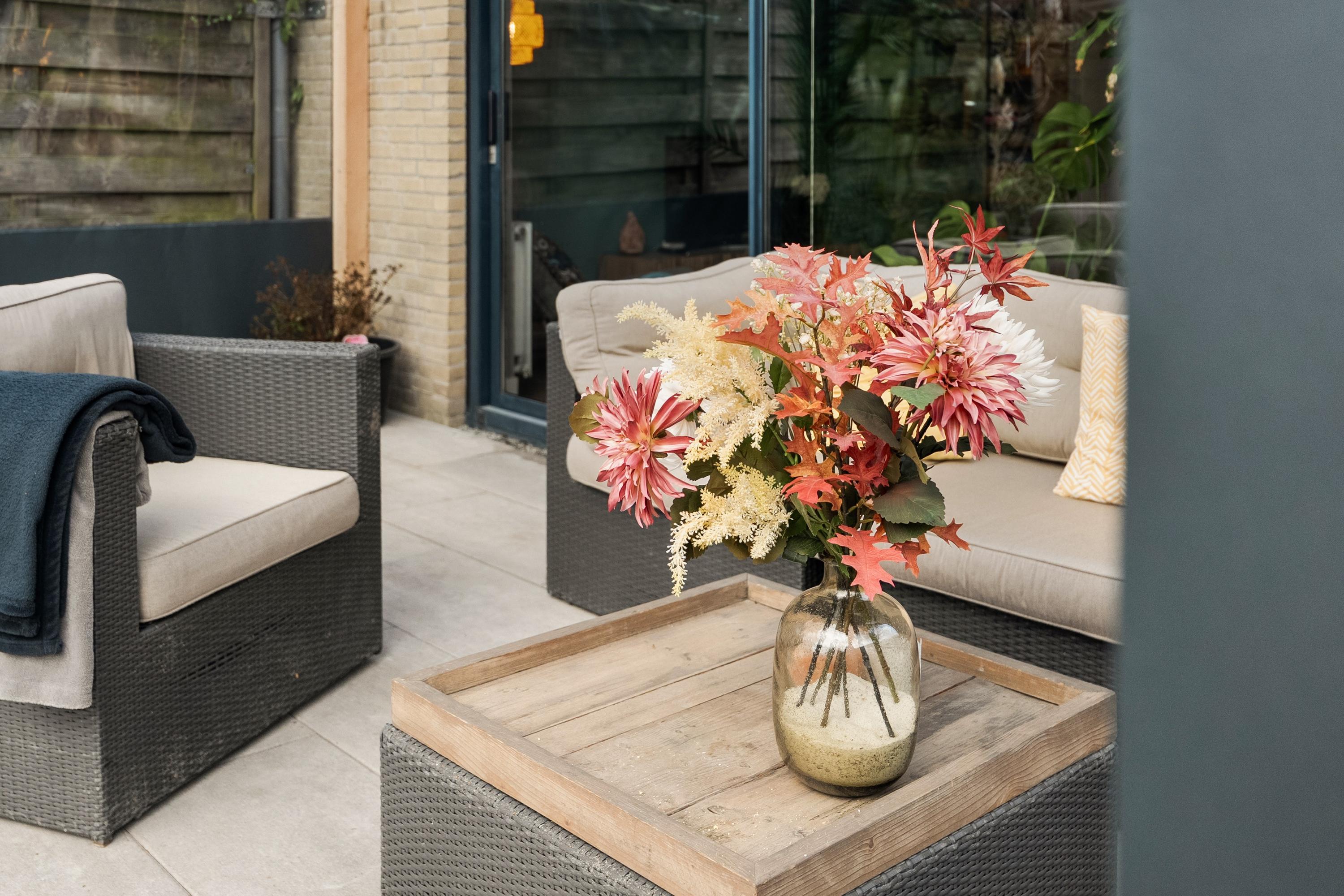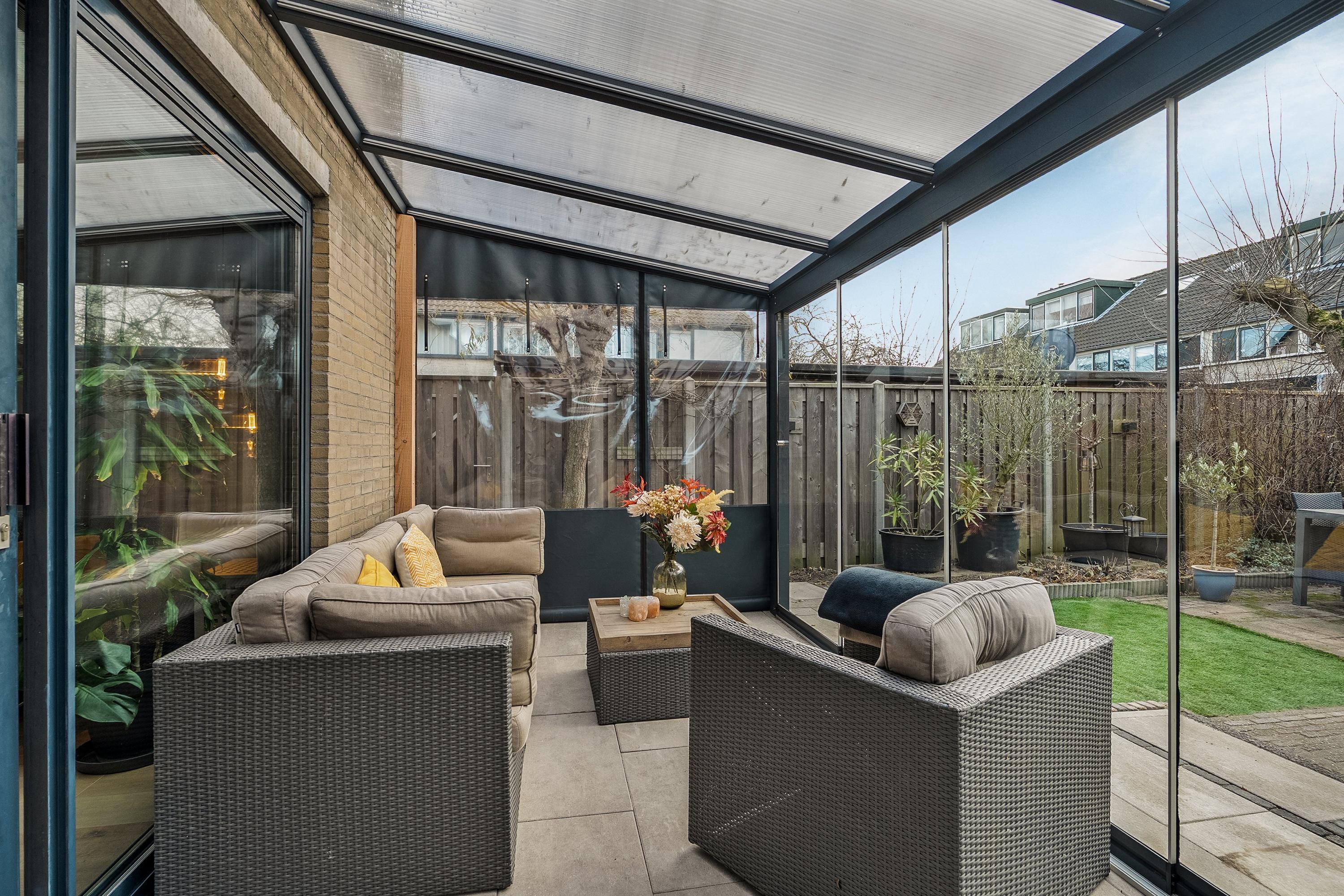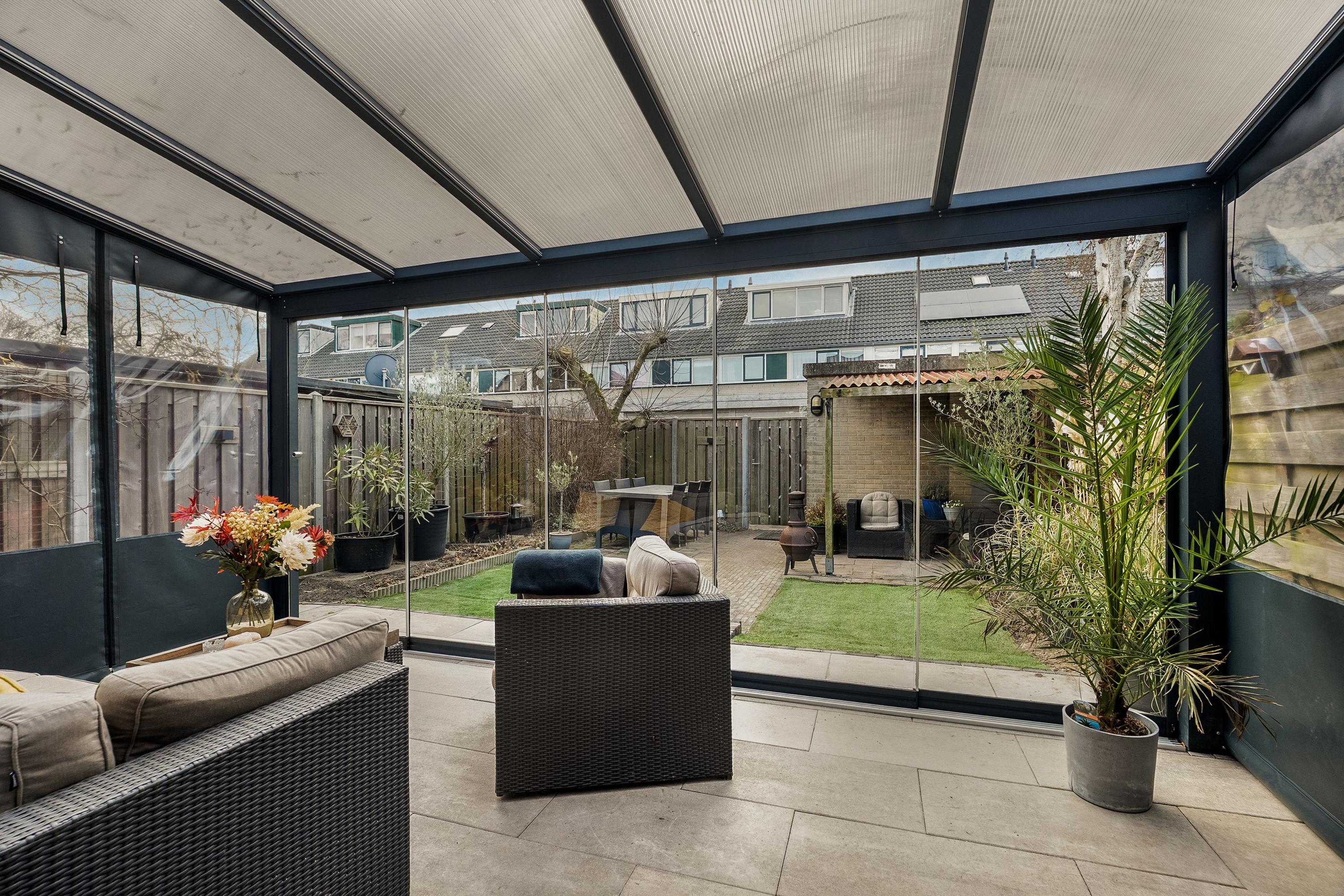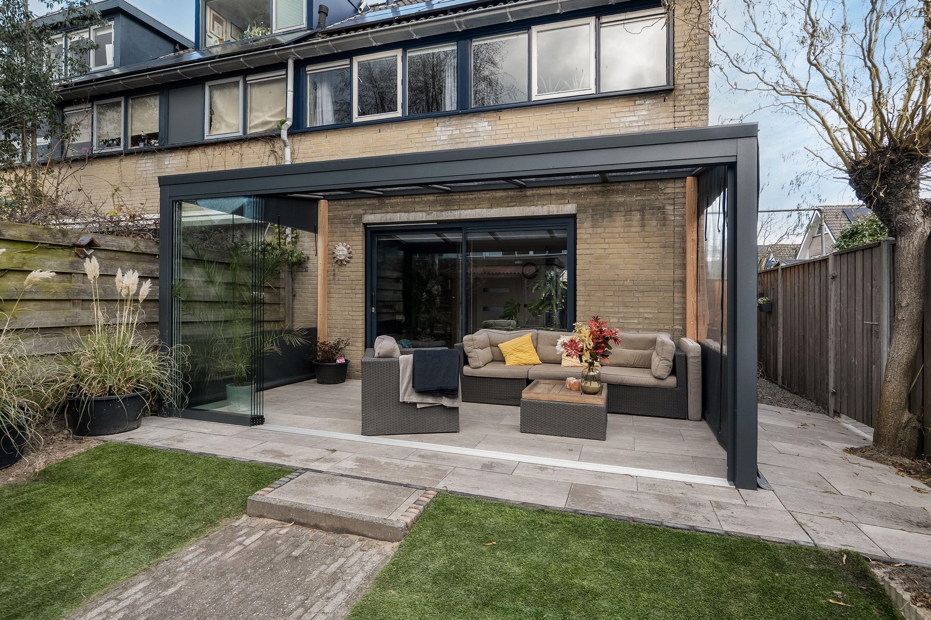 De aangebouwde aluminium overkapping (ca. 12 m2) is afgewerkt met vijf glazen schuifdeuren. Deze schuifdeuren kunnen eenvoudig worden geopend, waardoor de ruimte zowel open als gesloten gebruikt kan worden. Hierdoor benut u de ruimte niet alleen in de zomer, maar ook bij koeler of winderig weer.