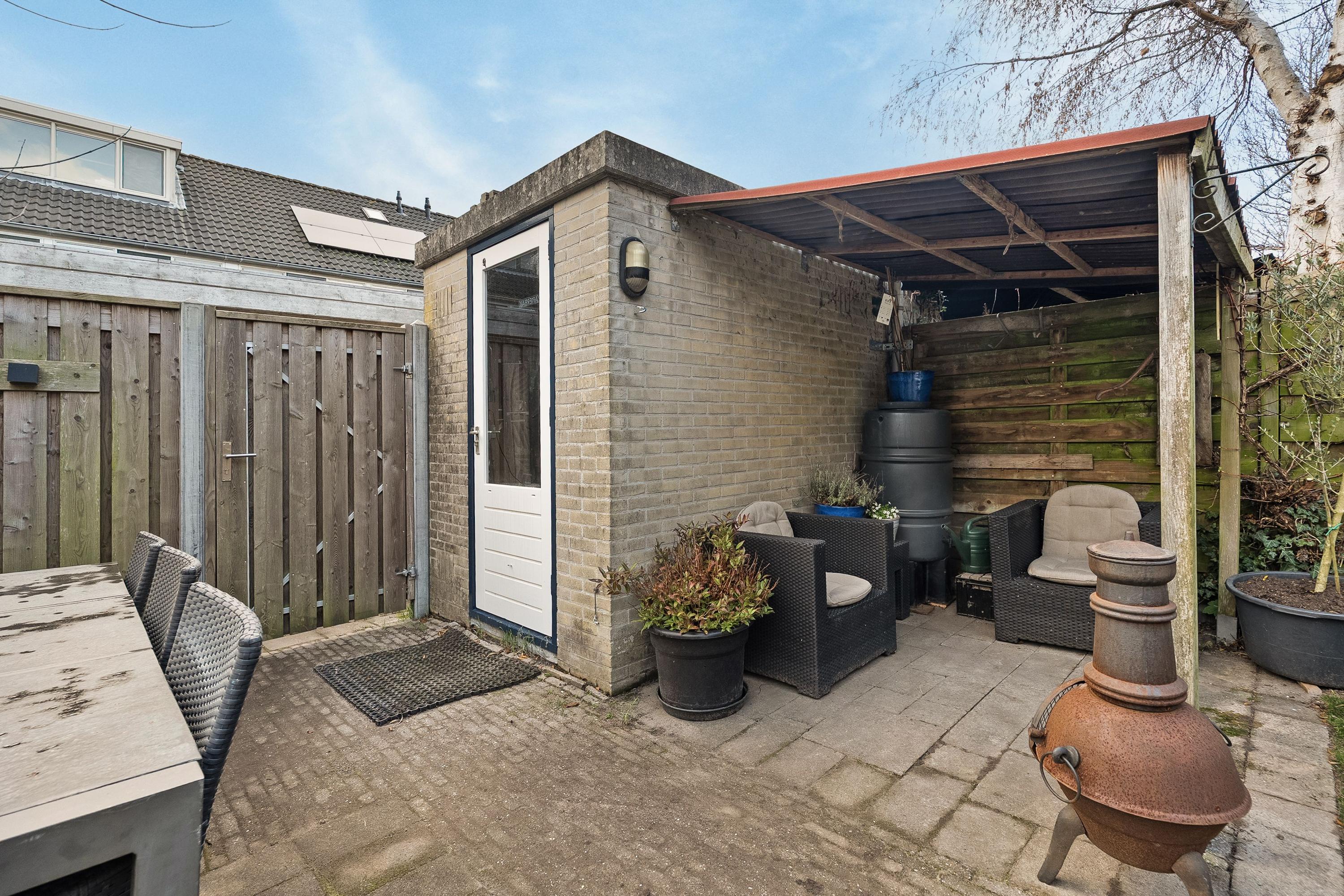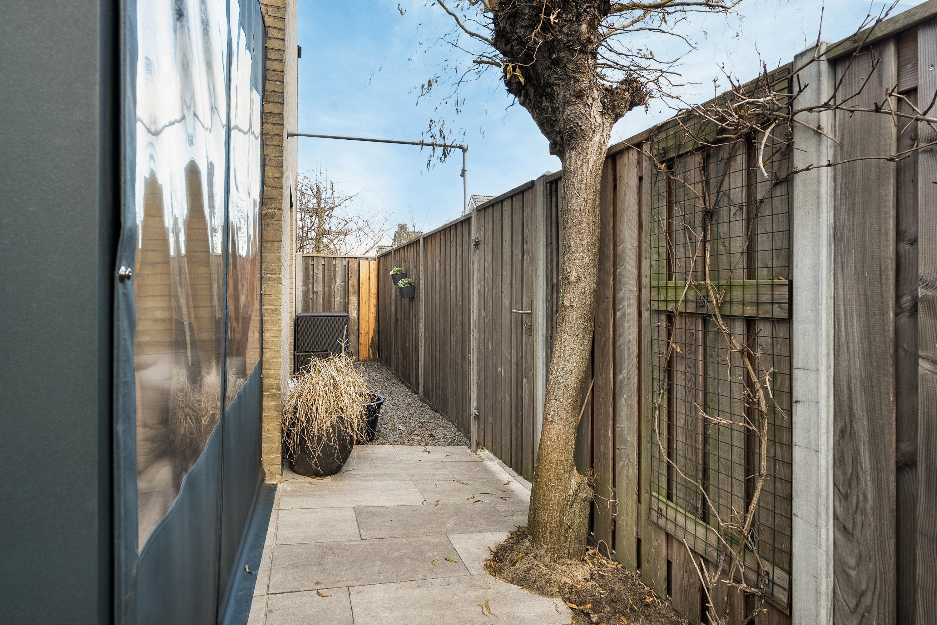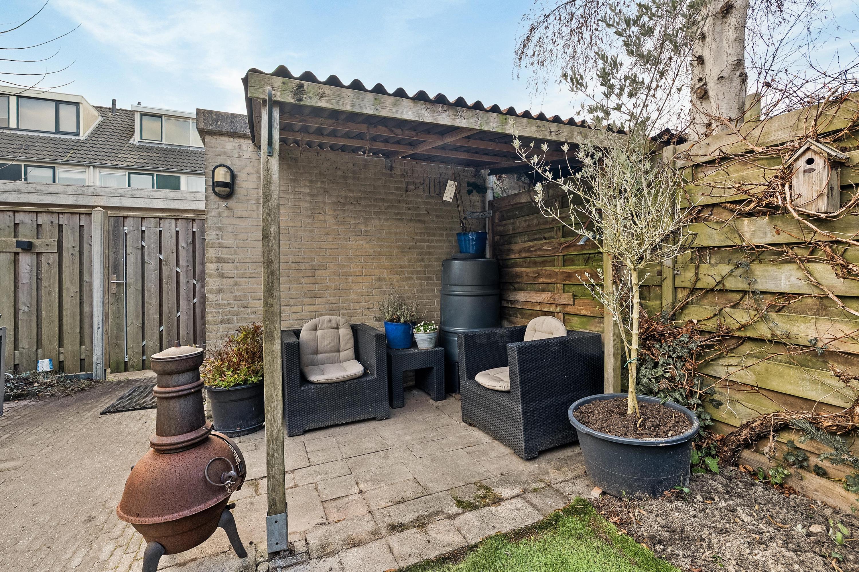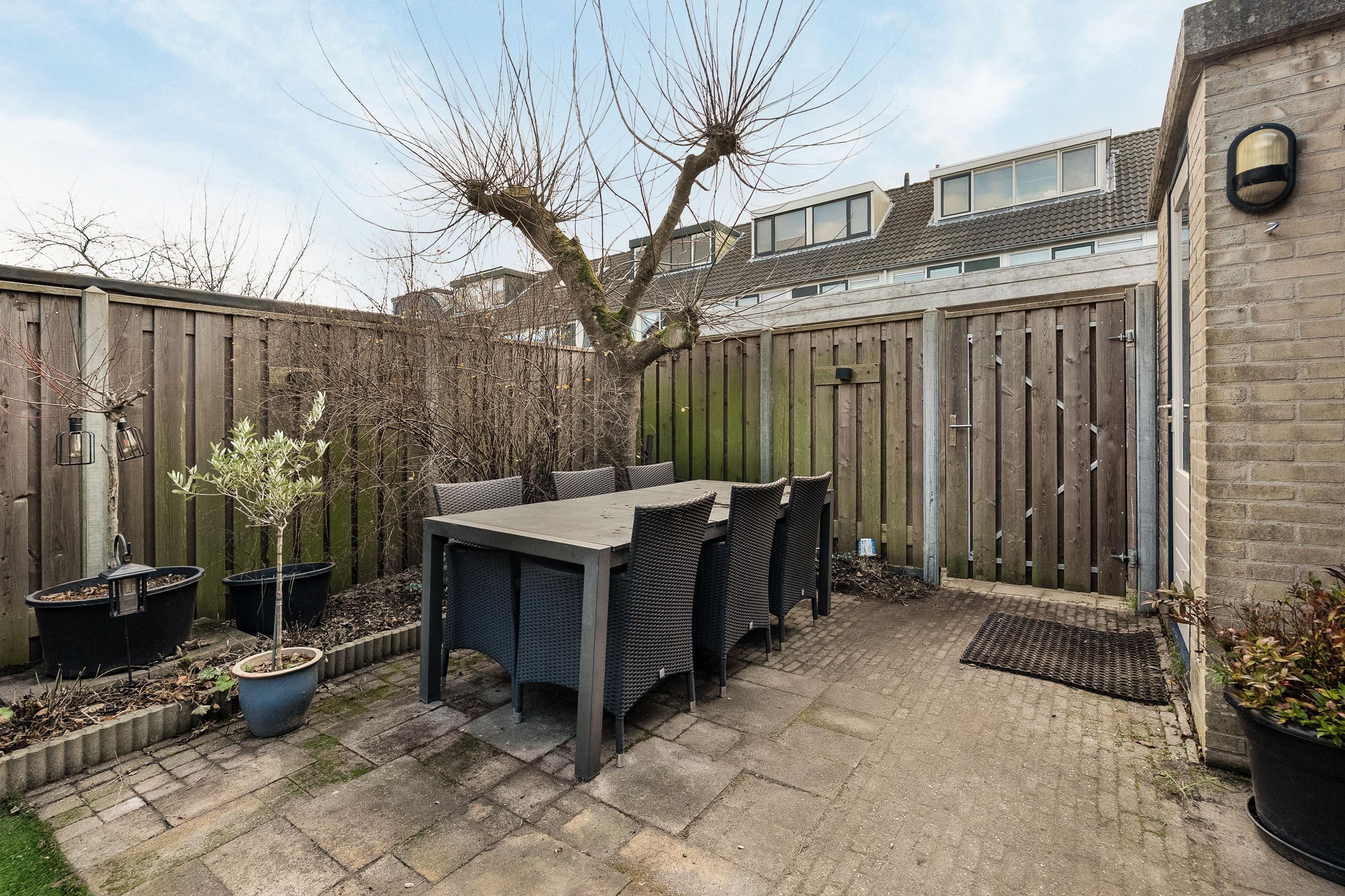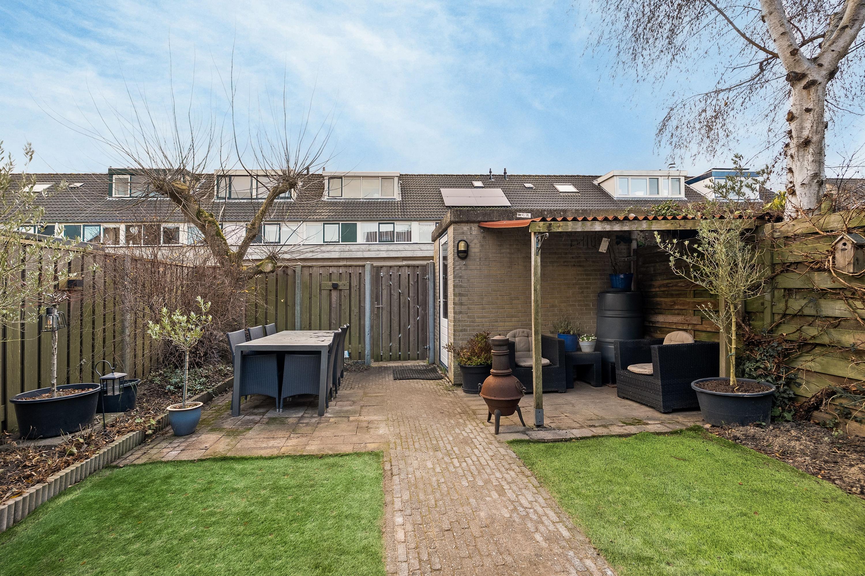 De diepe achtertuin is gelegen op het zuidwesten. Ideaal voor lange zomeravonden in de tuin. Verder beschikt de achtertuin over twee achteroms, kunstgras, verlichting, een regenton, een ruime berging en een gezellige overkapping.