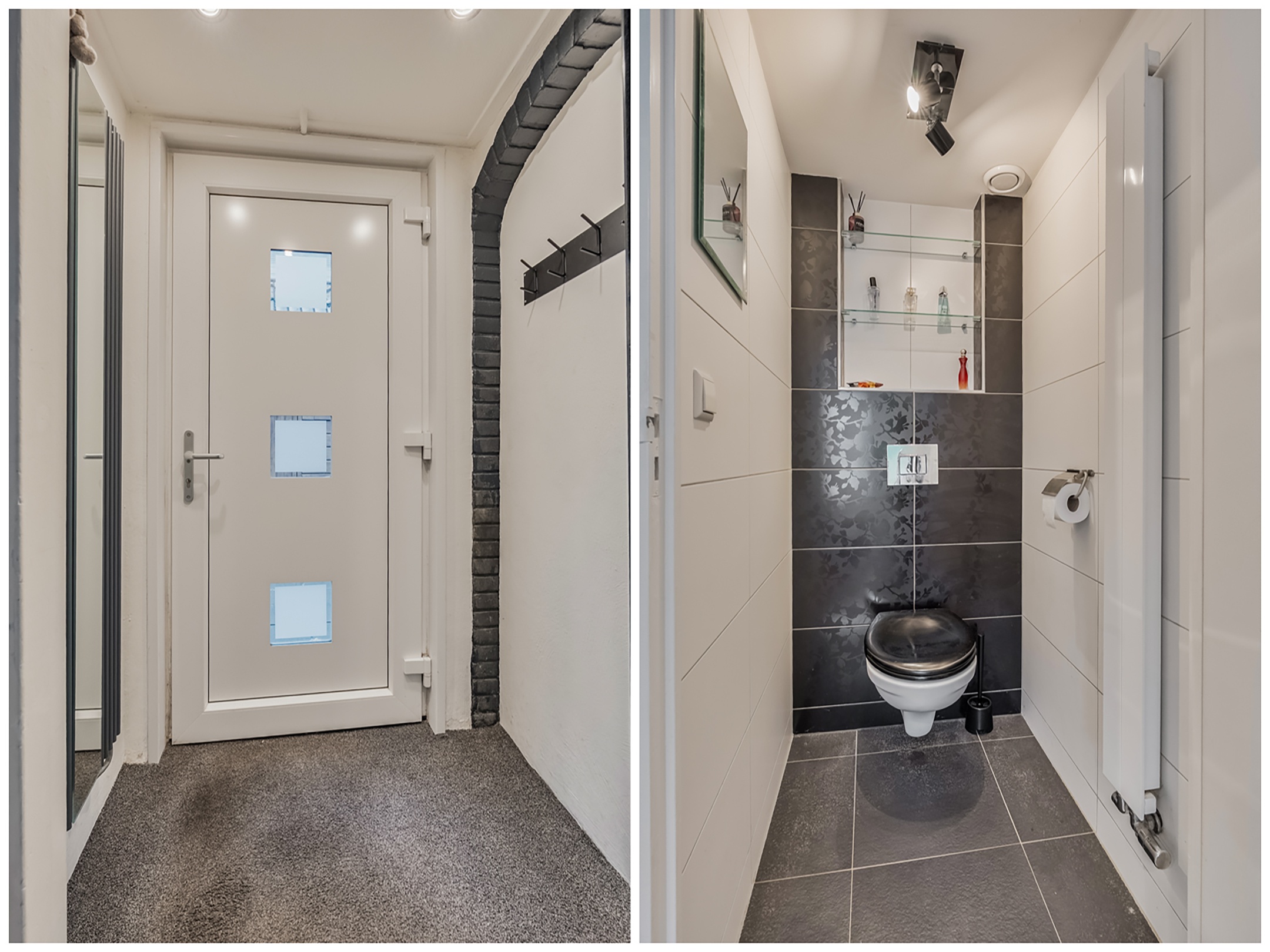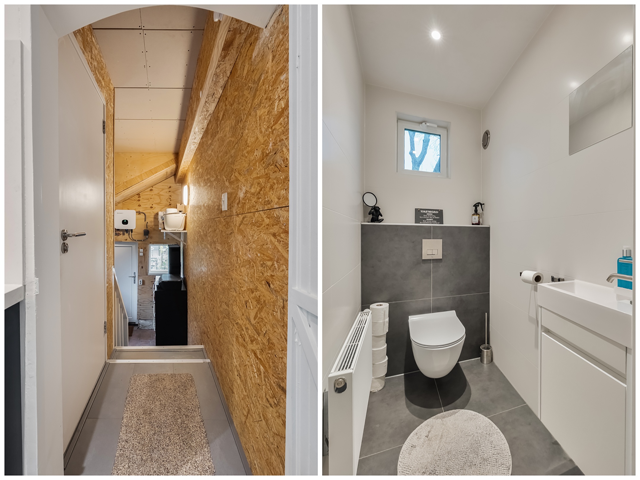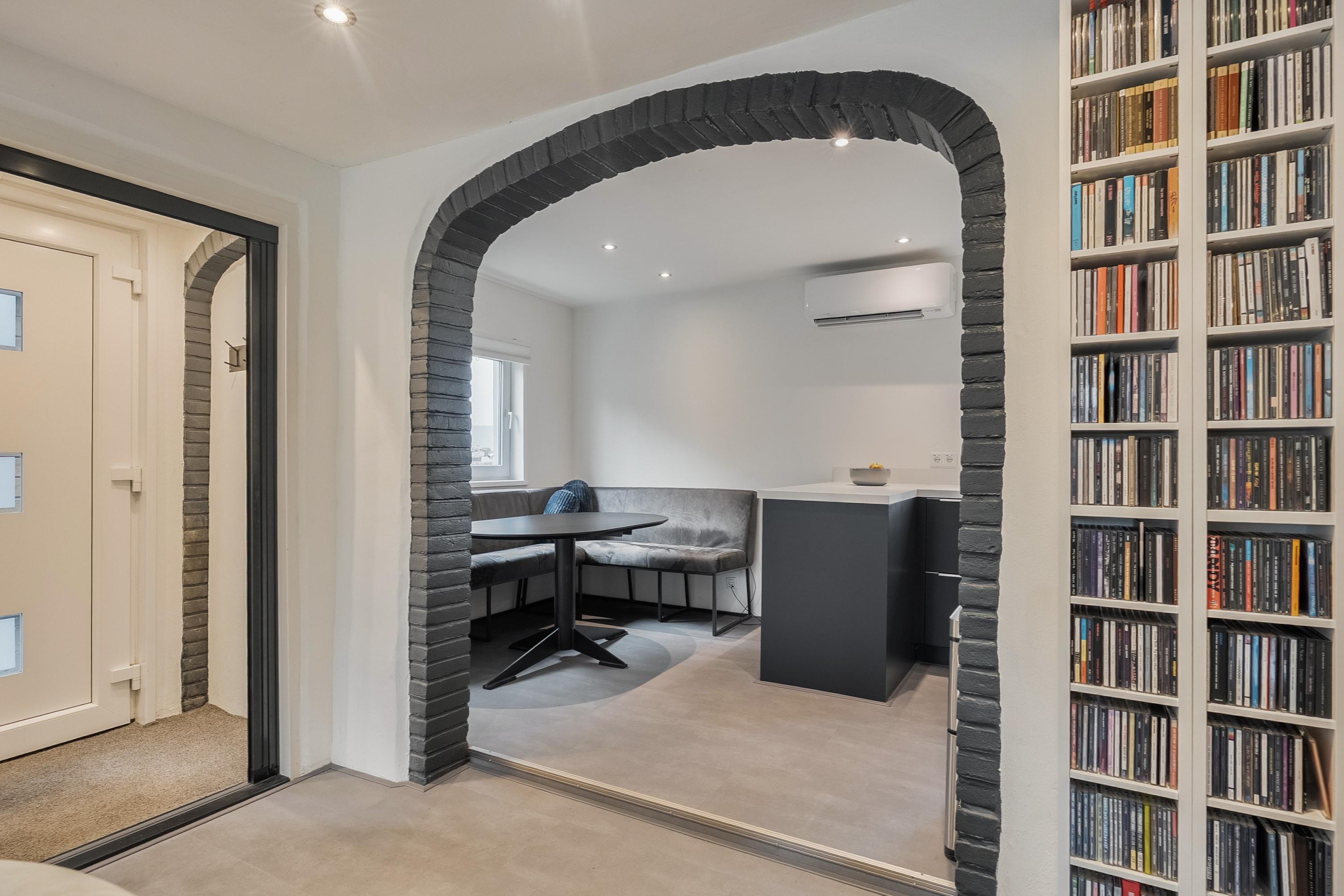 Vanuit de keuken loop je naar het halletje waar zich het toilet bevindt. Via de trap naar beneden kom je in de bijkeuken: een ideale plek voor de airfryer, maar ook de ruimte waar de wasmachine en droger staan opgesteld en waar de cv-ketel is geïnstalleerd. Ook treffen we hier de omvormer voor de zonnepanelen en de toegang tot de tuin.
