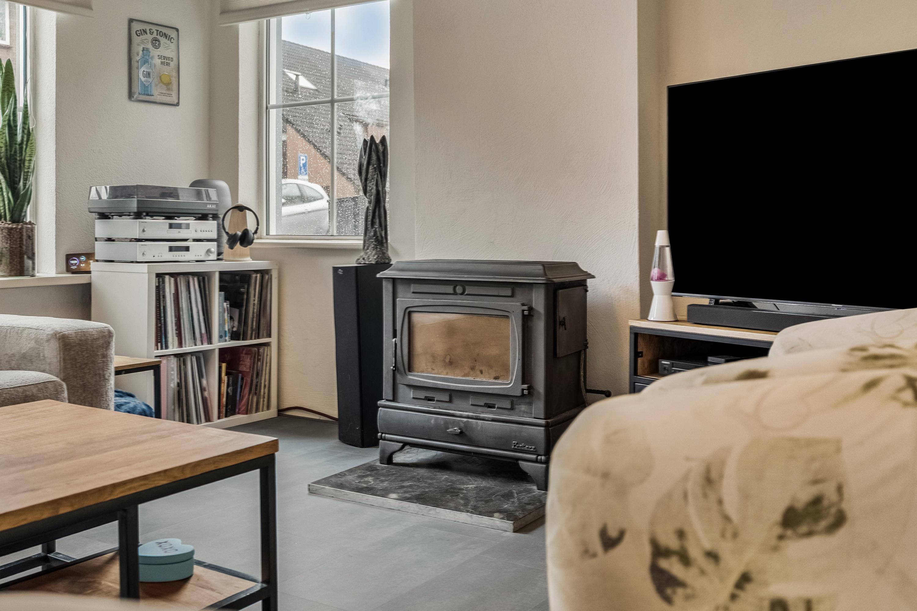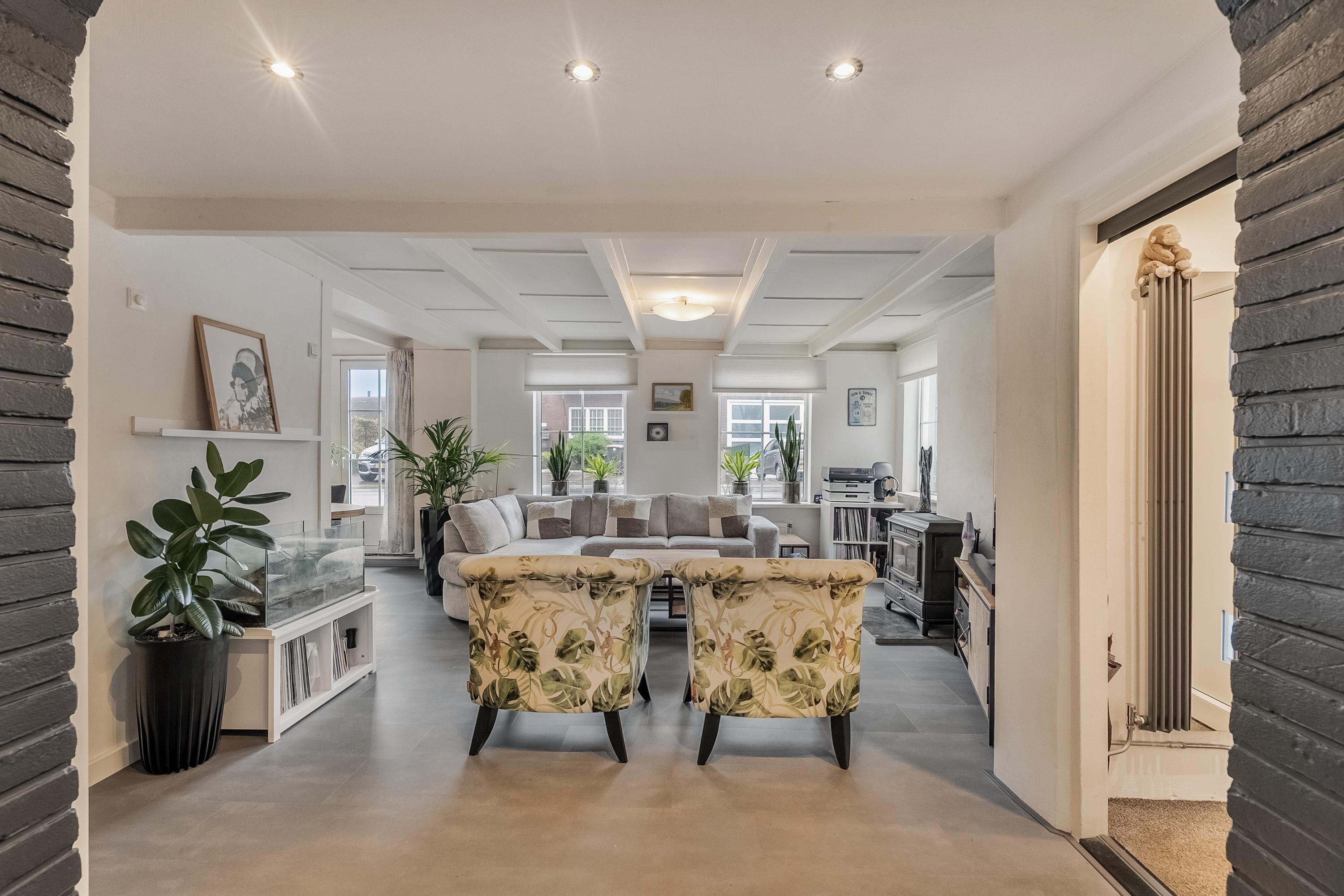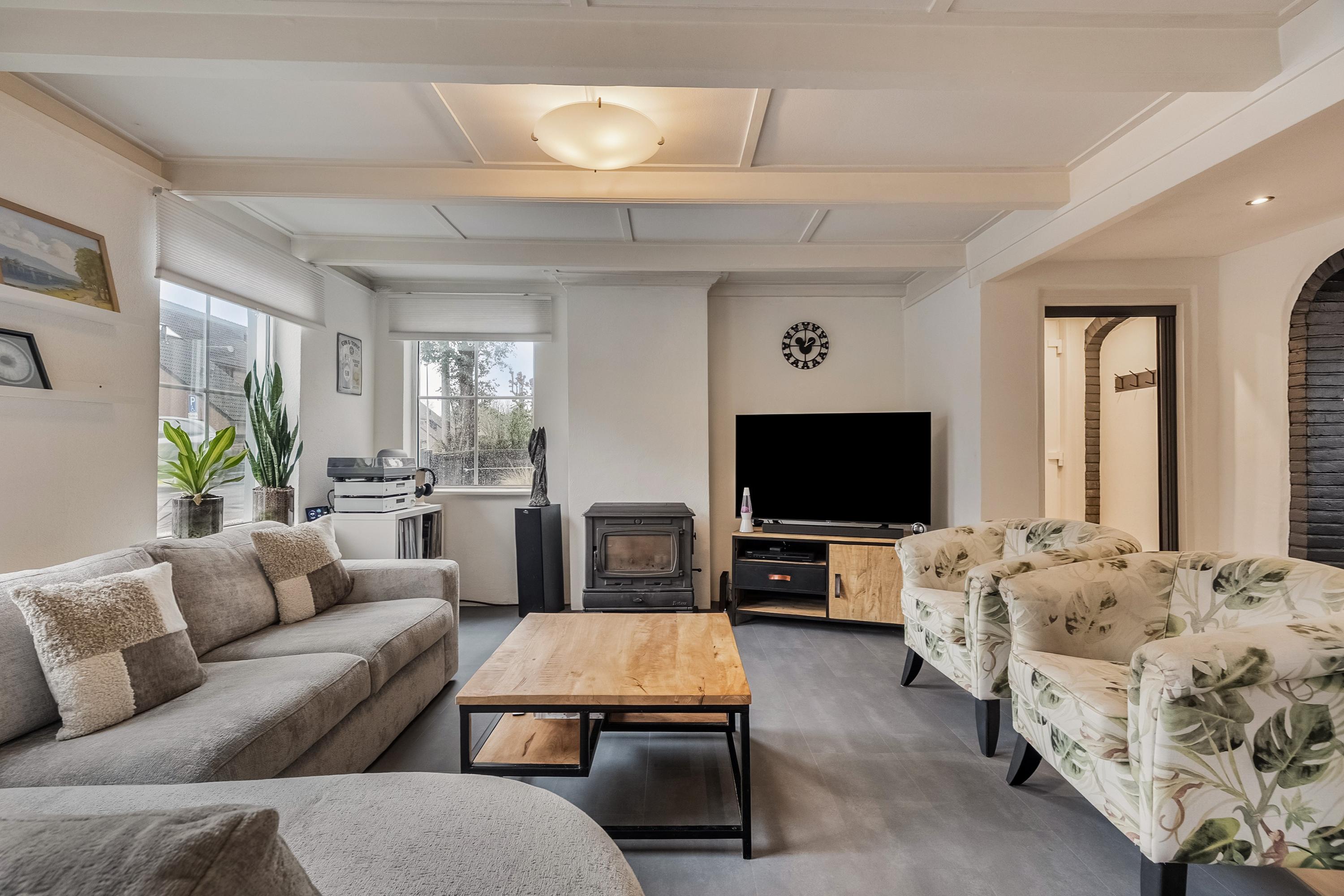 Een ontzettend sfeervolle ruimte: het balkenplafond geeft veel charme en ook het profiel in de ramen draagt bij aan de authentieke sfeer. Je staat hier direct in de zithoek – een fijne plek om een boek te lezen, muziek te luisteren of gewoon even rustig tv te kijken bij de haard. Grenzend aan de zithoek bevindt zich de eethoek, waar eenvoudig een grote eettafel past om met 6 tot 8 personen uitgebreid te tafelen.