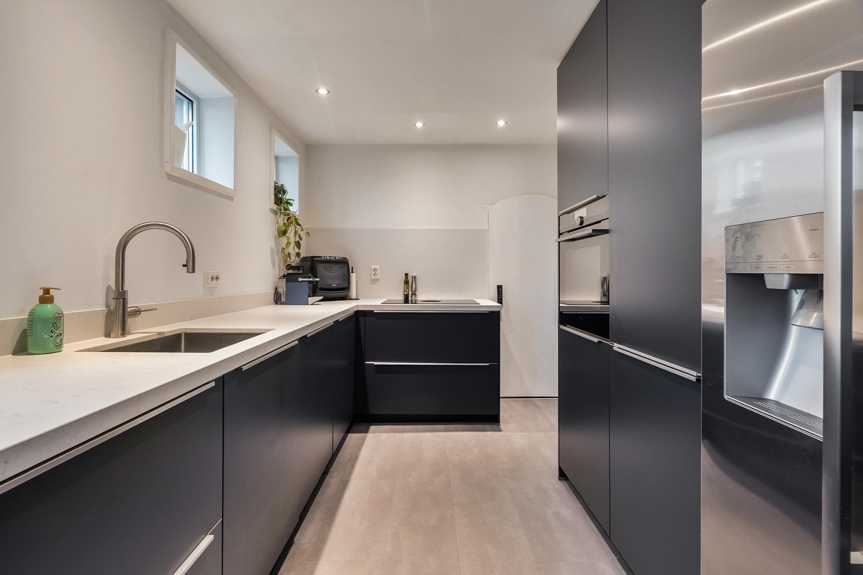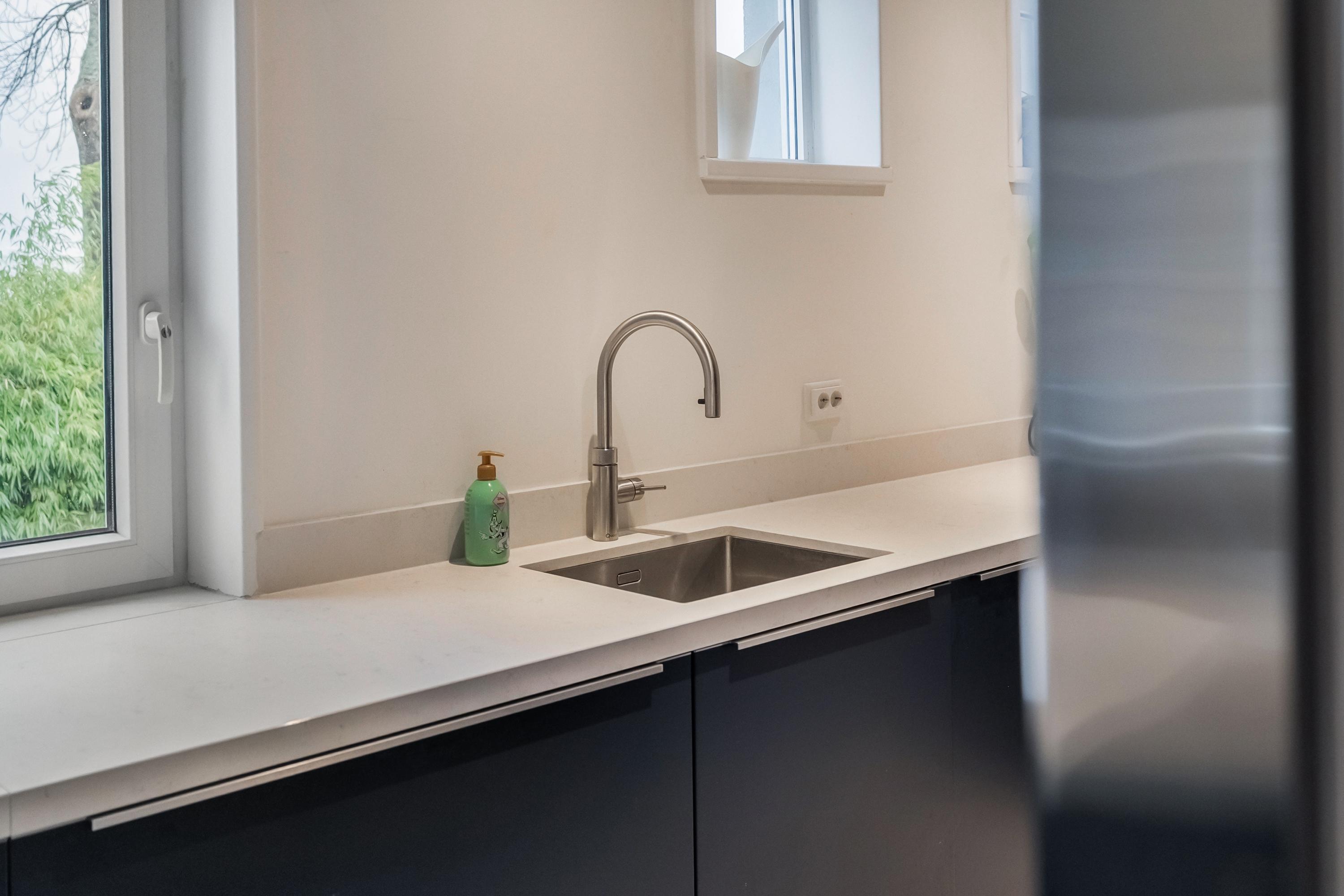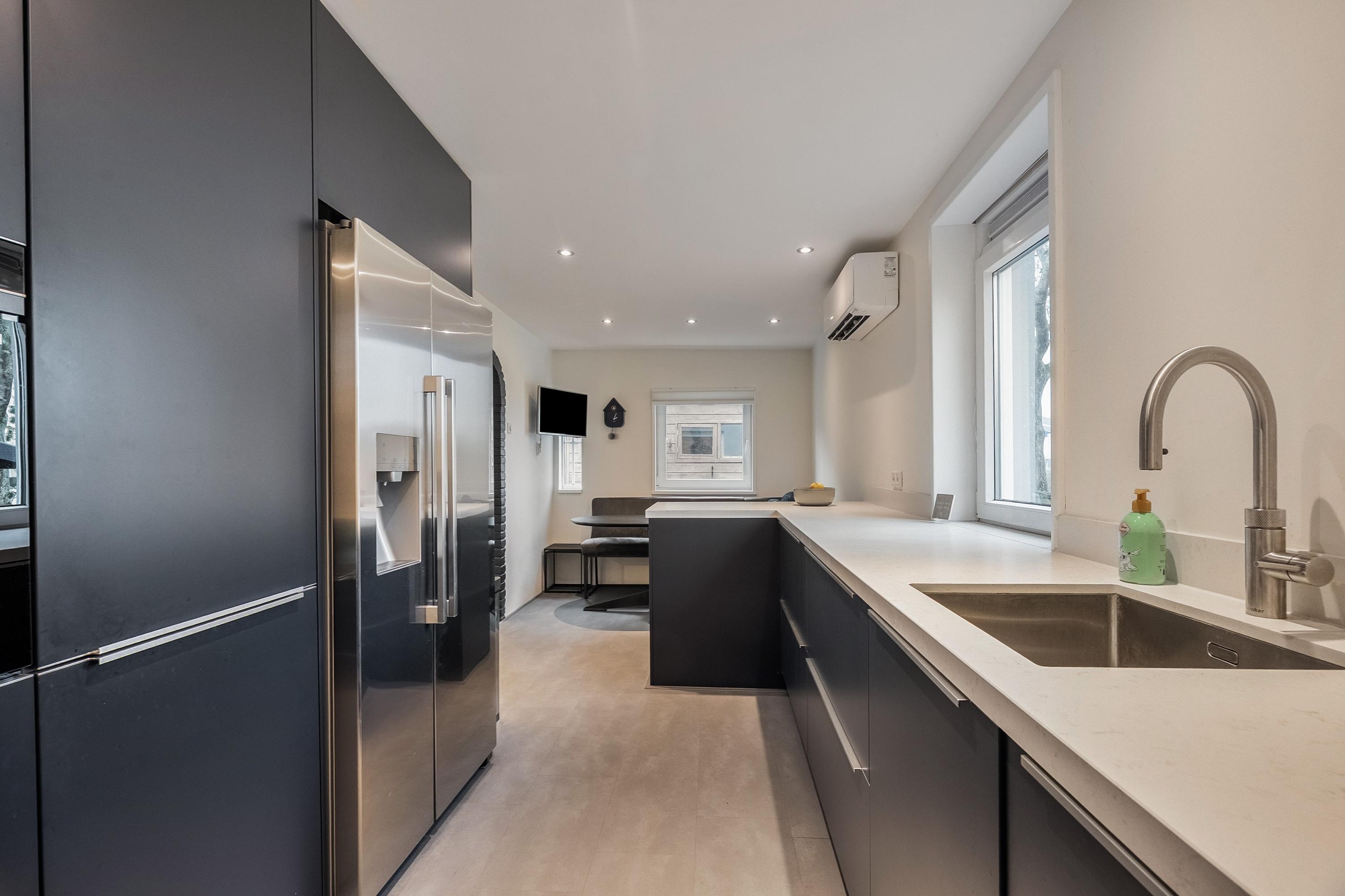 Aan de achterzijde lopen we door naar de leefkeuken. Een chique keuken uitgevoerd in een stijlvolle blauwe kleur met een neutraal blad. De keuken is riant en van alle gemakken voorzien: een Ridderkerkse Quooker met Cube, vaatwasser, Bora-kookplaat met geïntegreerd afzuigsysteem, koelkast, vriezer en een ingebouwde stoomoven. In de kastjes en laden is veel bergruimte en dankzij de vele ramen komt er lekker veel licht binnen. In het plafond zijn spots verwerkt zodat je altijd voldoende licht hebt om iets moois op tafel te zetten.