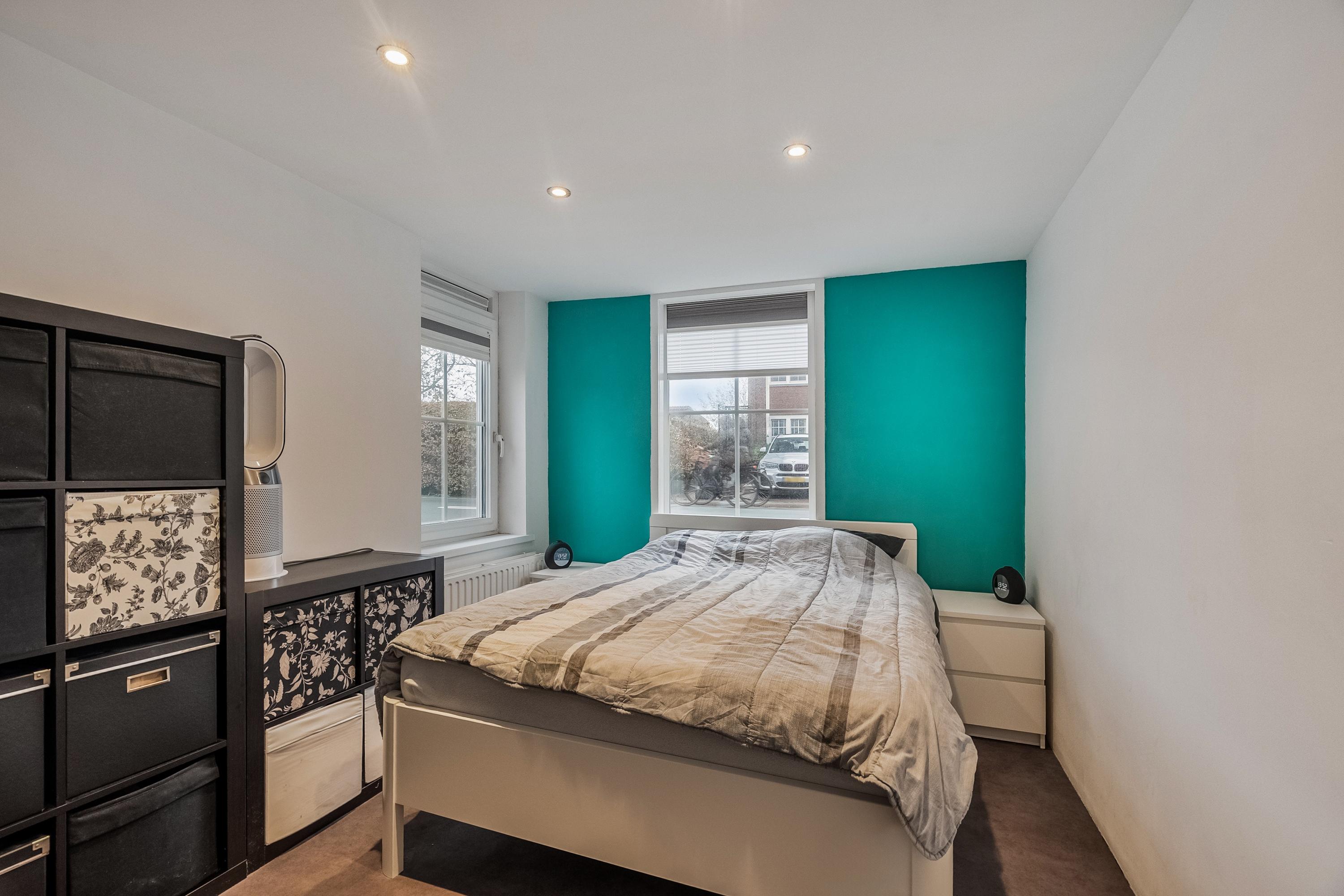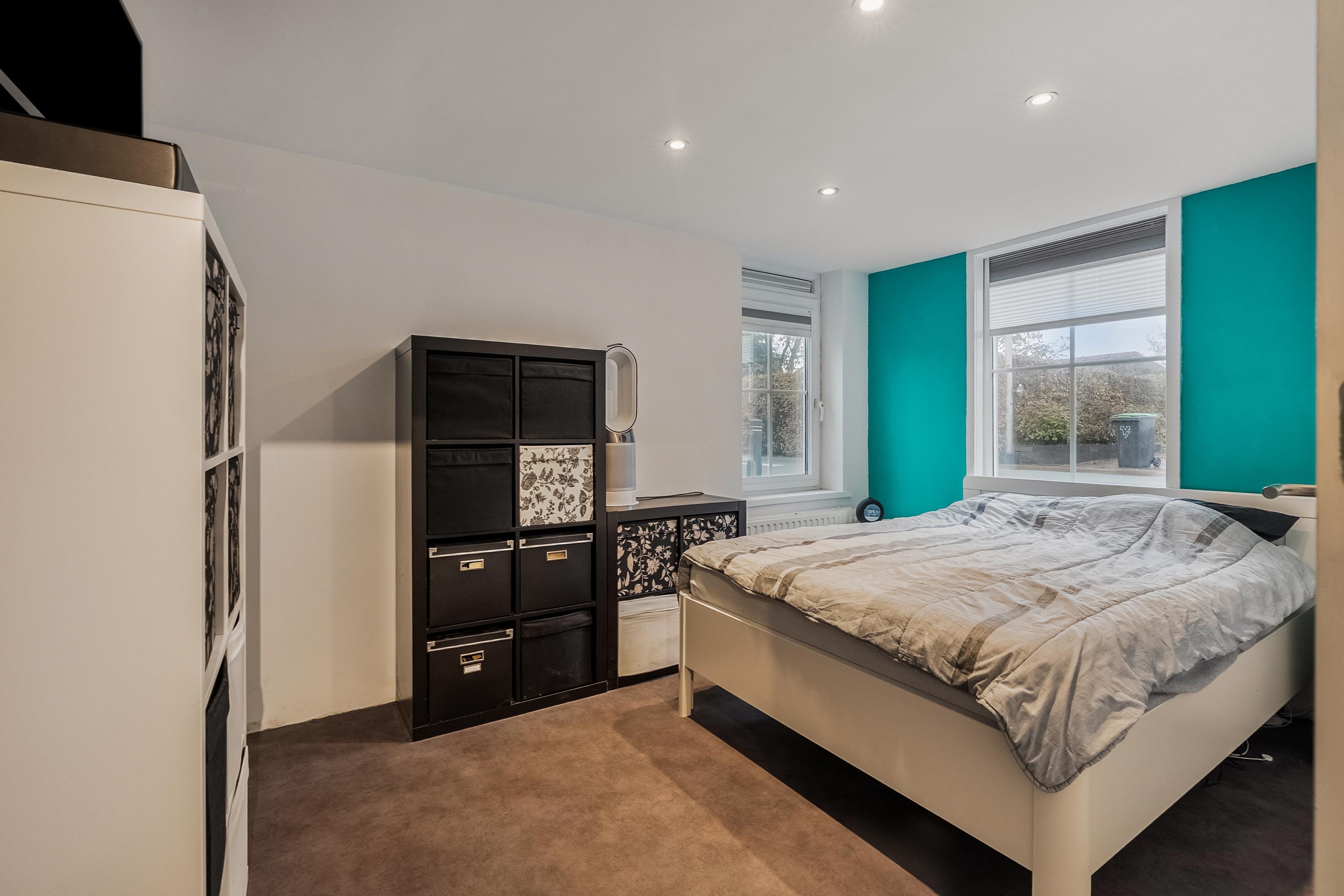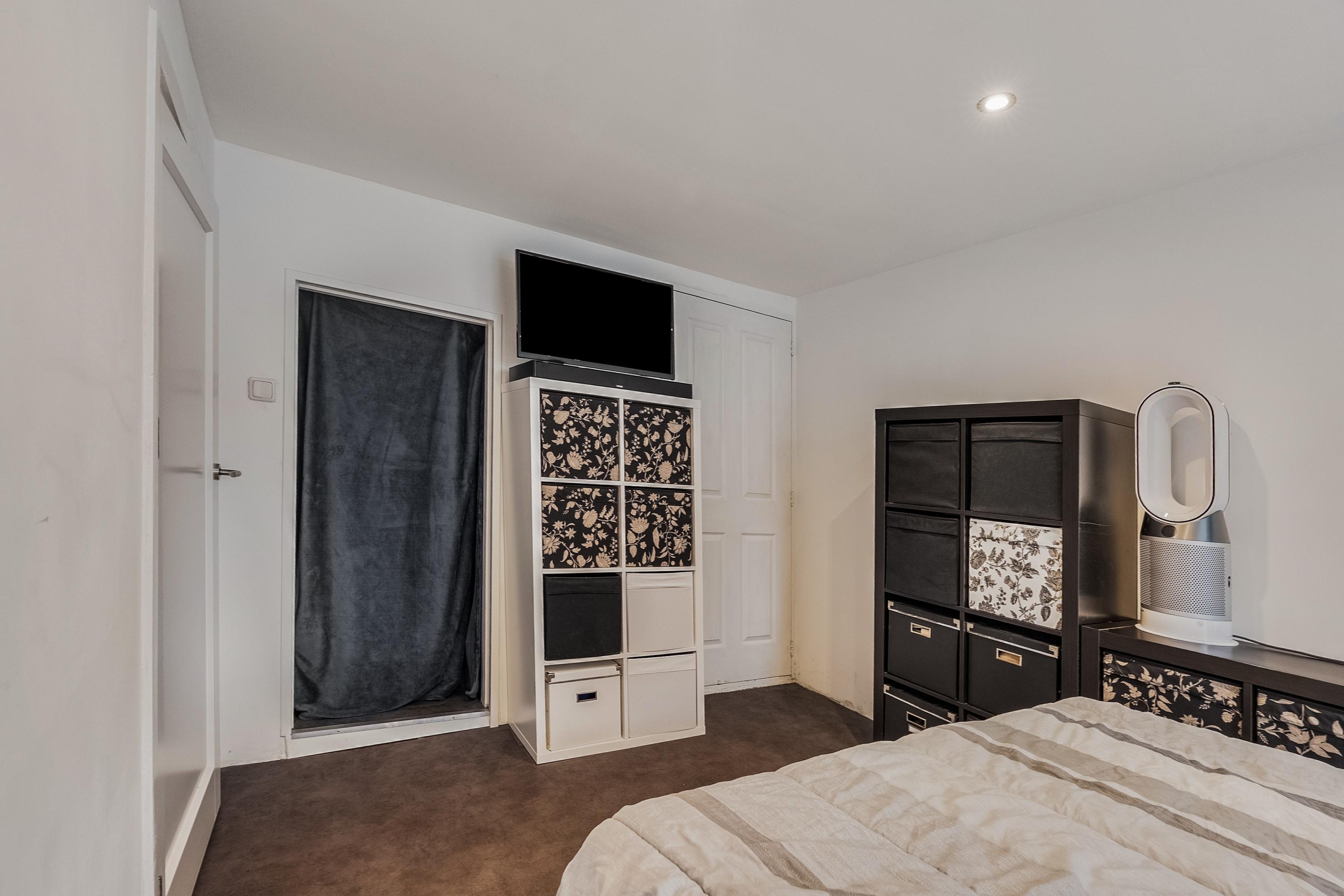 Terug in huis lopen we op de begane grond naar de eerste slaapkamer aan de voorzijde. Een fijne kamer met ruimte voor een tweepersoonsbed en een kledingkast. Deze kamer beschikt over een eigen toilet en een inbouwkast.