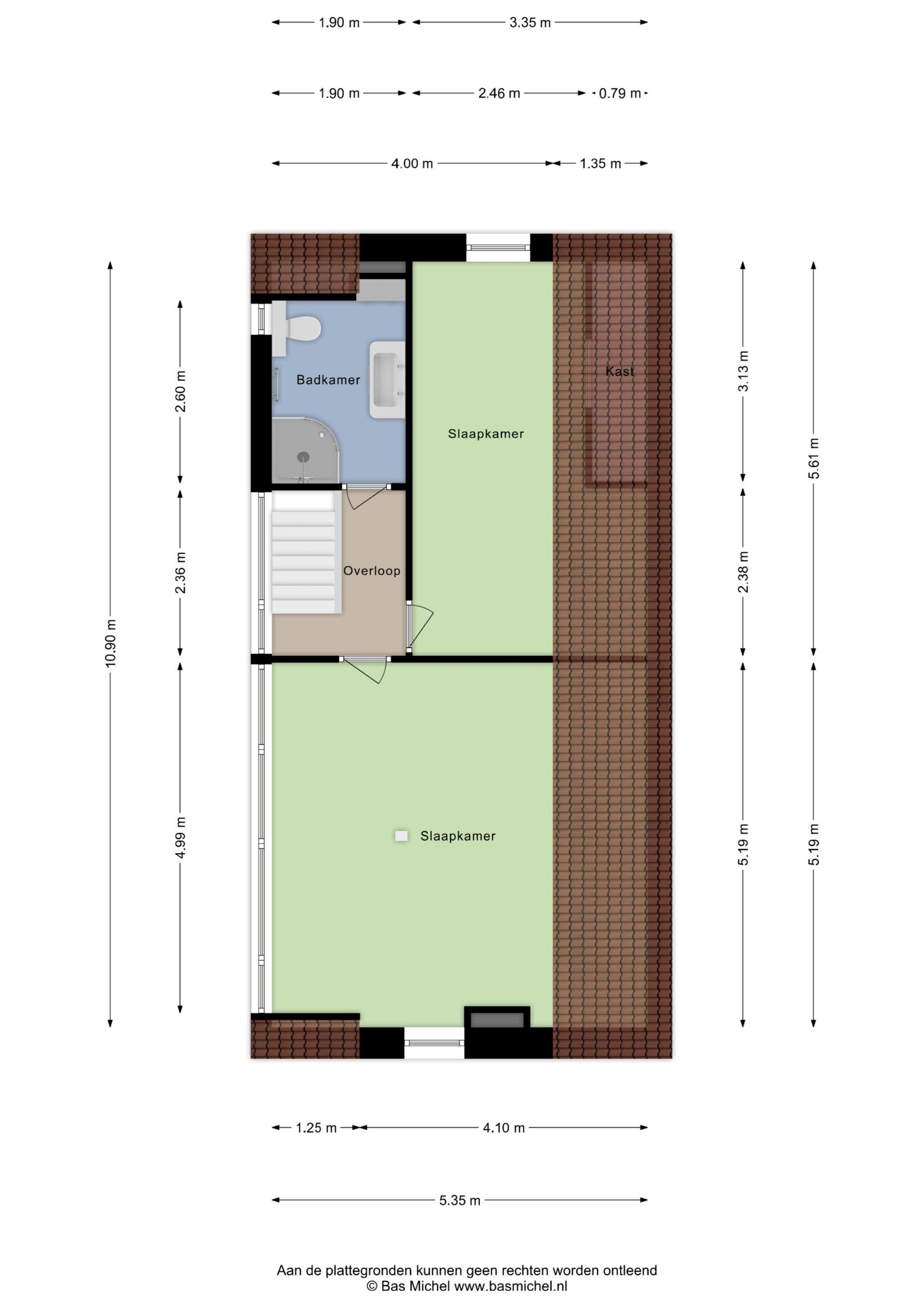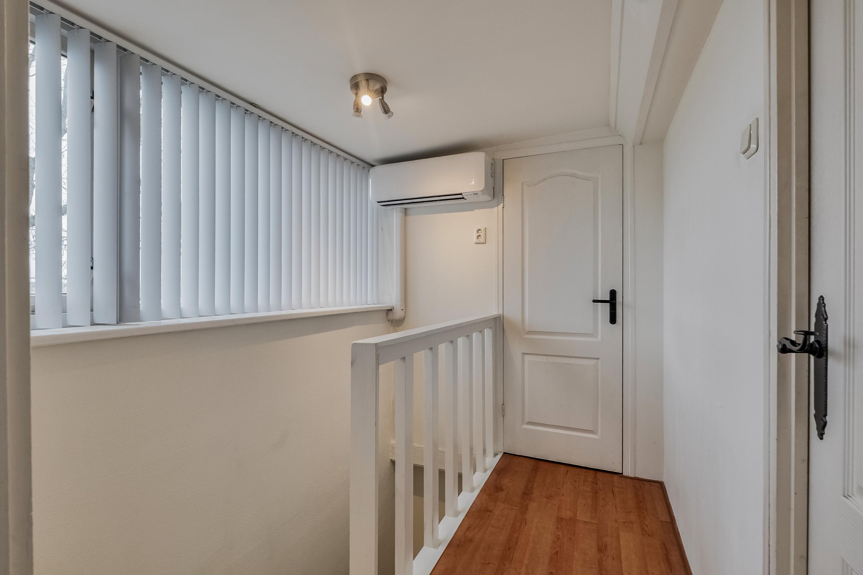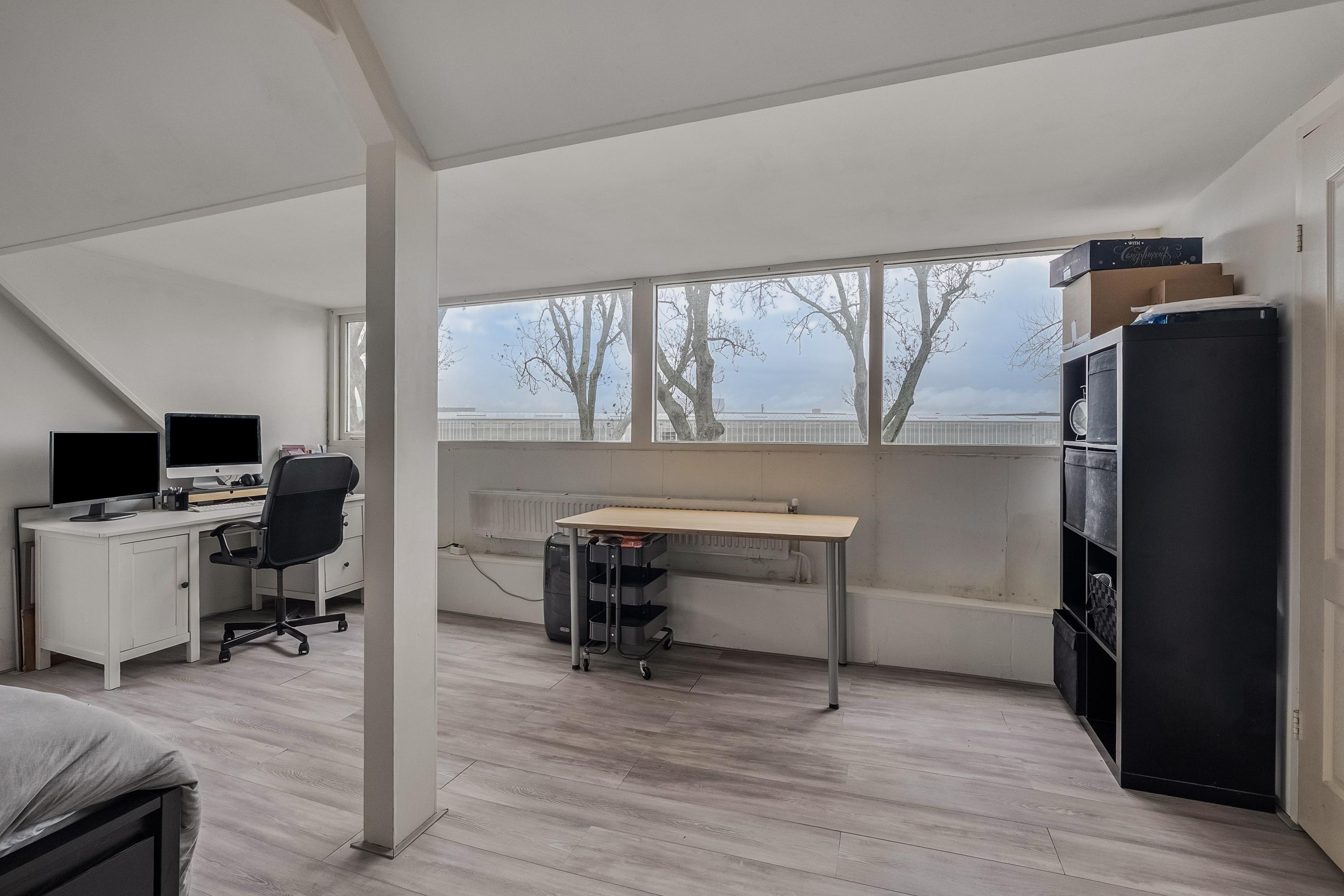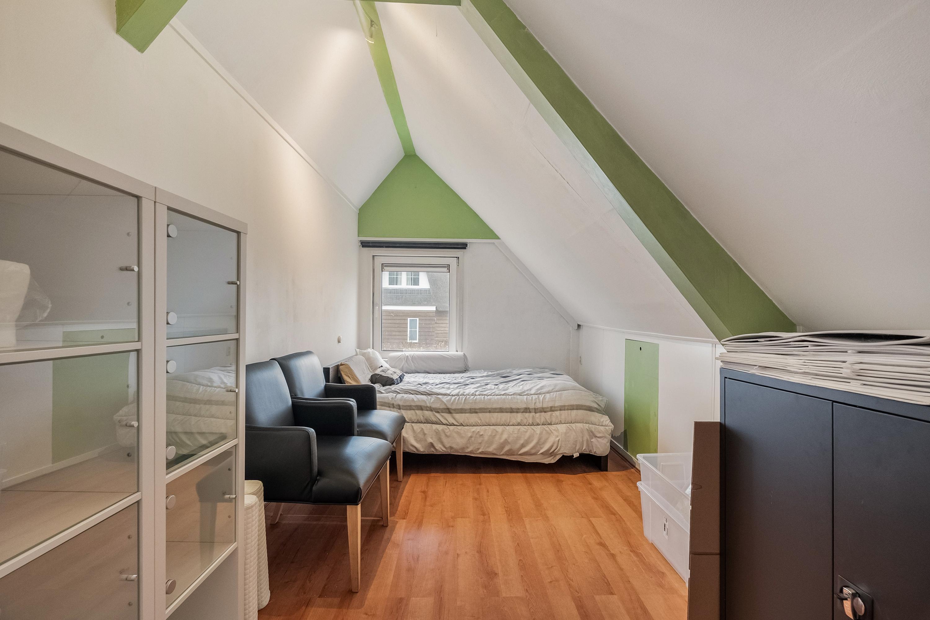 Via de trap gaan we naar boven, waar we twee slaapkamers treffen. Eén riante slaapkamer van circa 20 m²; dit is de oppervlakte vanaf 1,50 meter hoogte – onder de schuine kap is nog veel meer functionele ruimte beschikbaar. Dankzij de grote dakkapel, die vrijwel geheel uit raam bestaat, is deze kamer bijzonder licht. De tweede slaapkamer op deze verdieping is met 12 m² eveneens heerlijk ruim.
