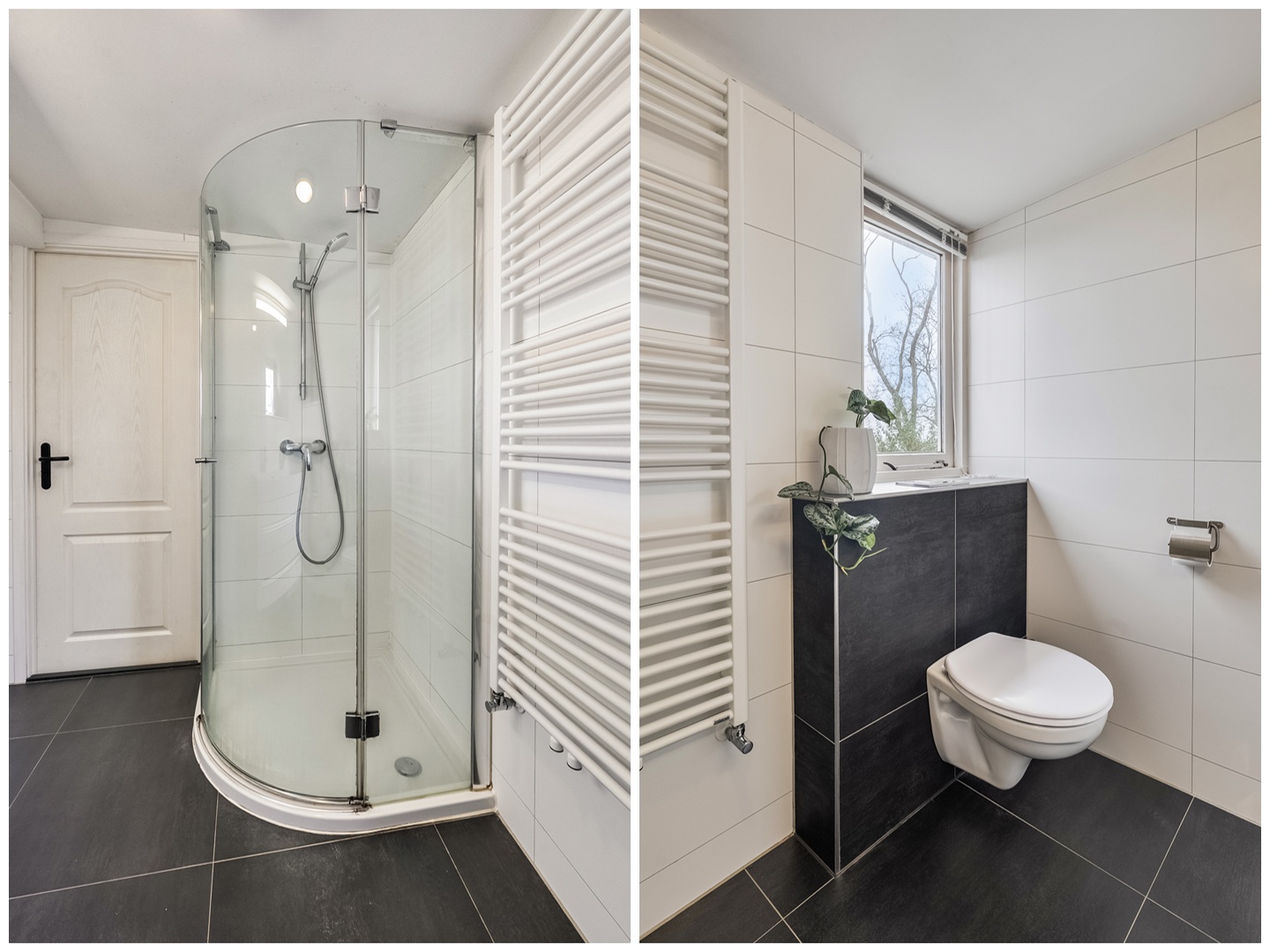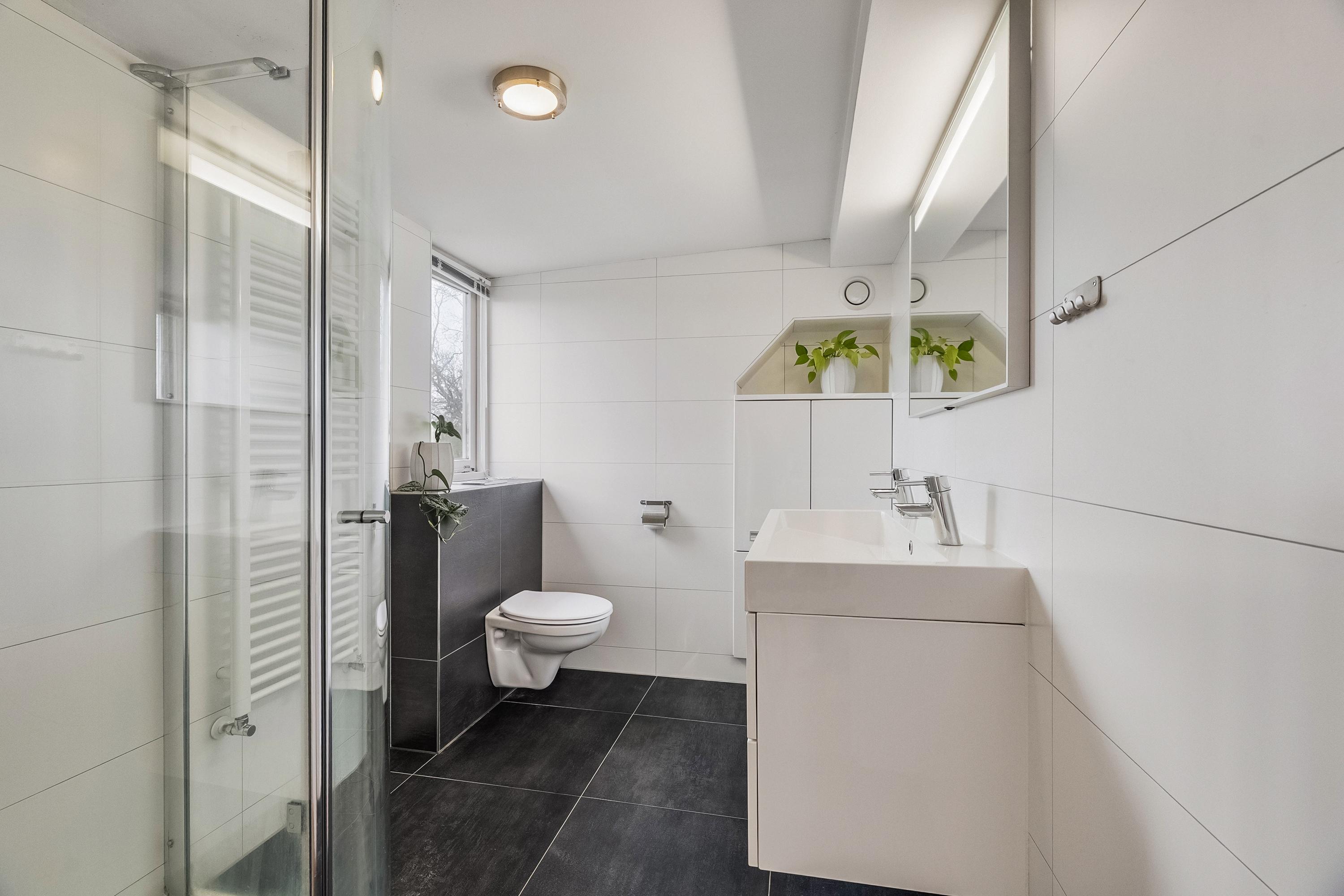 Vanaf de overloop hebben we toegang tot de badkamer: een ruime badkamer met een dubbele wastafel, wastafelmeubel en een spiegel met geïntegreerde verlichting. Daarnaast is er een ruime douchecabine en treffen we hier het derde toilet van het huis. De handdoeken hang je te drogen aan de radiator en ook deze ruimte is lekker licht door het grote raam.