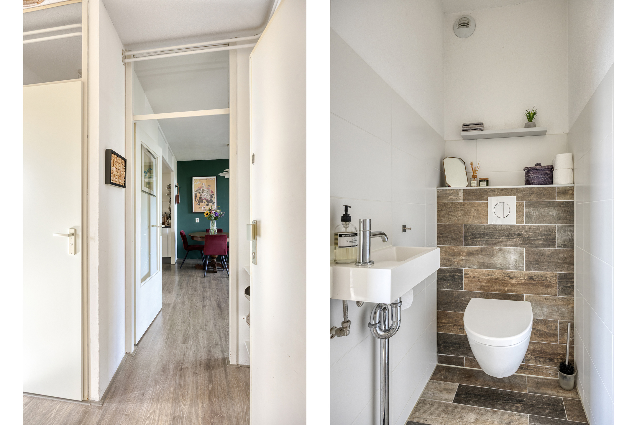 Op de begane grond stappen we het gesloten portiek binnen met het bellentableau en de brievenbussen. We nemen de lift naar de vijfde verdieping, waar we achter de voordeur de hal van dit appartement binnenstappen. Je hangt je jas op, zet je tas weg en loopt de woonkamer in. Het valt direct op hoe licht deze ruimte is: de woonkamer is breed en zonnig, met grote ramen en een open doorkijk naar de wijk. Hier heb je alle ruimte voor een gezellige zithoek en een eethoek. Vanuit de woonkamer stap je het eerste balkon op – een heerlijke plek om in de avondzon een drankje te doen.