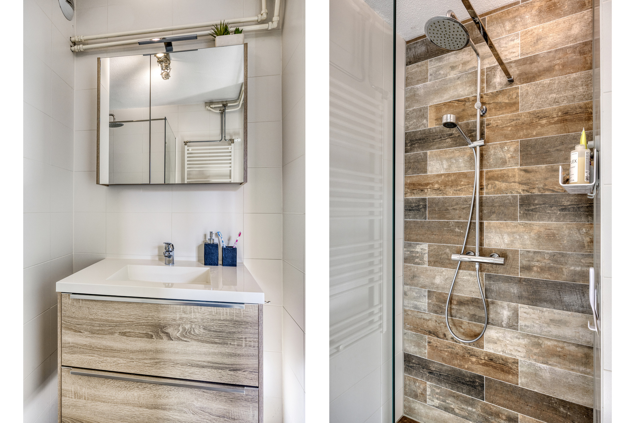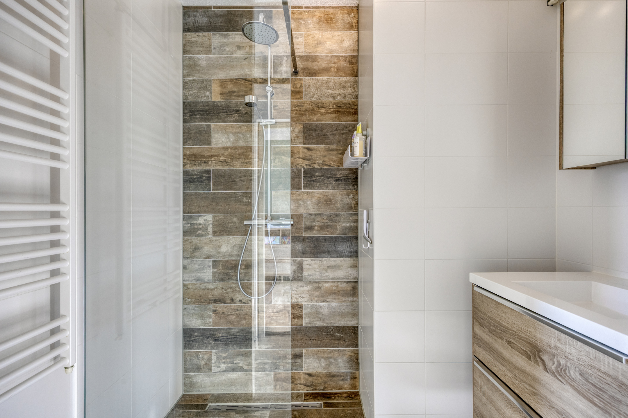 Vanuit de hal heb je toegang tot de moderne badkamer, die is voorzien van een ruime douche, wastafel met wastafelmeubel en een handdoekenradiator. Het toilet bevindt zich apart in de hal.