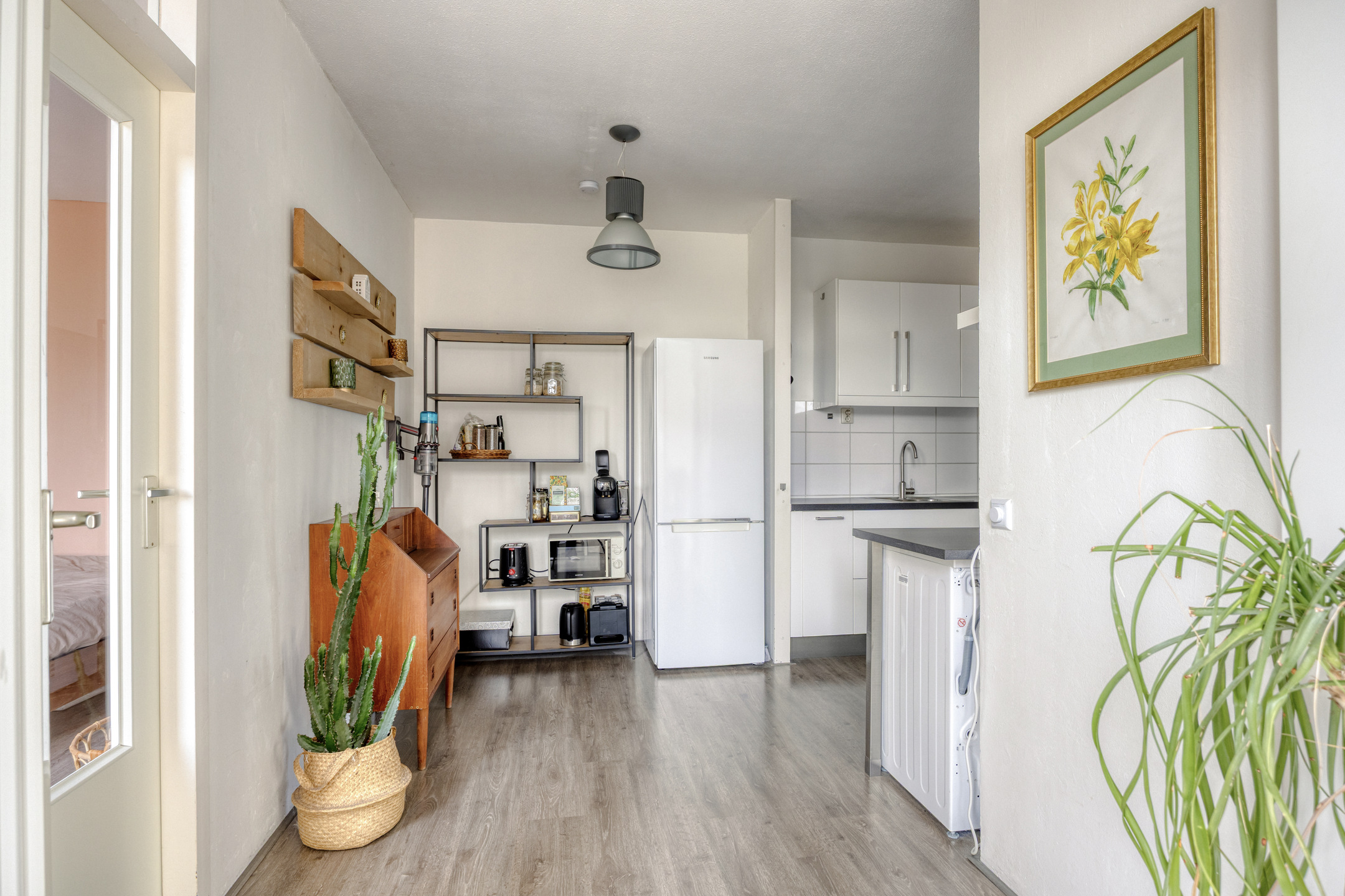 Achter de keuken is nog een ruime plek voor een extra kast om spullen op te bergen, maar je zou hier ook gemakkelijk een thuiswerkplek kunnen inrichten.
