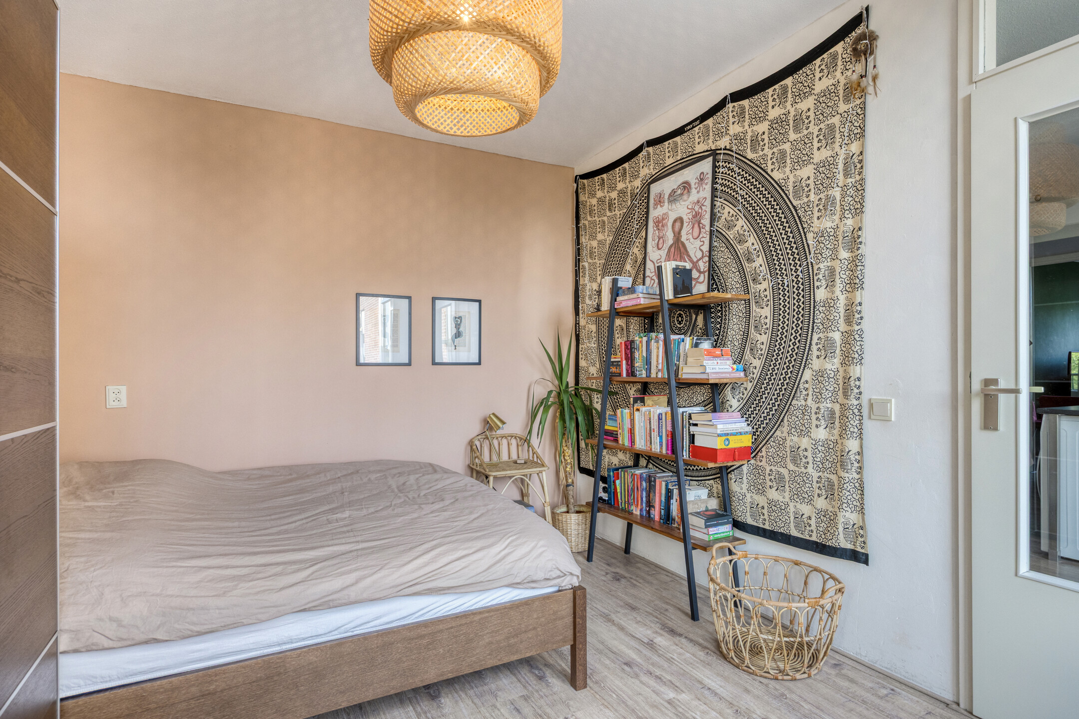 Vanuit hier stappen we de eerste slaapkamer in: een ruime kamer met meer dan genoeg plek voor een tweepersoonsbed en een grote kledingkast. Vanuit deze kamer heb je toegang tot het tweede balkon, gelegen aan de rustige achterzijde.