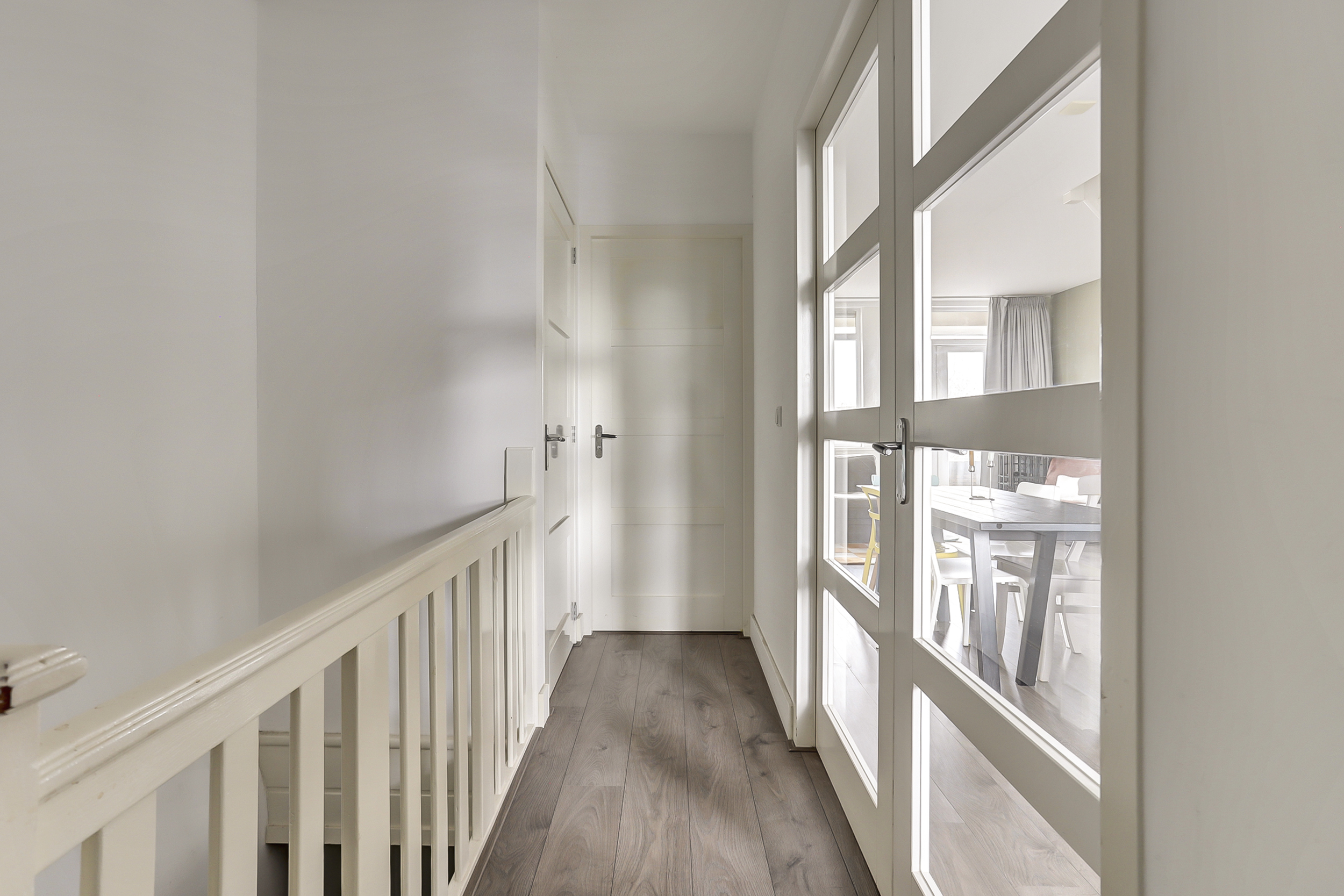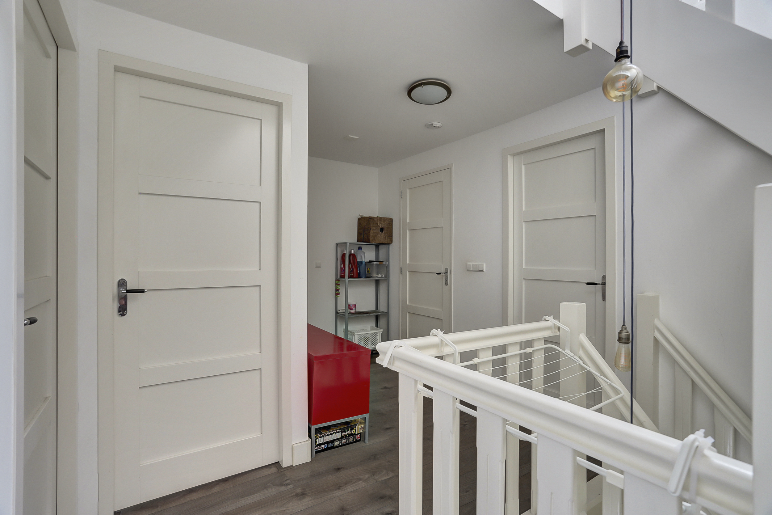 Via de gezamenlijke entree betreden we het pand en lopen we met de onderburen mee naar de tweede verdieping. Achter de eigen voordeur vervolgen we onze weg naar de derde verdieping, waar we uitkomen op de overloop van het appartement.