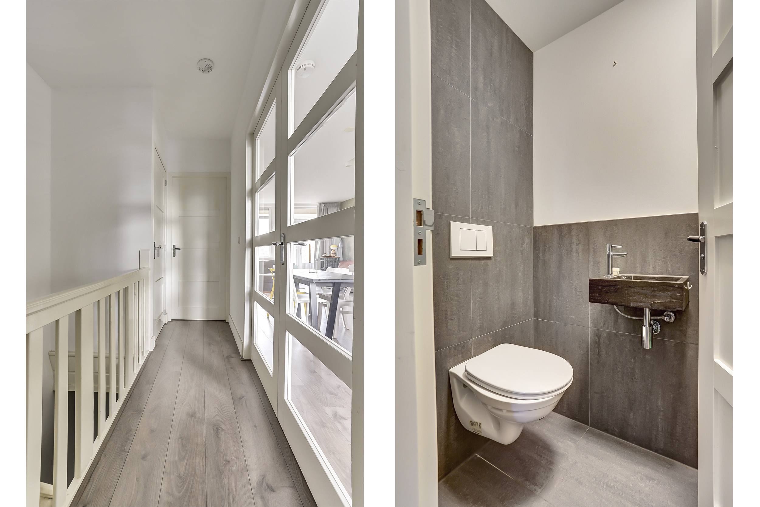 Op de overloop vinden we het eerste toilet en de kast met de cv-ketel. Vervolgens stappen we de woonkamer binnen. En dat is meteen raak. Grote raampartijen, een royale indeling en een moderne afwerking zorgen voor een lichte en uitnodigende sfeer. Een binnenkomst die indruk maakt.