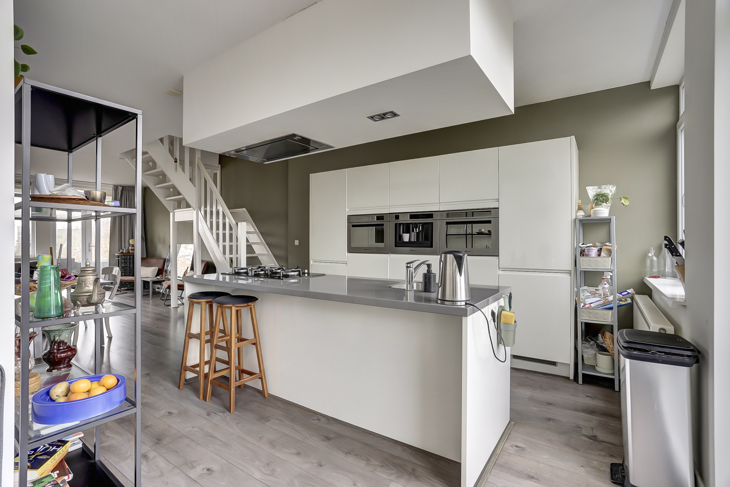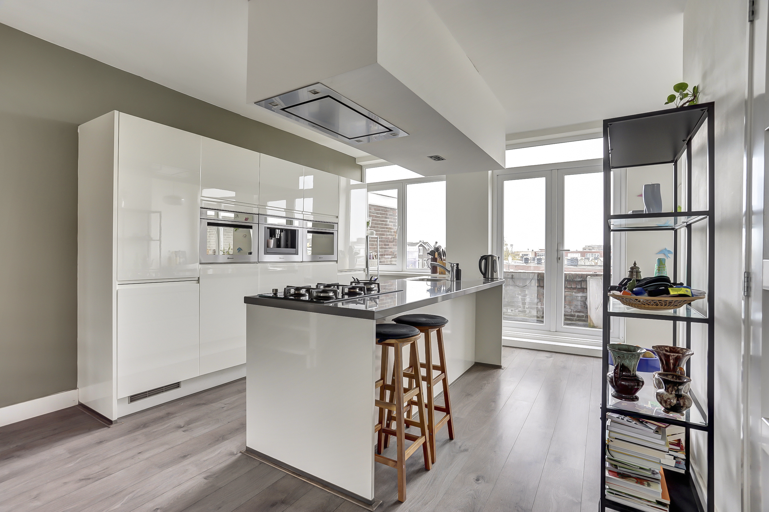 Via de eethoek bereiken we de open keuken aan de achterzijde: strak, modern en een echte eyecatcher. De ruimte is slim ingedeeld en voorzien van een kookeiland met 5-pits gaskookplaat, afzuigkap en spoelbak. De kastenwand is compleet uitgerust met twee koel-vriescombinaties, twee combiovens, een luxe volautomatische koffiemachine en een vaatwasser. Het barretje aan het eiland maakt dit dé plek om samen te komen, bij te praten en te genieten. Ook hier geven openslaande deuren toegang tot een tweede pandbreed balkon (noordoost), waar je de dag begint met de ochtendzon.