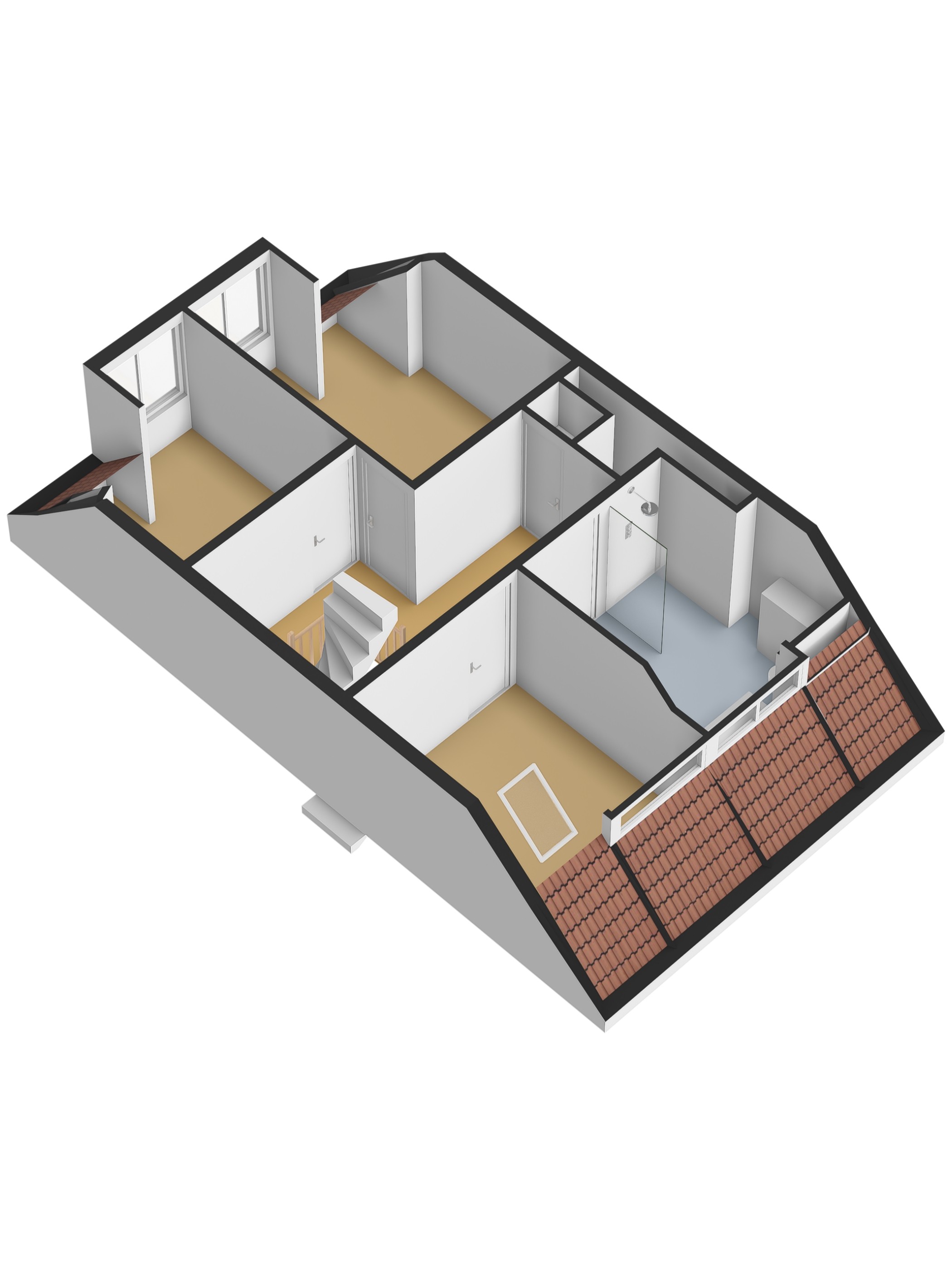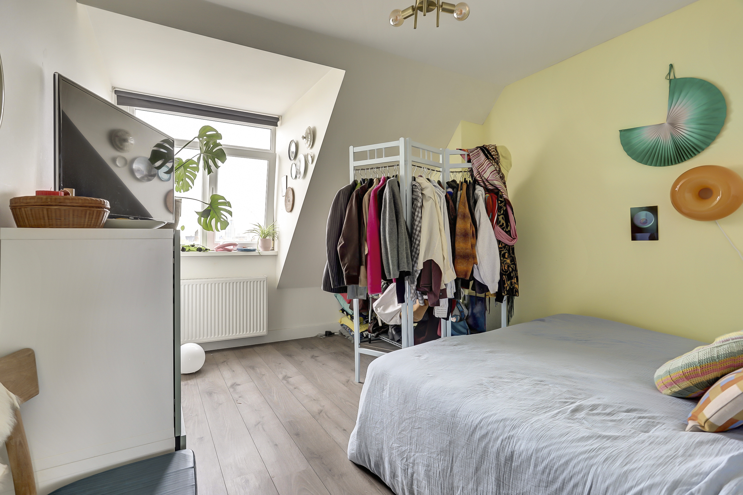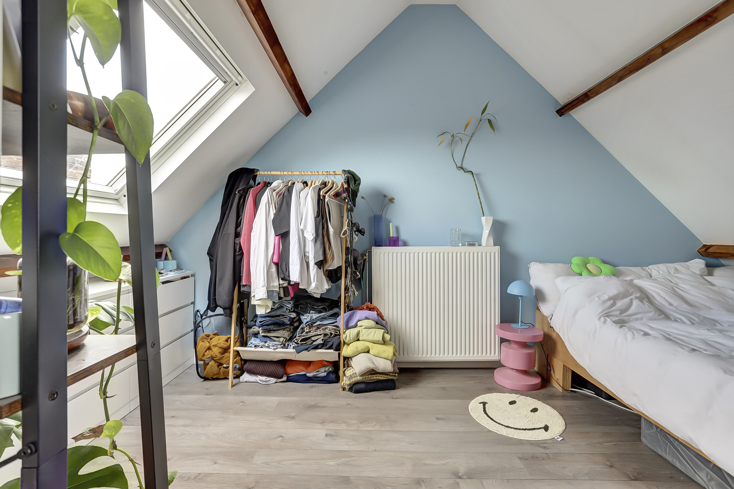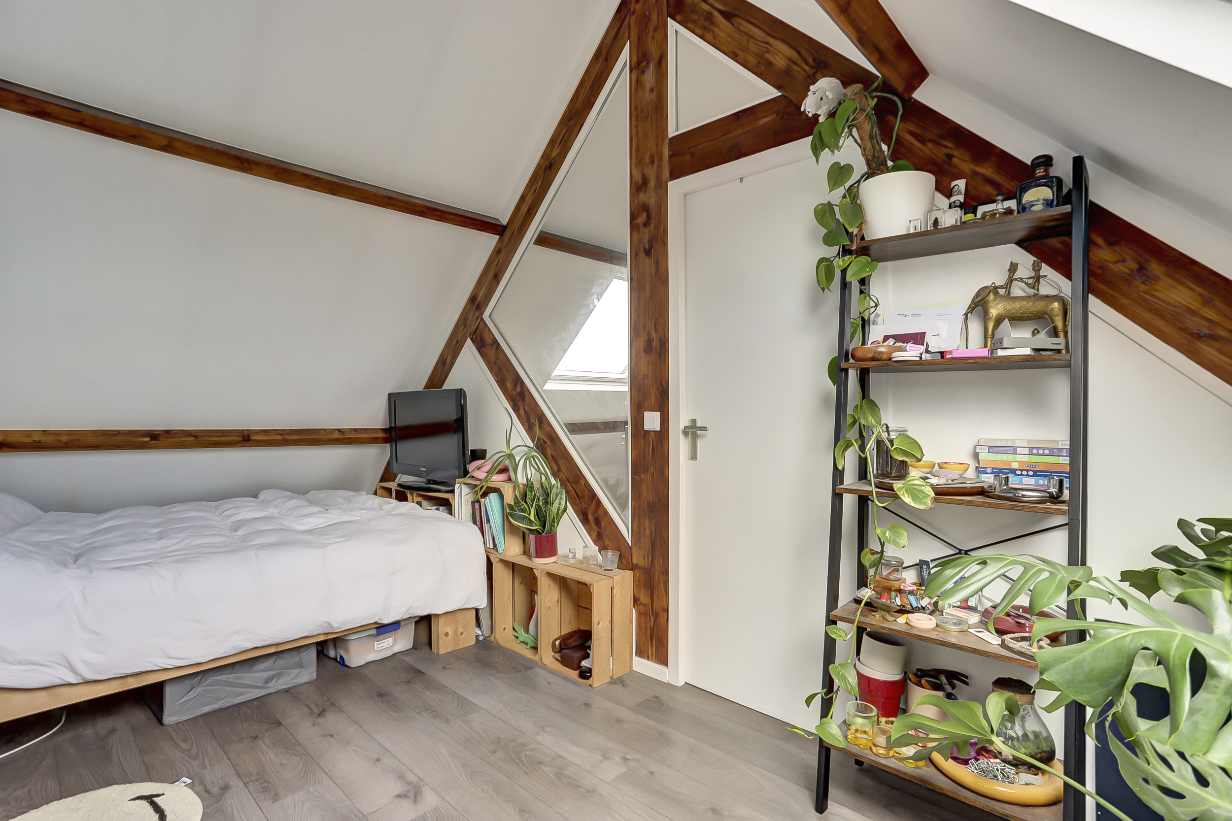 De bovenste verdieping is momenteel ingericht als vierde slaapkamer, maar leent zich ook perfect als lounge, werkruimte of hobbykamer. Het dakraam en de zichtbare houten balken geven deze verdieping een warme en sfeervolle uitstraling. Een heerlijke plek om je even terug te trekken uit de drukte van de stad.