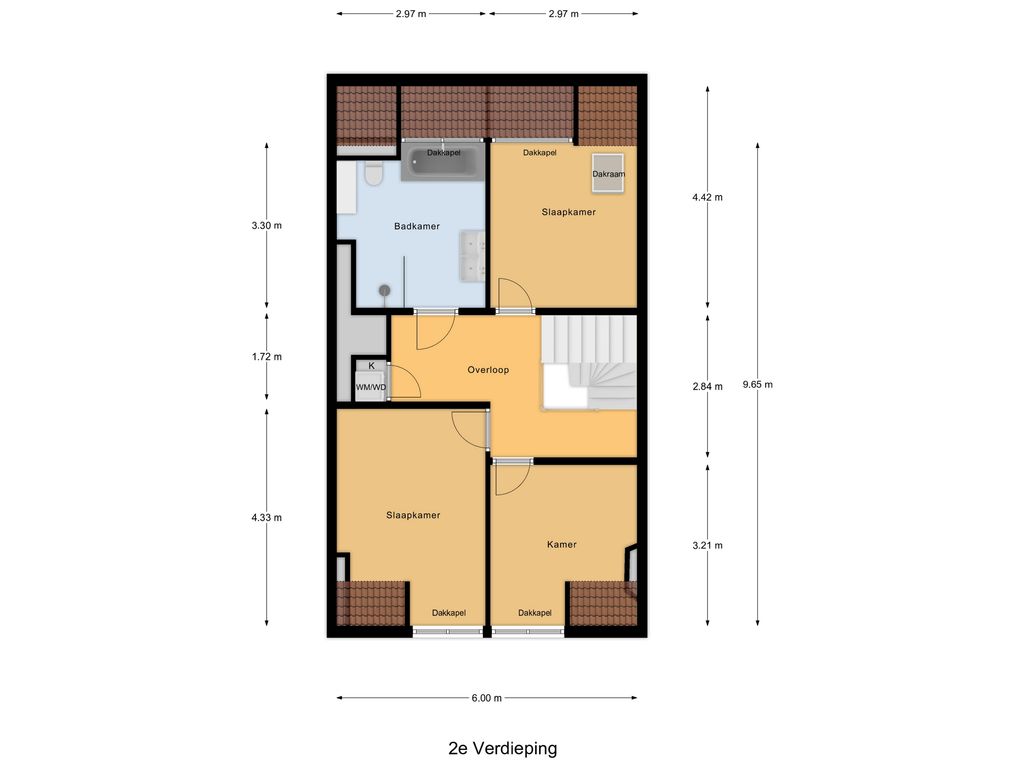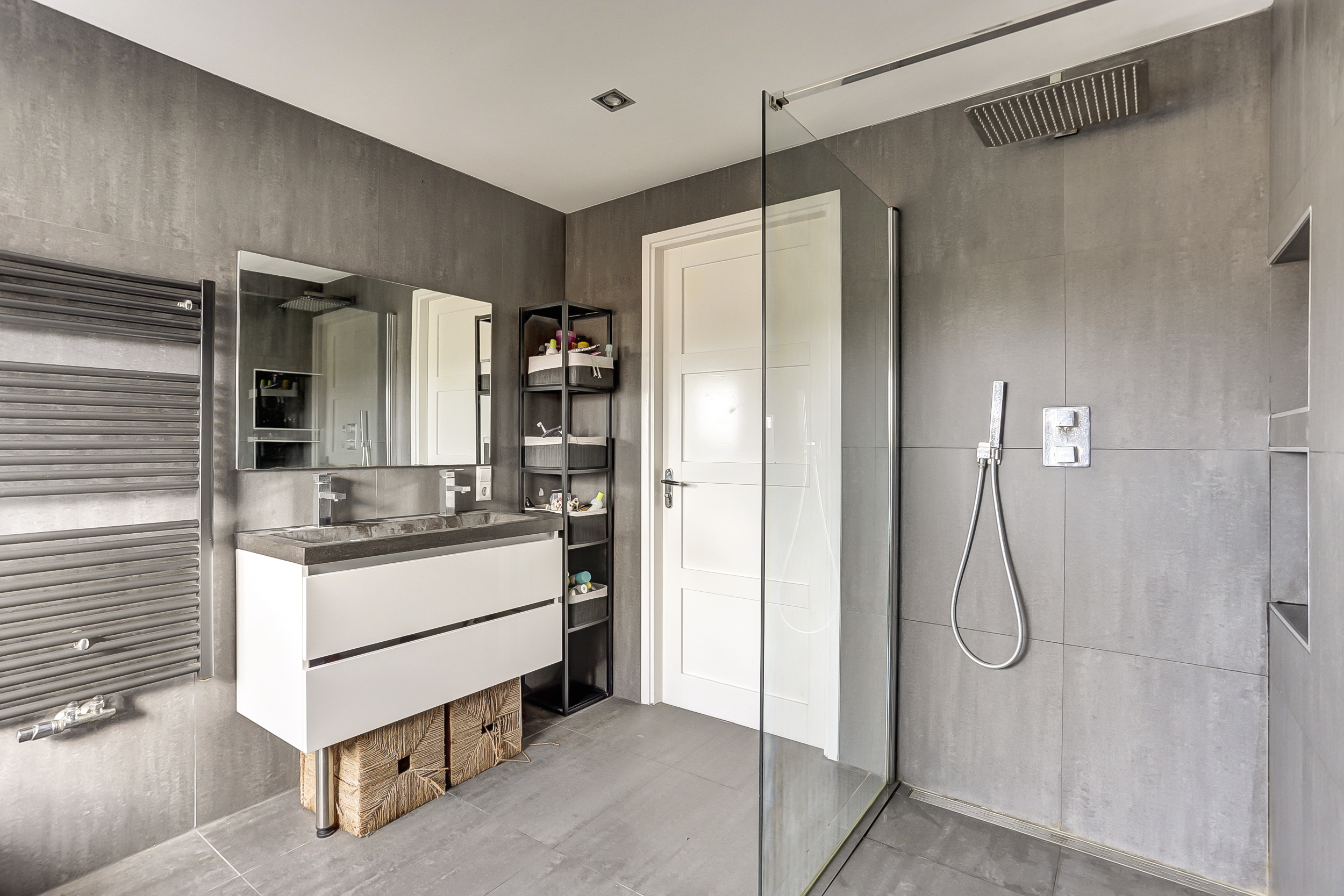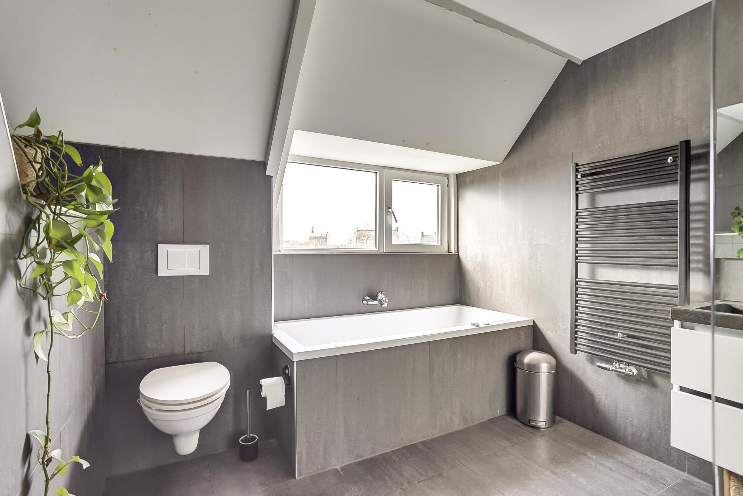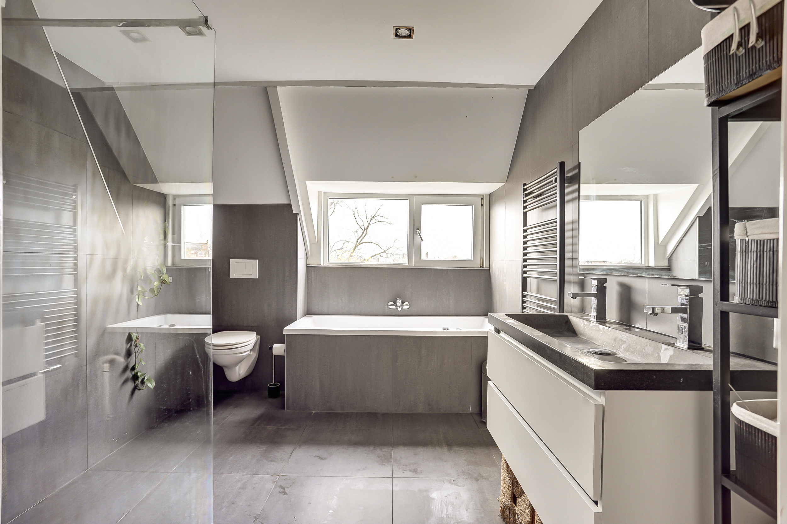 Via de open trap in de woonkamer komen we op de ruime overloop van de vierde verdieping. Hier bevinden zich drie slaapkamers, allemaal prettig van formaat en veelzijdig in gebruik. De moderne badkamer is compleet uitgevoerd met een inloopdouche, ligbad, dubbel wastafelmeubel, toilet en handdoekradiator. Daarnaast is er op de overloop een vaste kast met aansluitingen voor wasmachine en droger. Het open trappenhuis zorgt voor een mooi ruimtelijk gevoel en leidt door naar de bovenste verdieping.