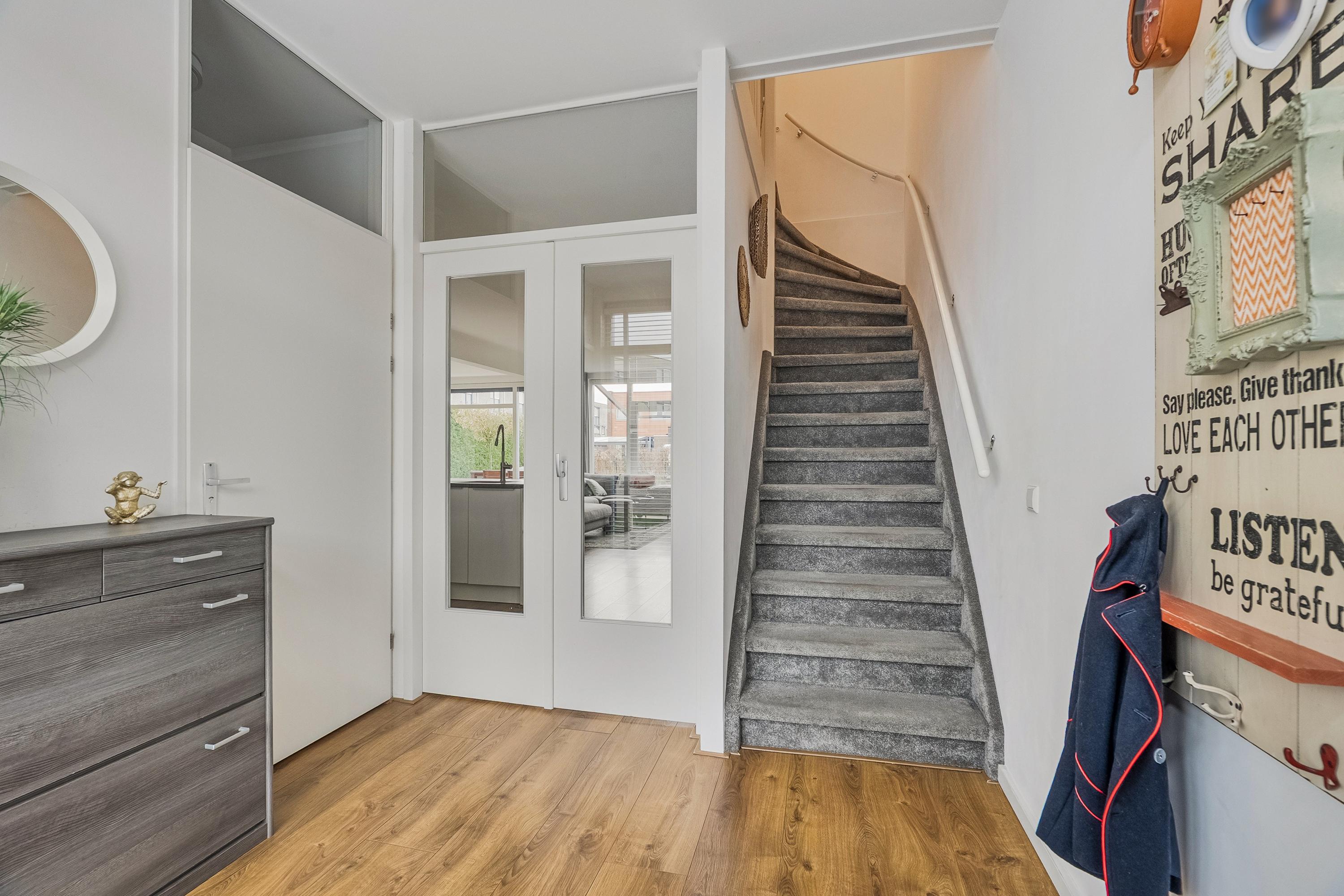 Via de entree komt u in de ruime hal met toegang tot de inpandige berging en de trapopgang naar de eerste verdieping. De toiletruimte is uitgevoerd met een hangend toilet en fonteintje en is gedeeltelijk betegeld in een moderne wit/grijze kleurstelling.