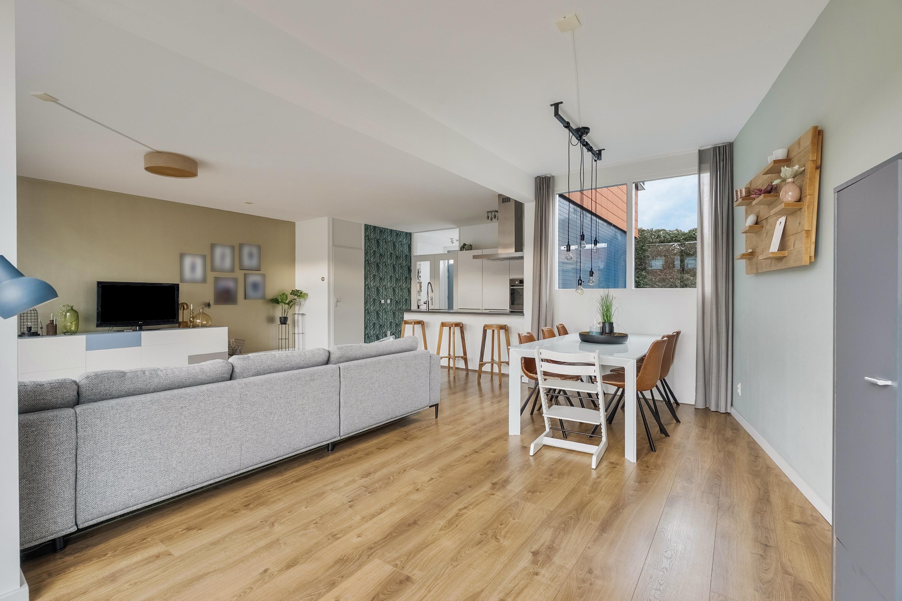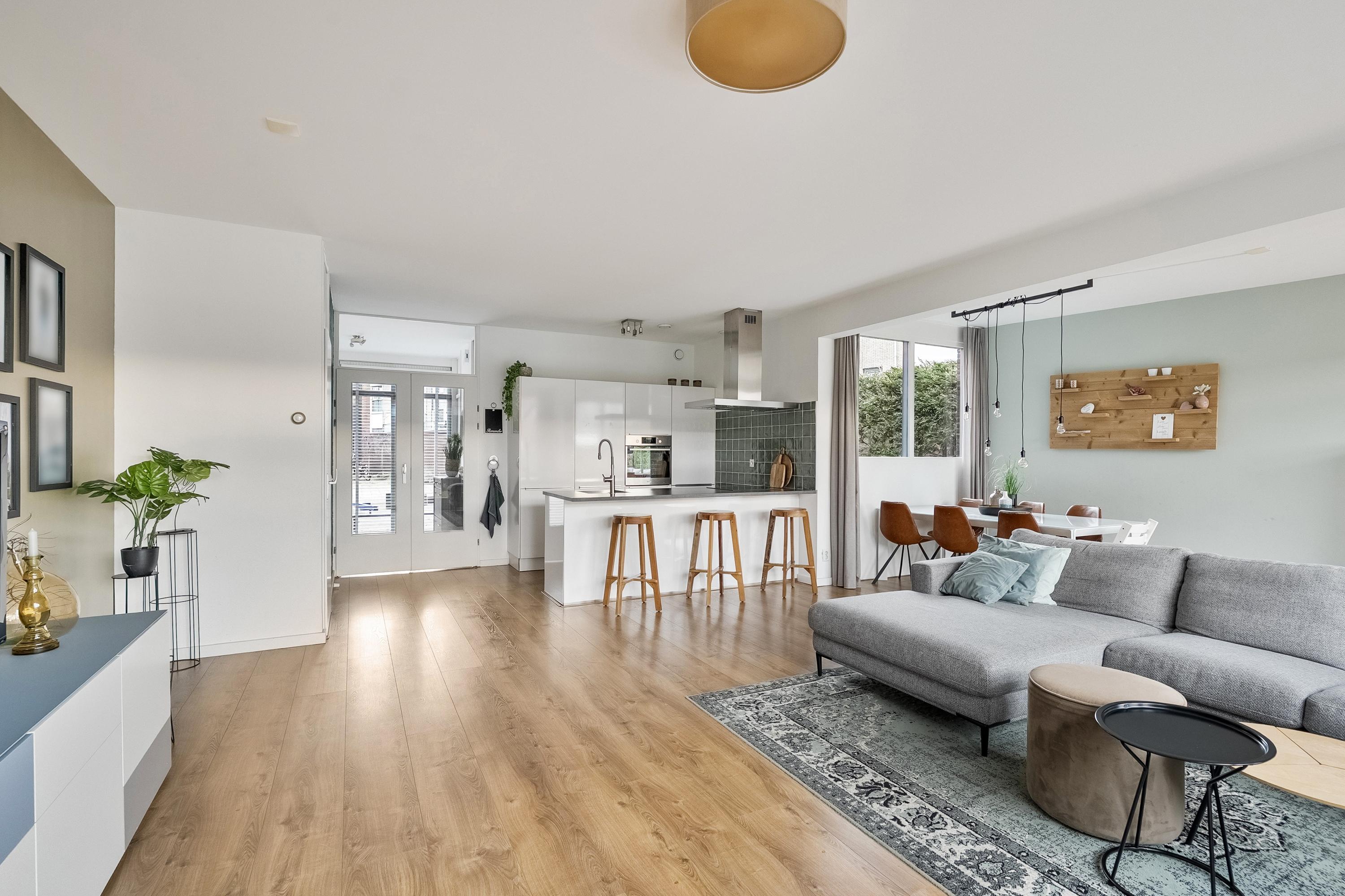 Vanuit de hal bereikt u via openslaande deuren de royale woonkamer. Dankzij de uitbouw aan de zijkant is hier een bijzonder ruime leefruimte ontstaan met volop mogelijkheden voor een grote zithoek en een royale eethoek. De grote raampartijen aan de tuinzijde zorgen voor een prachtige lichtinval en een fraai uitzicht op de diepe achtertuin. De gehele begane grond is afgewerkt met een laminaatvloer met vloerverwarming.