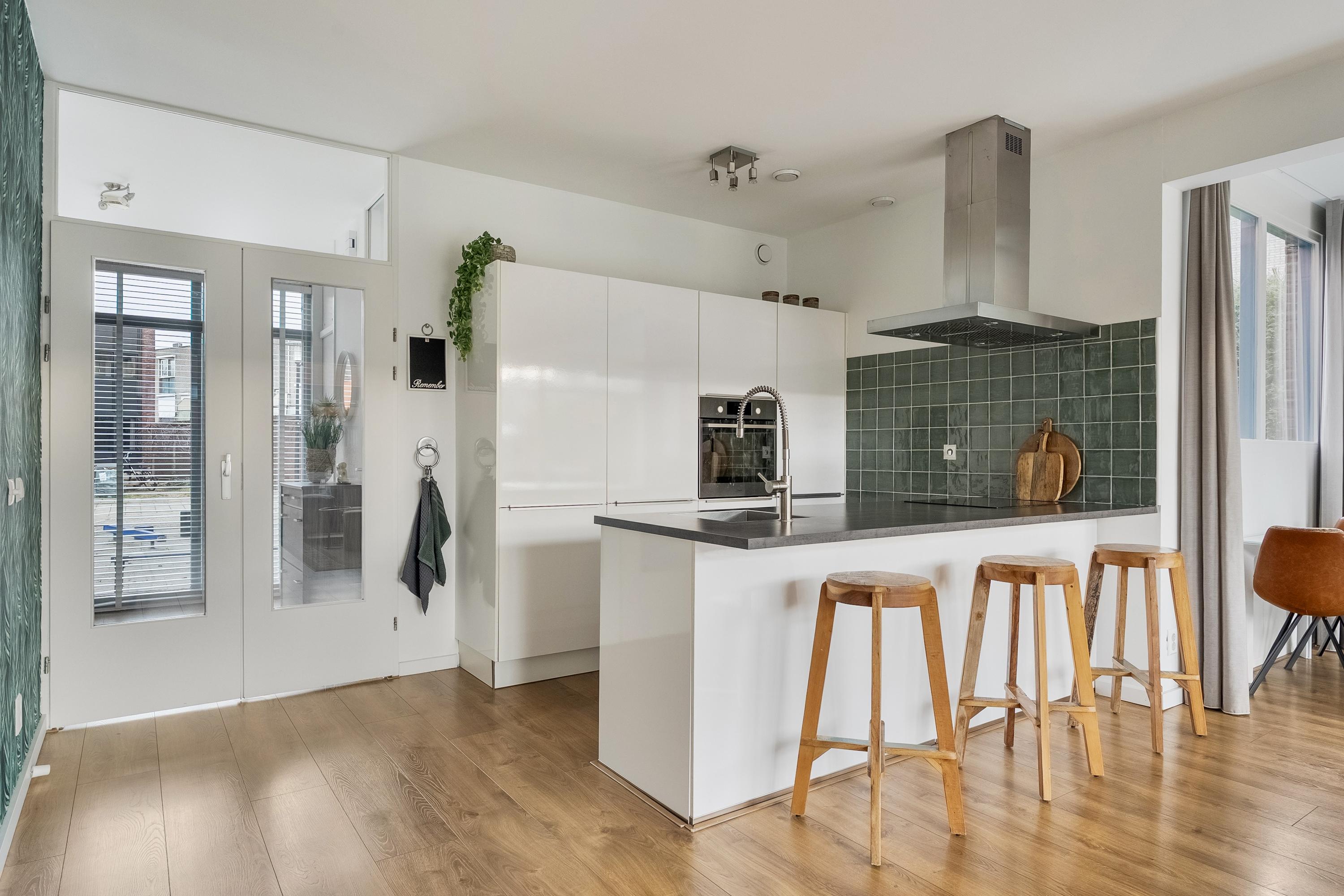 De open keuken vormt het hart van de woning en is uitgevoerd in wit hoogglans met een stijlvol grijs kunststof aanrechtblad. Het kook-/spoeleiland met eetbar maakt deze keuken zowel praktisch als gezellig. De keuken is voorzien van diverse inbouwapparatuur, waaronder een oven, vaatwasser, koel-vriescombinatie en een 4-pits inductiekookplaat met RVS afzuigkap.