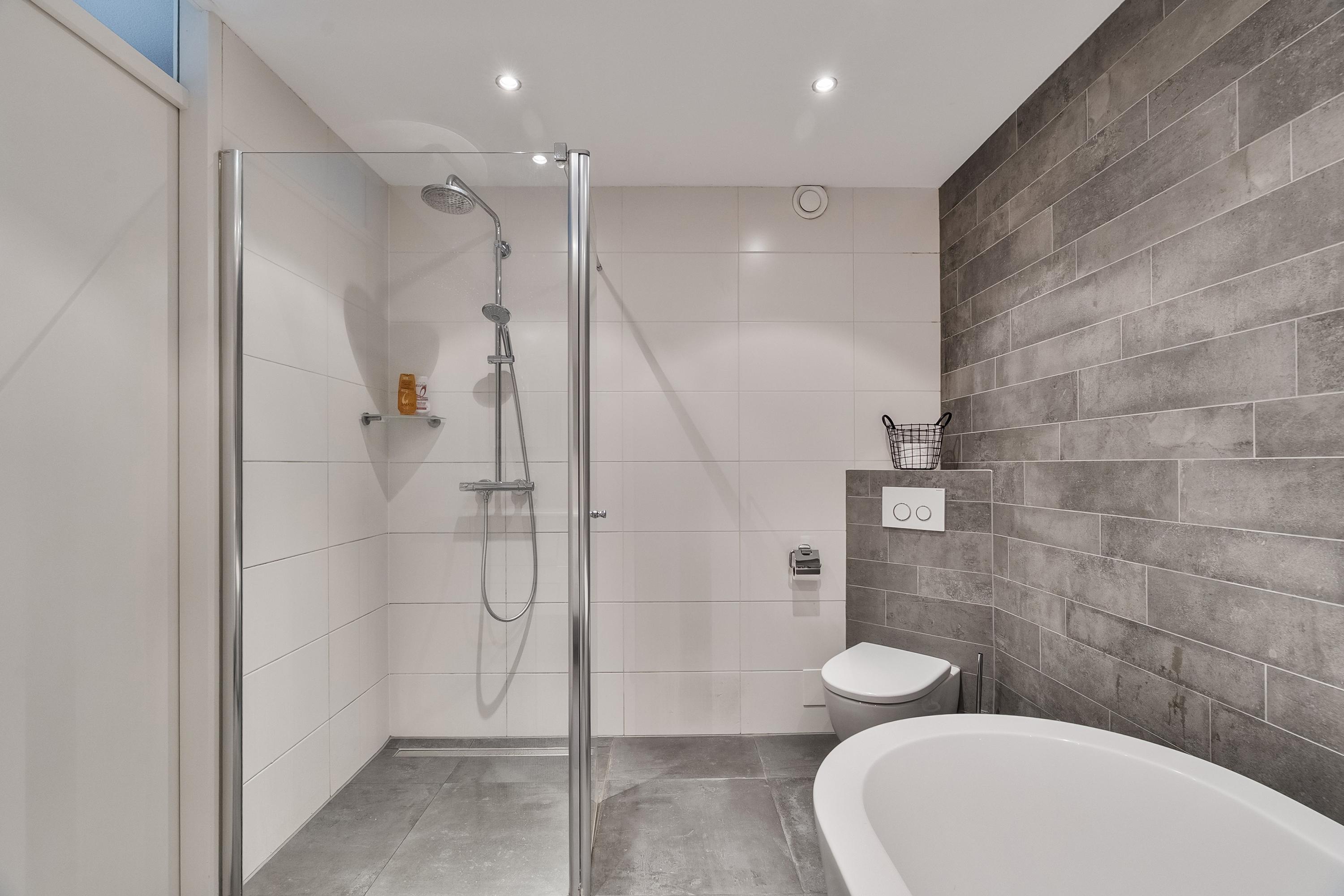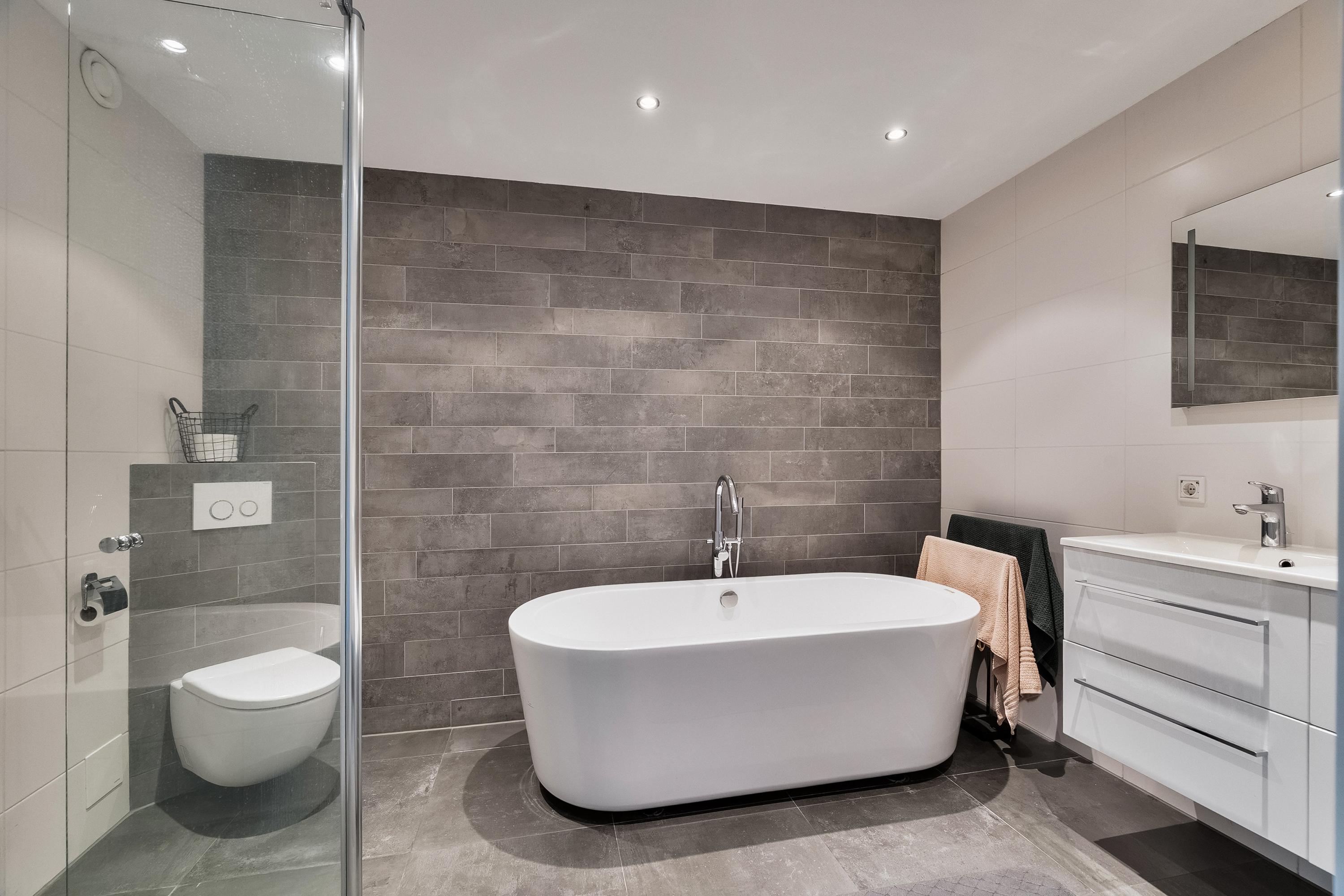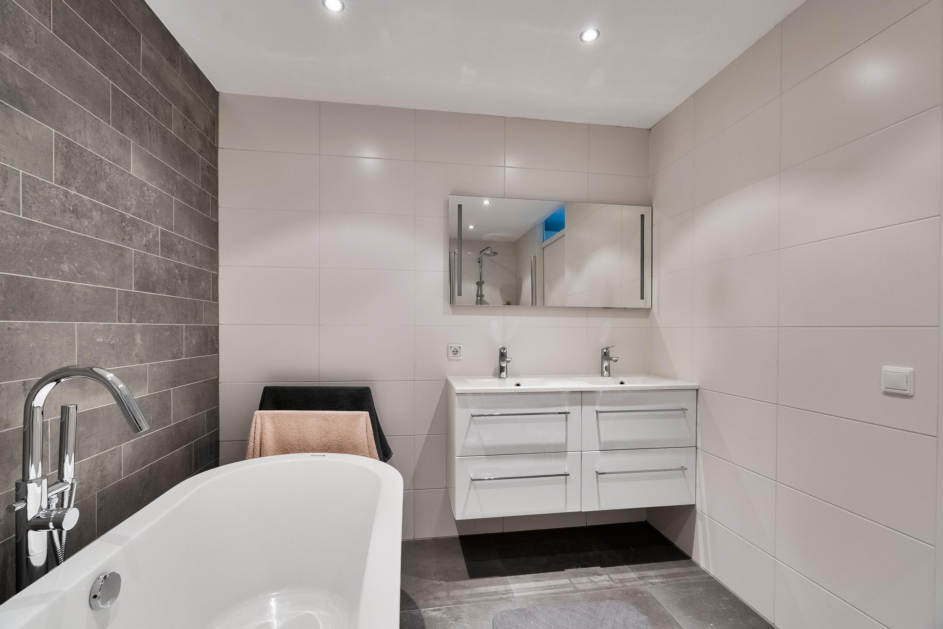 De badkamer is royaal van opzet en luxe uitgevoerd. U vindt hier een vrijstaand ligbad, een aparte douchecabine, een dubbel wastafelmeubel met verlichte spiegel en een tweede hangend toilet. De badkamer is volledig betegeld in een moderne wit/grijze kleurstelling en beschikt over vloerverwarming, wat zorgt voor extra comfort.