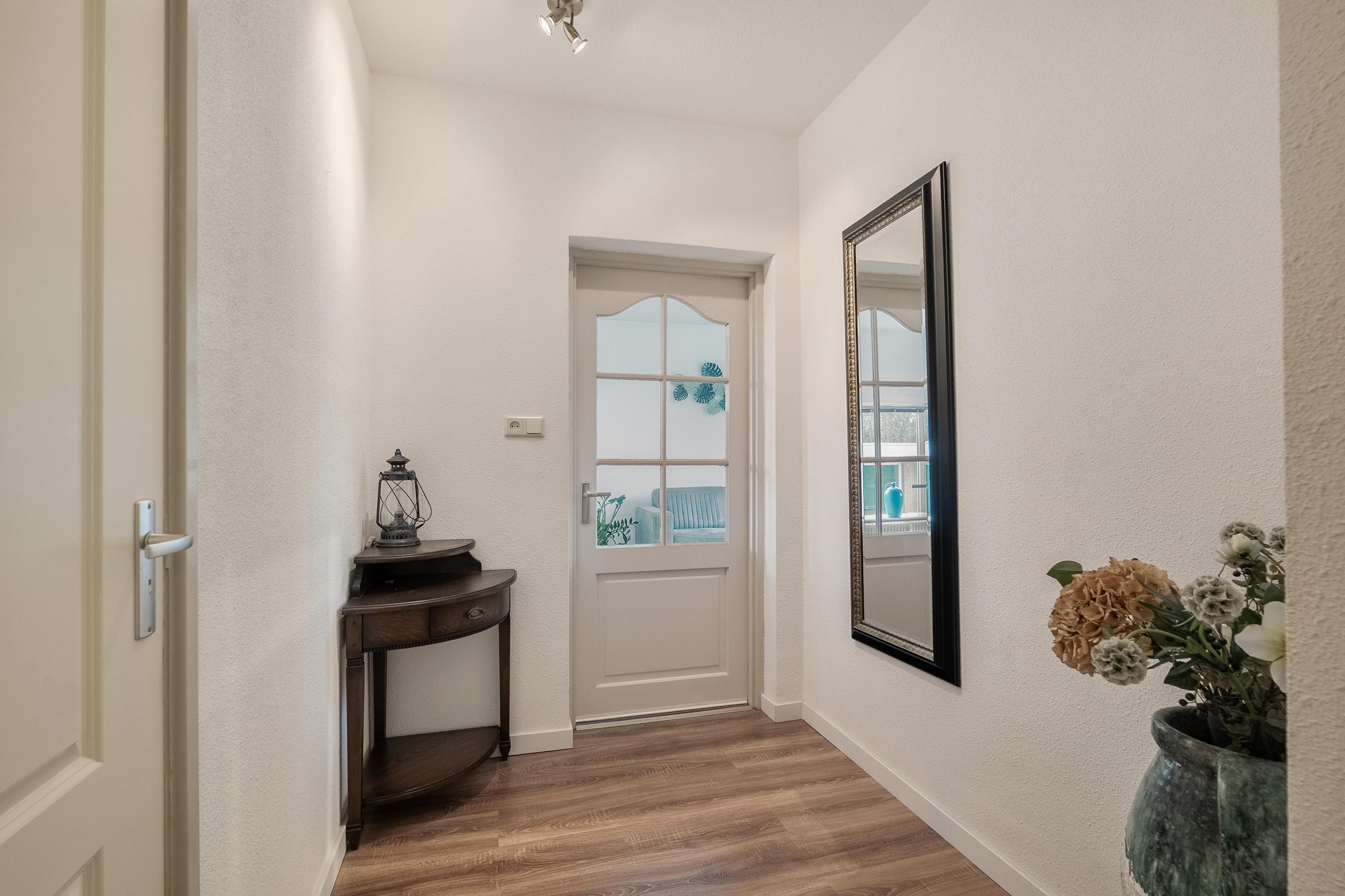 Entree, ruime hal met meterkast en toegang tot alle vertrekken, toiletruimte voorzien van een hangcloset toilet. De toiletruimte is geheel betegeld in een neutrale kleurstelling.