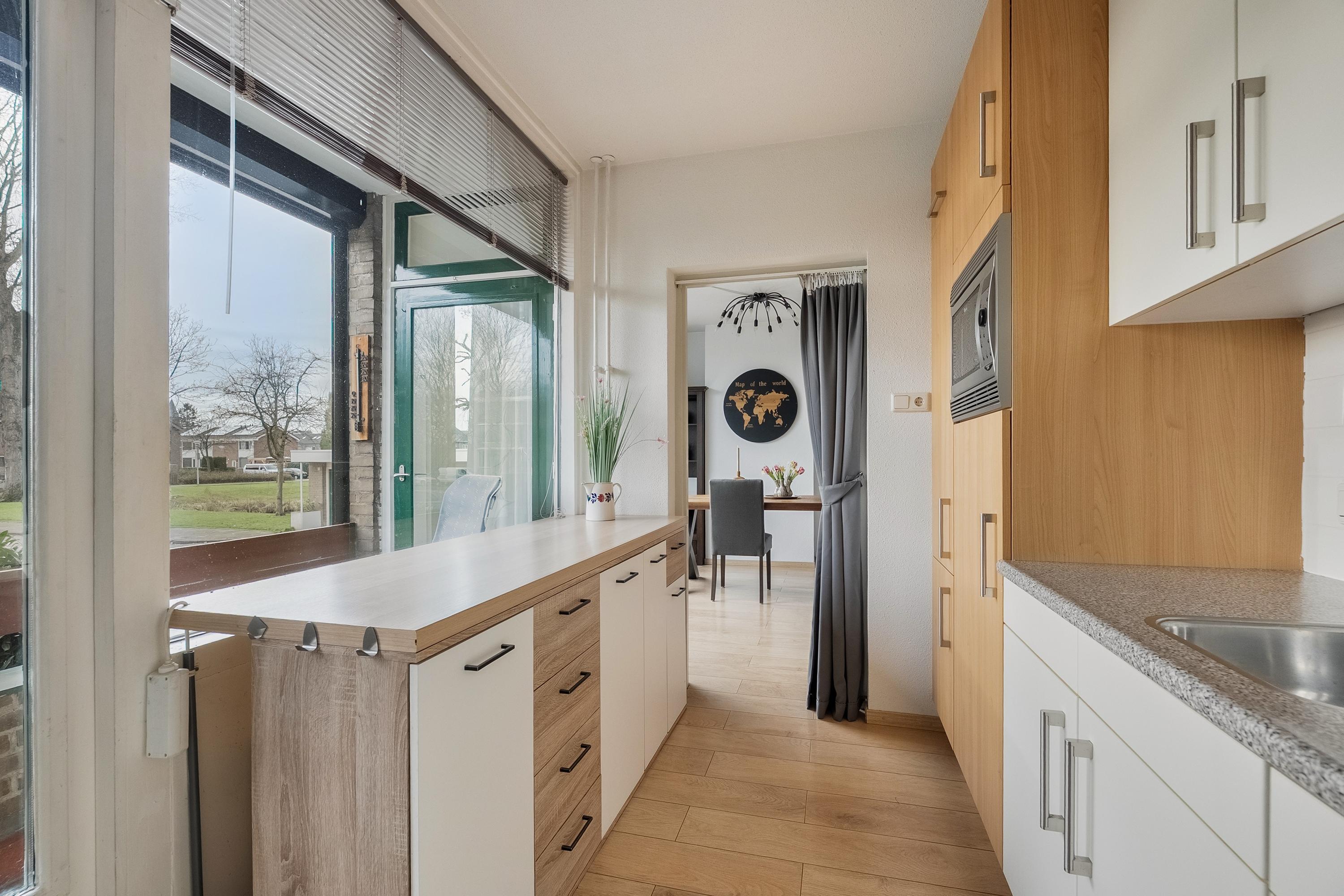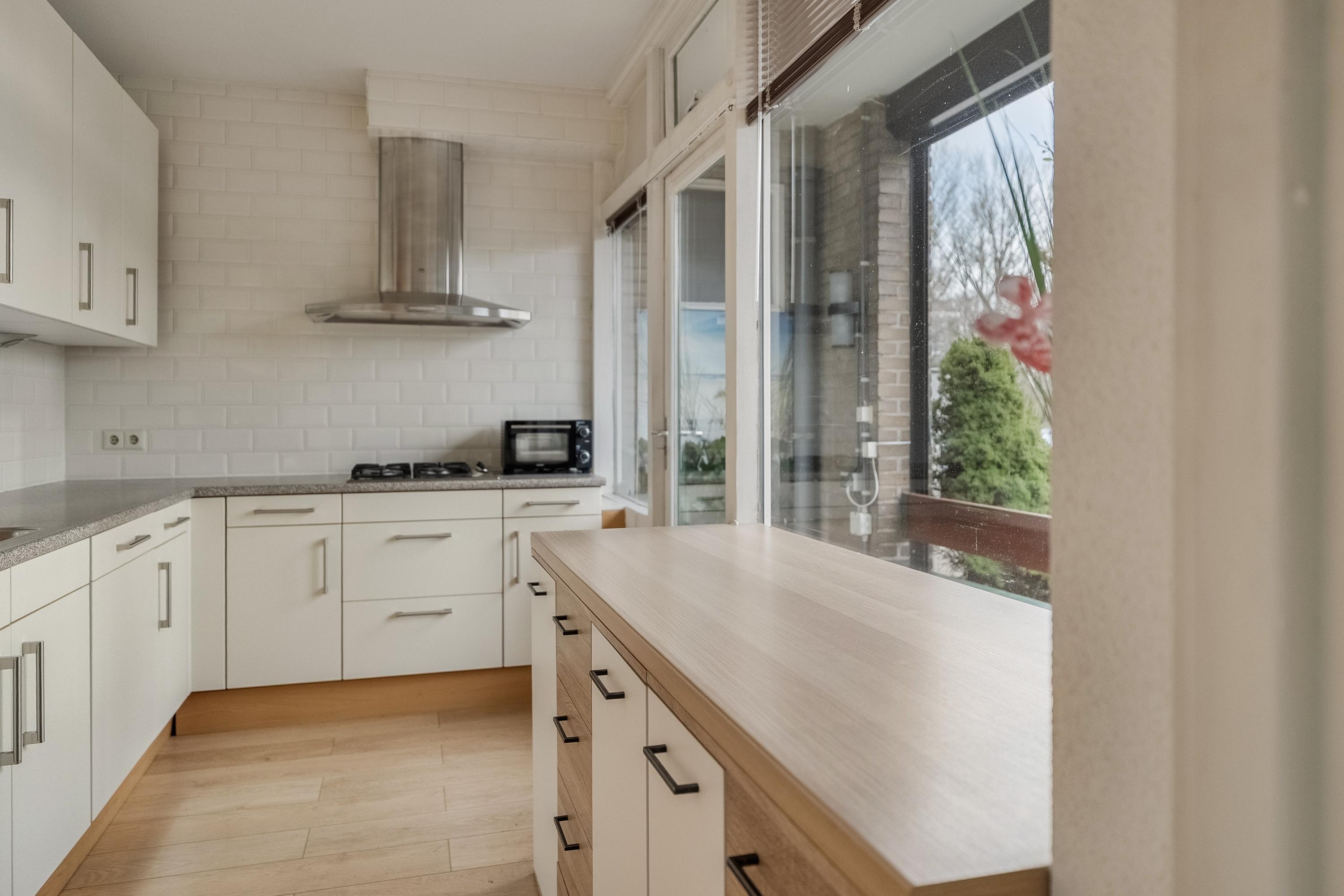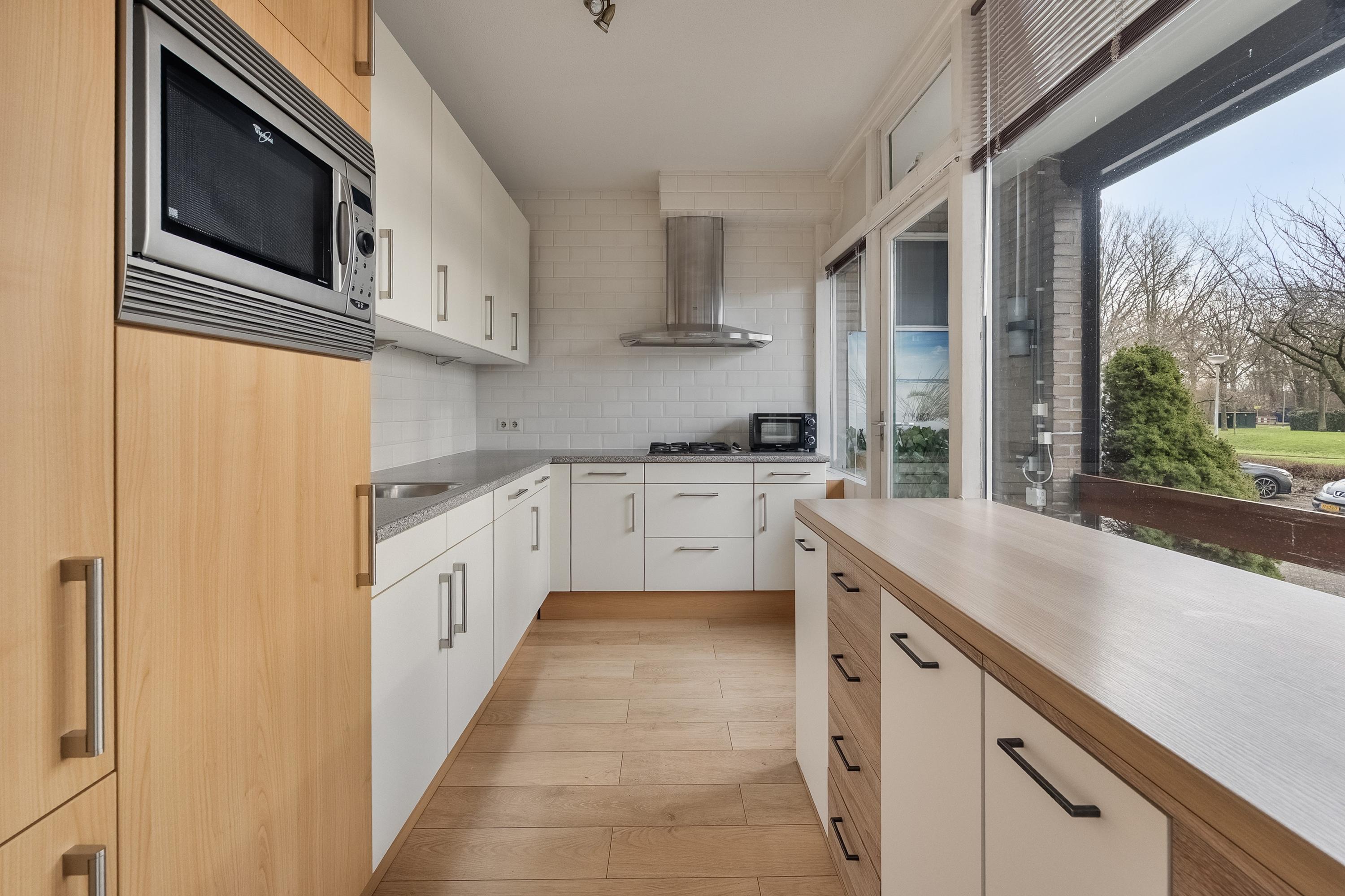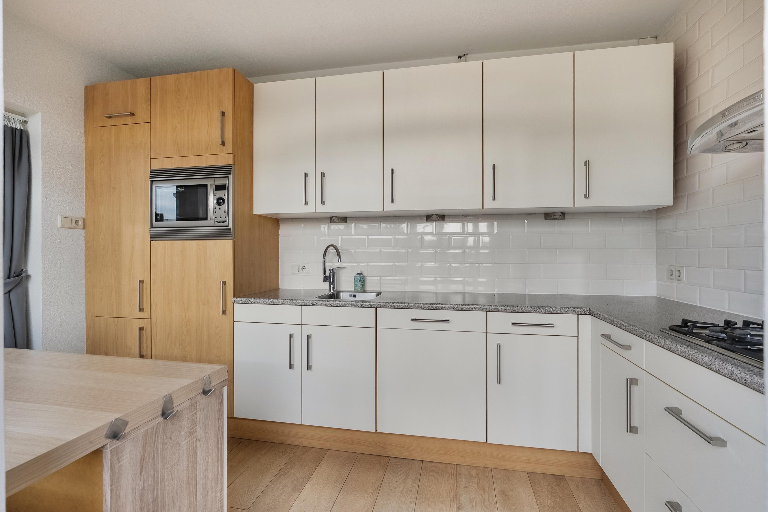 De keuken (ca. 8 m2) is gelegen aan de achterzijde van het complex en is uitgevoerd in een L-opstelling. De keuken is voorzien van diverse inbouwapparatuur zoals een koelkast met vrieslade, 4-pits gaskookplaat, afzuigkap. combimagnetron en een vaatwasser. Verder is de keuken voorzien van een enkele spoelbak en voldoende kastruimte. Het geheel is uitgevoerd in wit en is afgewerkt met een kunststof aanrechtblad, laminaatvloer, deels betegelde wanden en verlichting. Door middel van een balkondeur heeft u toegang tot het zonnige balkon.
