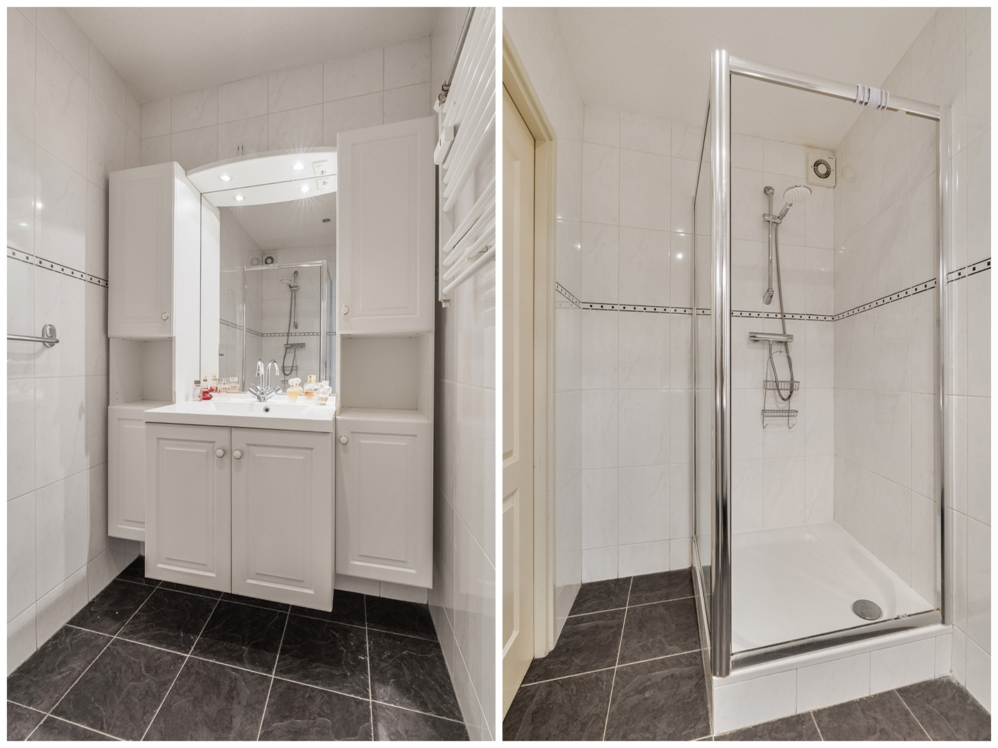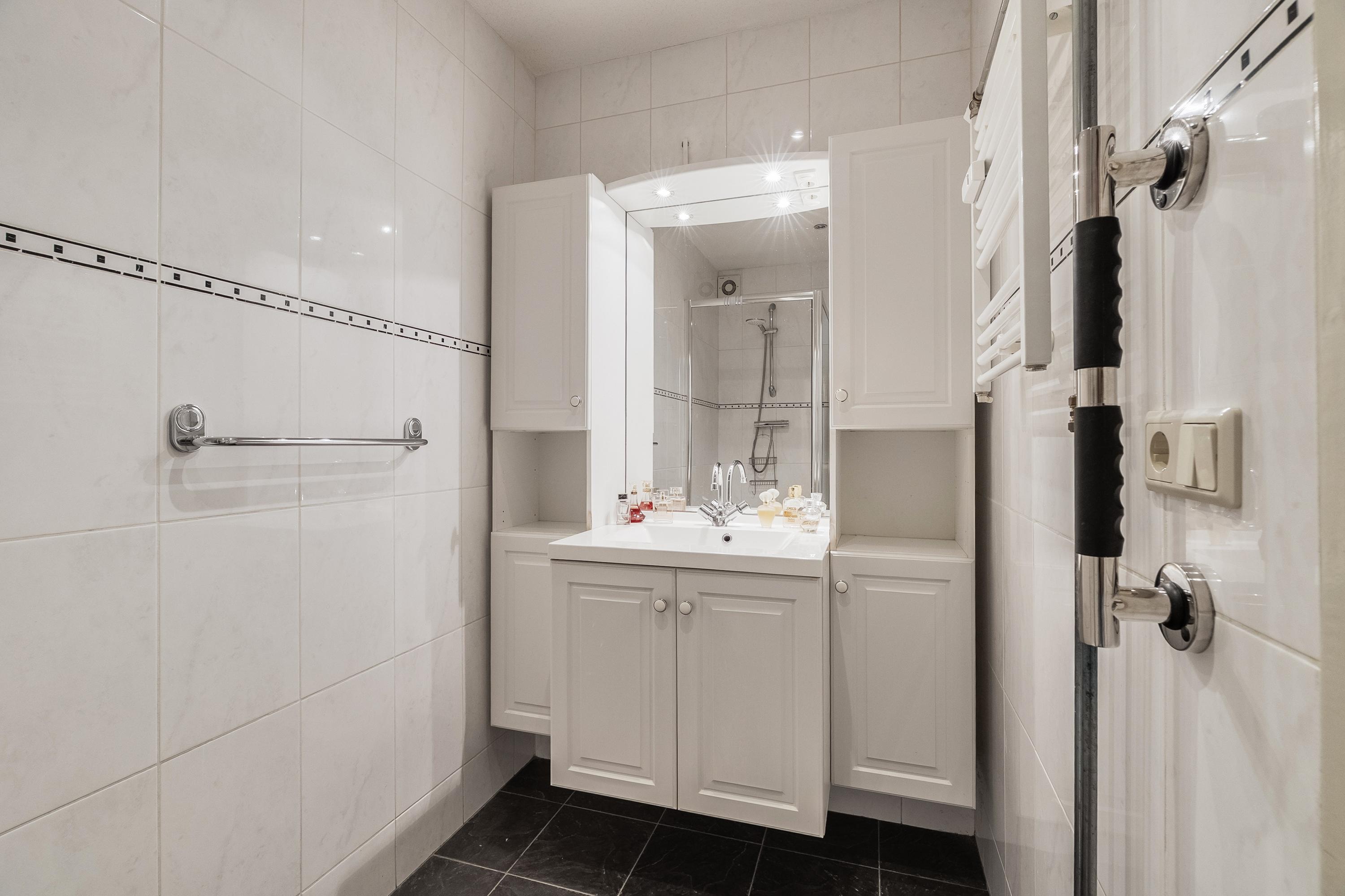 Badkamer (ca. 3 m2) met sanitaire voorzieningen zoals een wastafel met wastafelmeubel, spiegel, verlichting, designradiator en een douchecabine. De badkamer is geheel betegeld in een lichte kleurstelling en afgewerkt met afzuigsysteem en spotjes.