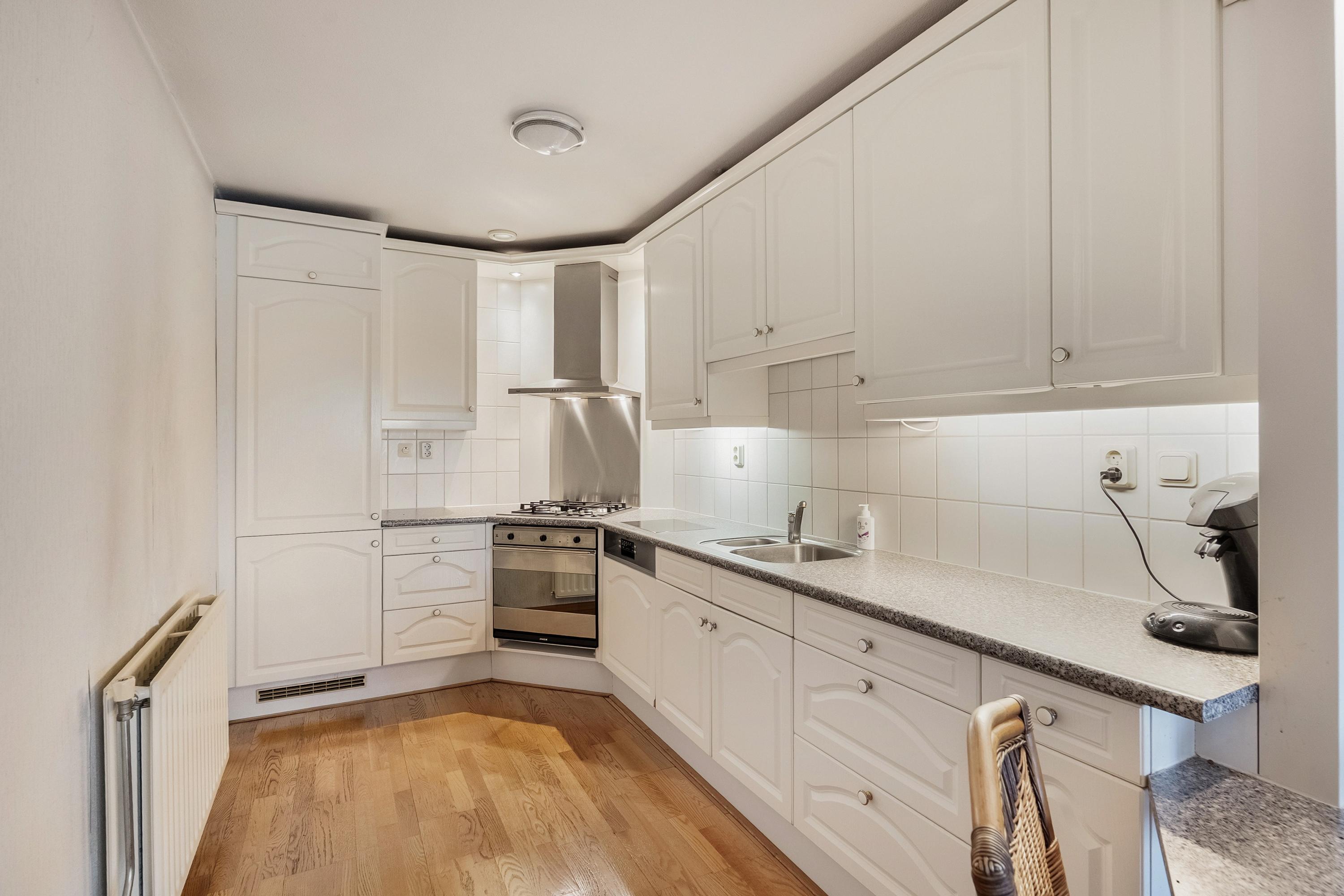 De open keuken is uitgevoerd in een hoekopstelling met eetbar en is afgewerkt in lichte kleuren. De keuken is voorzien van diverse inbouwapparatuur, waaronder een koel-vriescombinatie, 4-pits gaskookplaat, RVS afzuigkap, oven en een vaatwasser (circa 2 jaar oud). Het geheel is afgewerkt met een kunststof aanrechtblad en een 1,5 spoelbak.