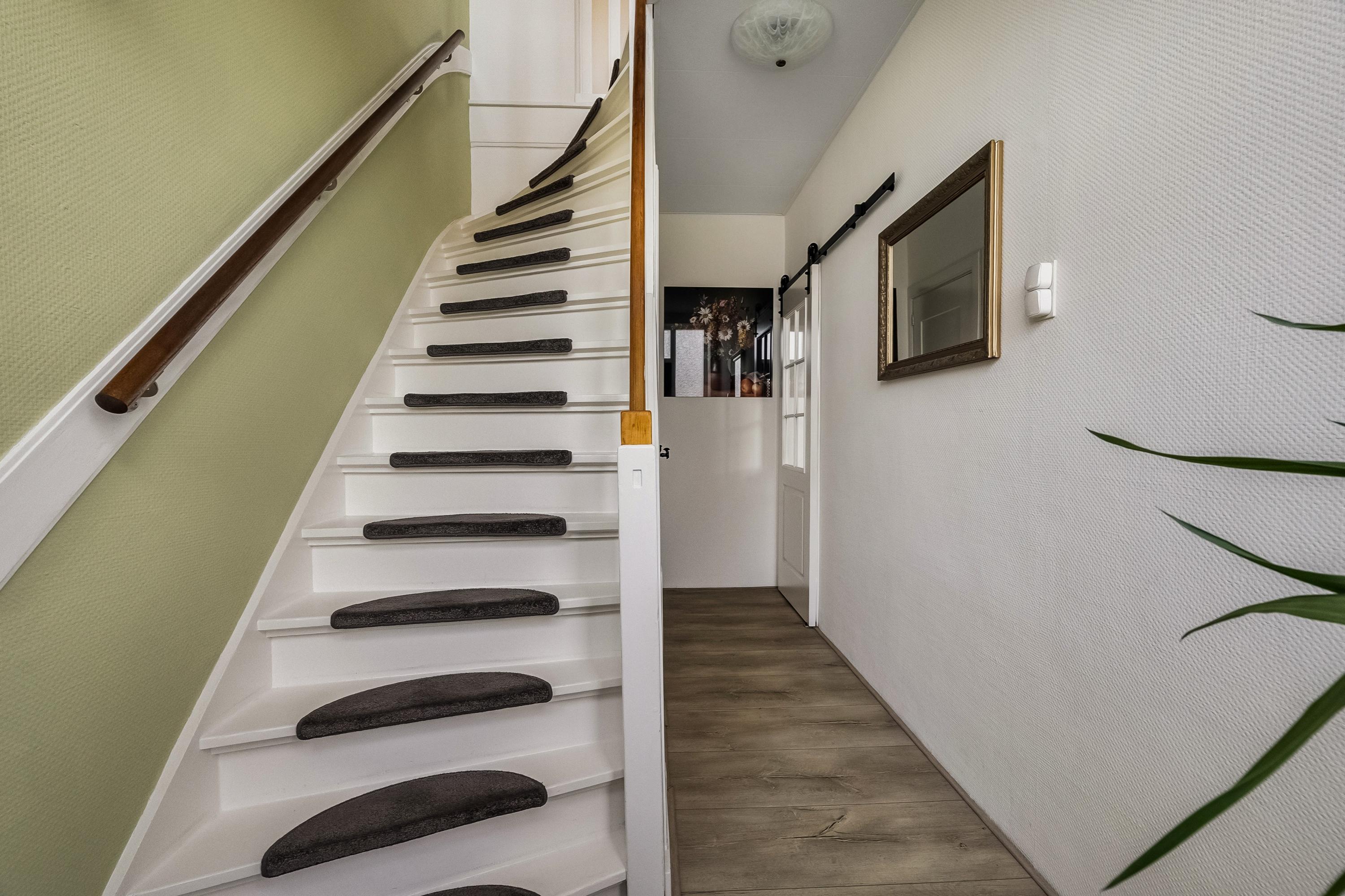 Entree, hal met meterkast en trap naar de 1e verdieping, toegang tot keldertje/voorraadkast. Toiletruimte voorzien van een hangend toilet. De toiletruimte is geheel betegeld in een wit/grijs kleurstelling en is afgewerkt met spotje en afzuigsysteem. Middels een schuifdeur heeft u toegang tot de woonkamer.