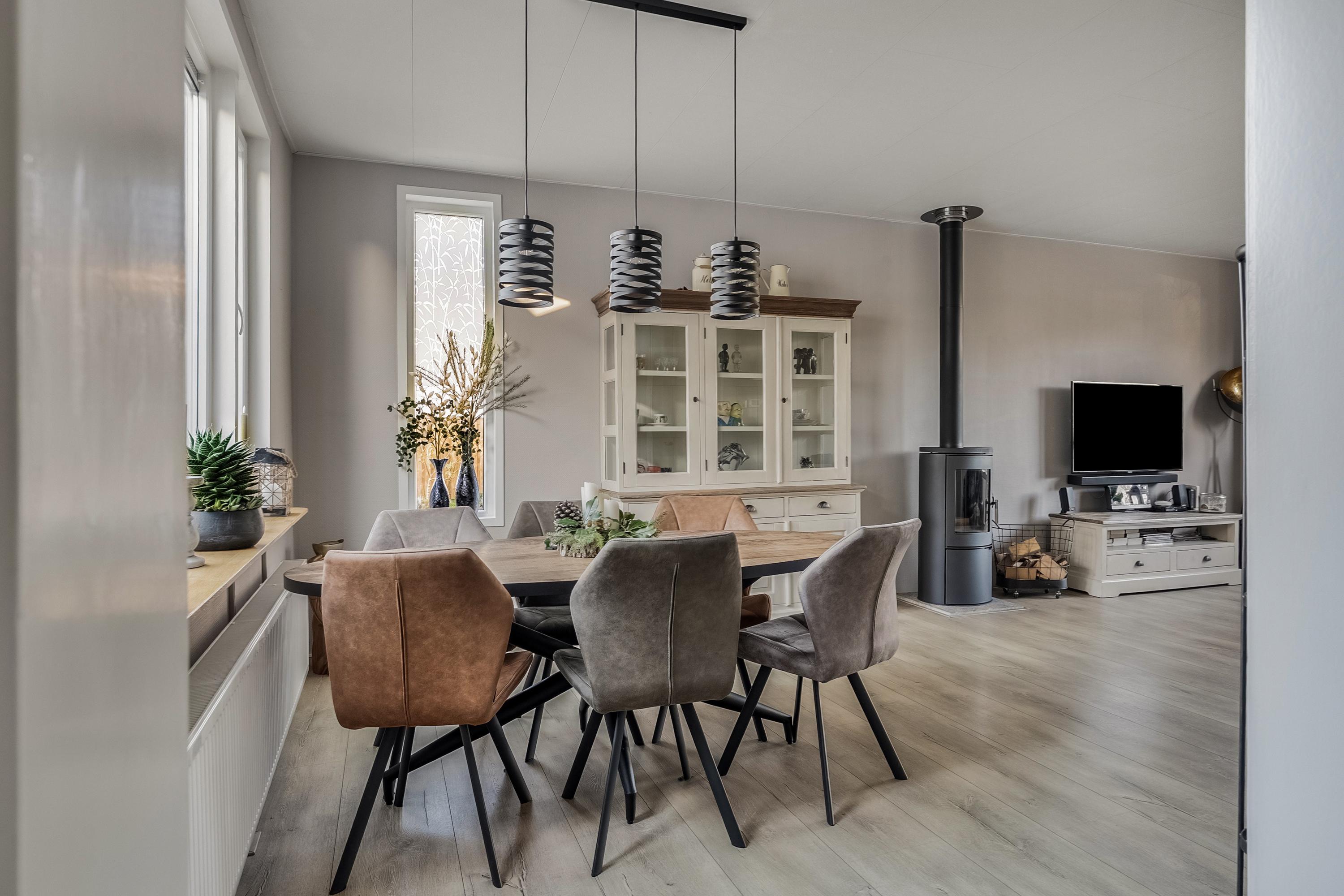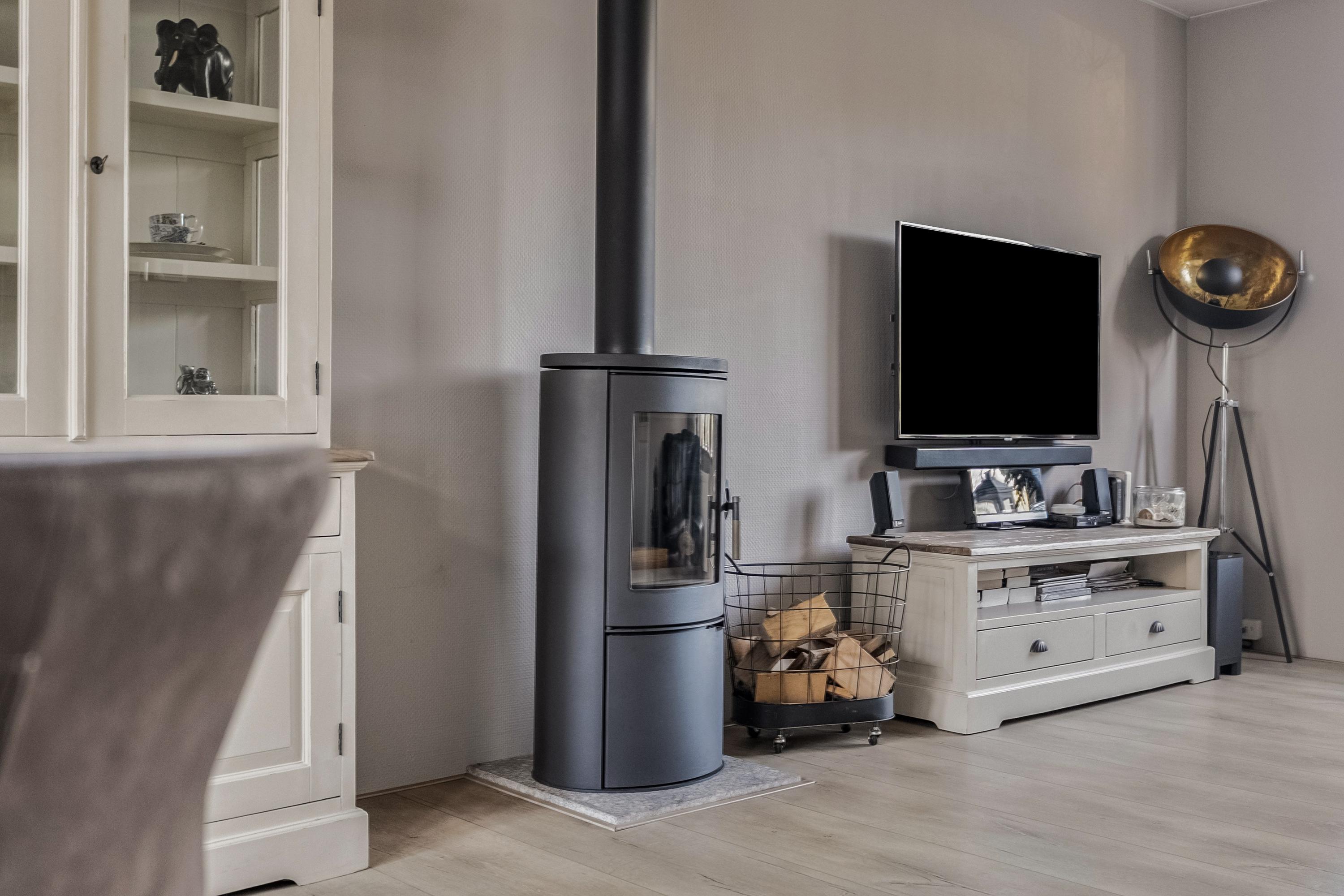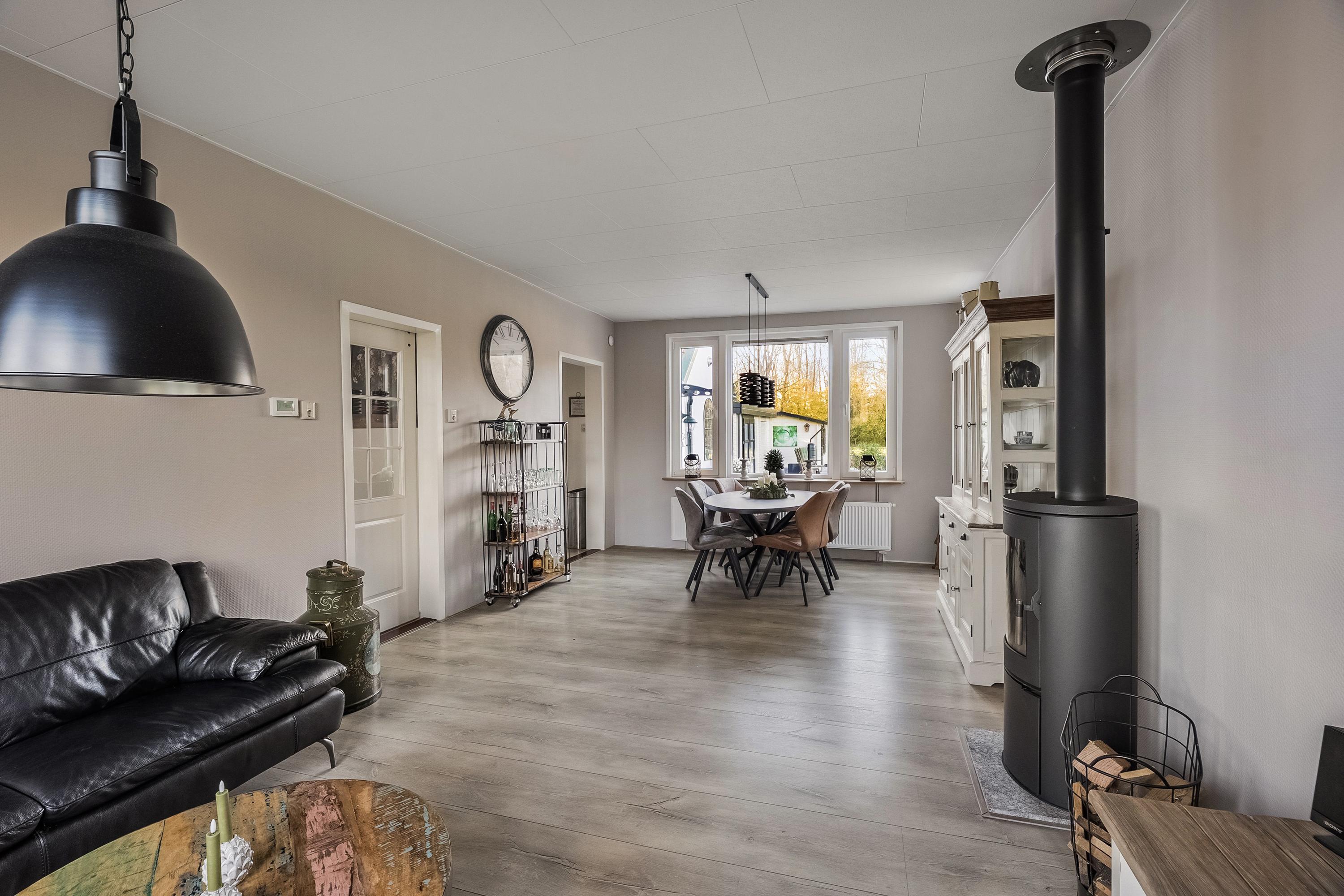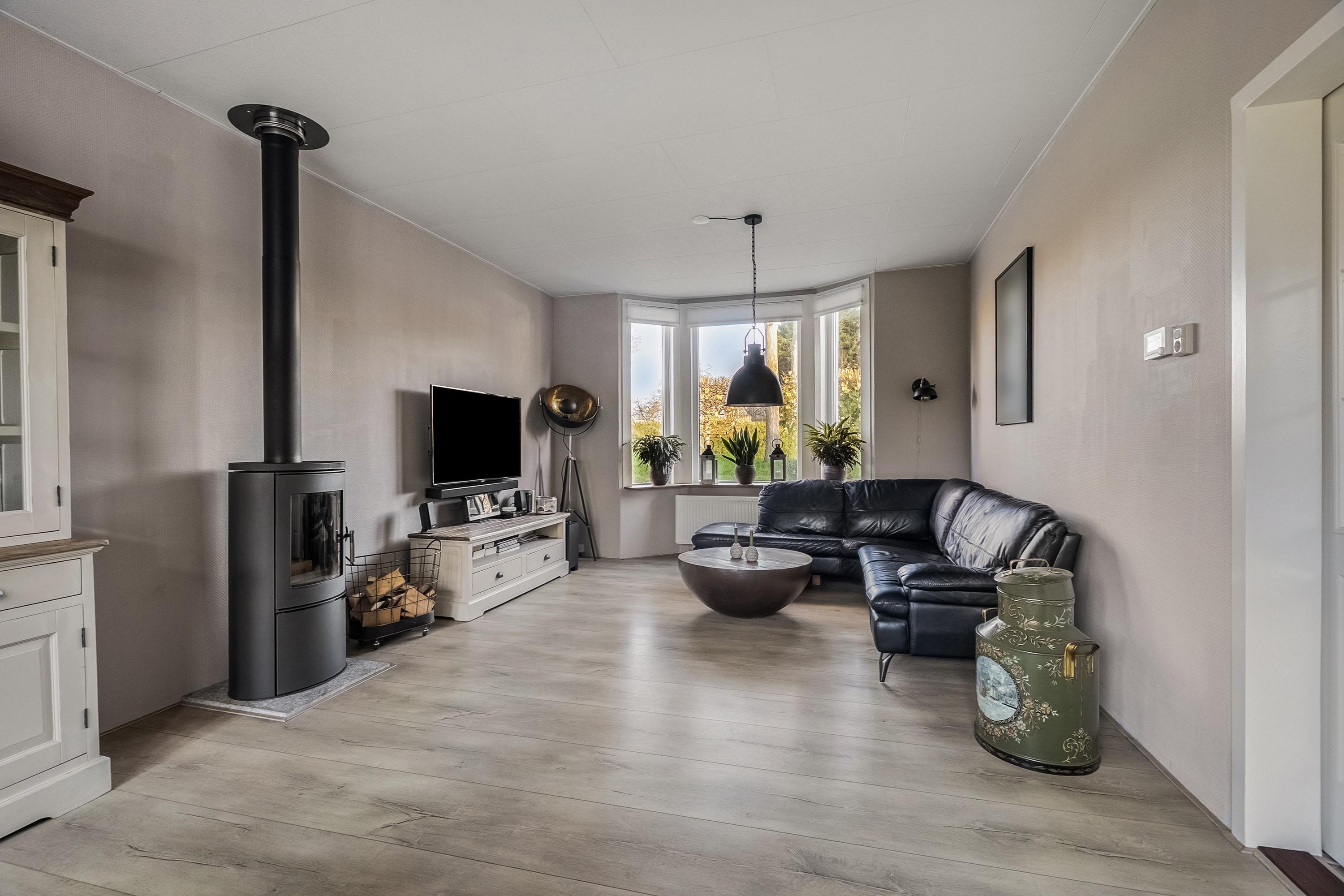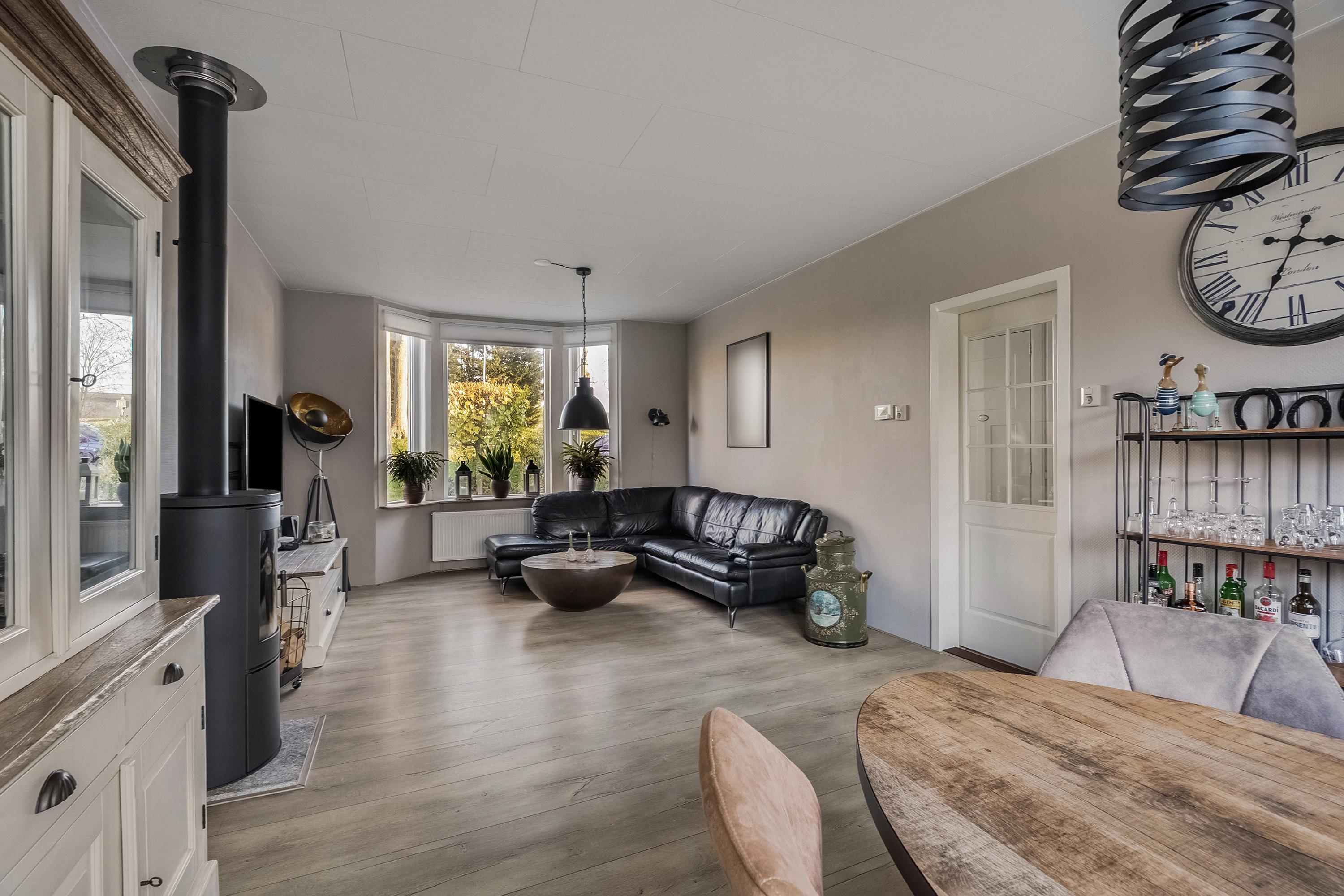 - Doorzon woonkamer met een sfeervolle houtkachel en een erker aan de voorkant;