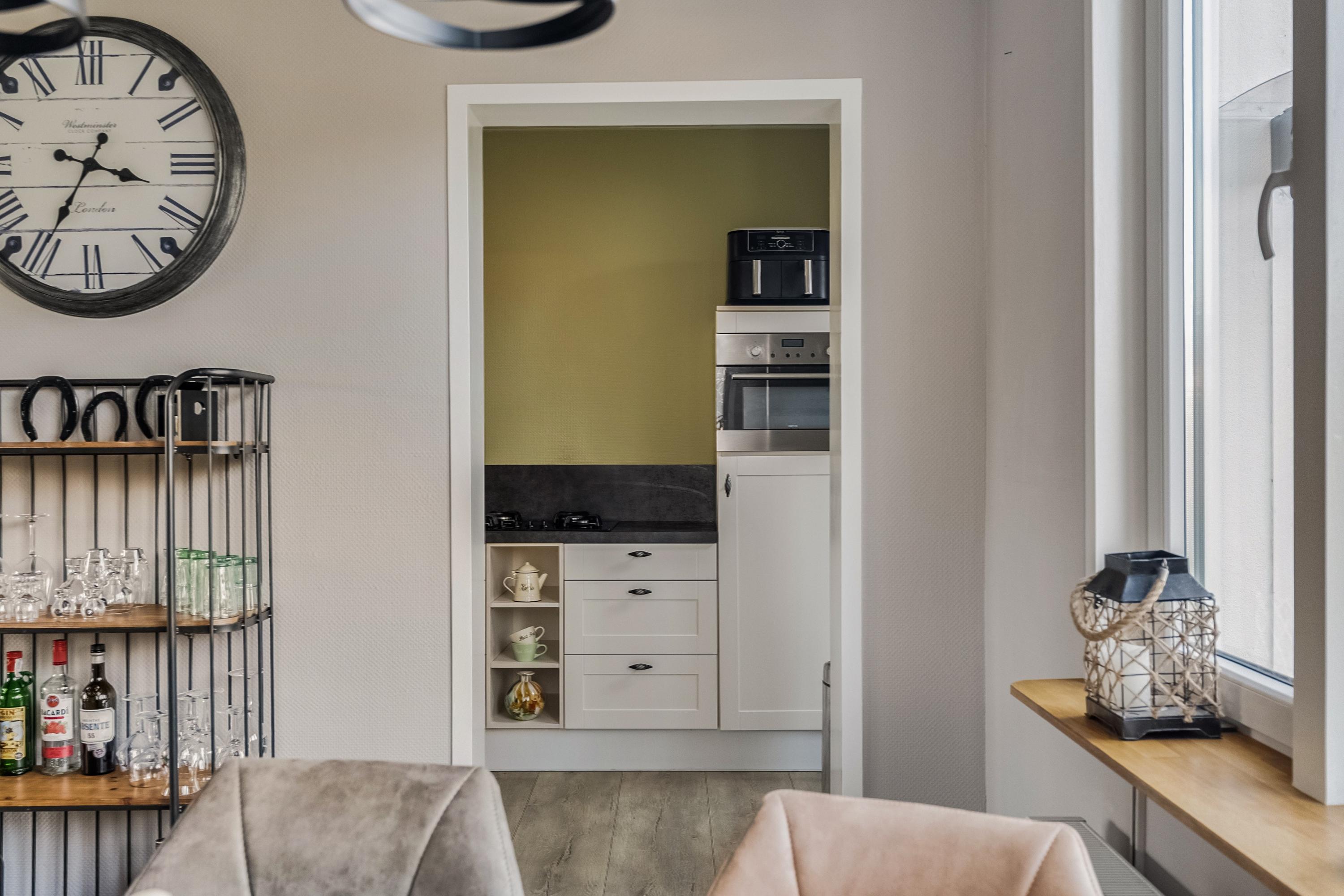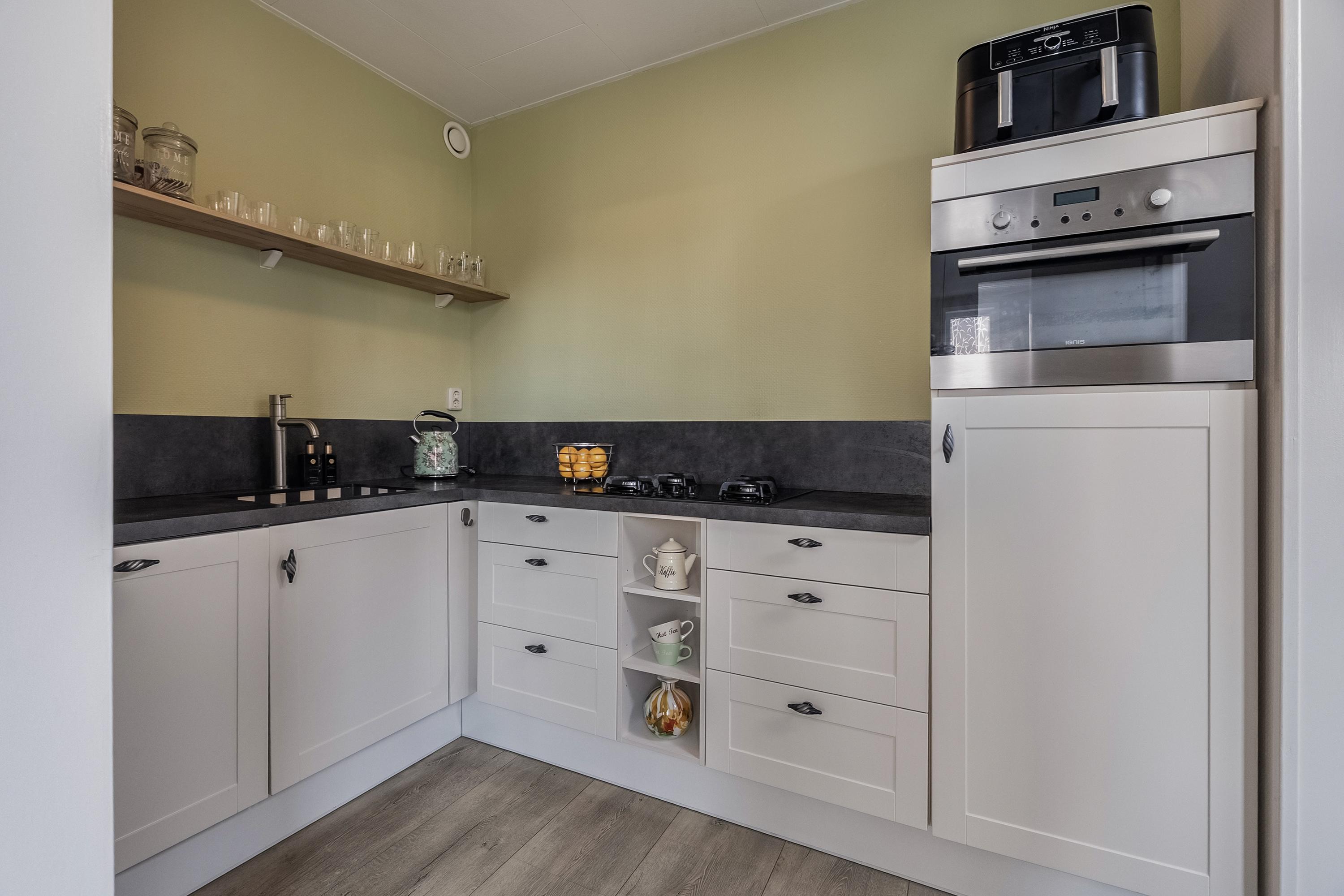 De halfopen keuken (ca. 5 m2) is gelegen aan de achterzijde van de woning en is uitgevoerd in een L-opstelling. De keuken is voorzien van een enkele spoelbak, koelkast, 4-pits gaskookplaat, RVS afzuigkap, combimagnetron en een vaatwasser. Het geheel is uitgevoerd in houtkleur en afgewerkt met een kunststof aanrechtblad en laminaatvloer. Via de keuken bereikt u de bijkeuken.