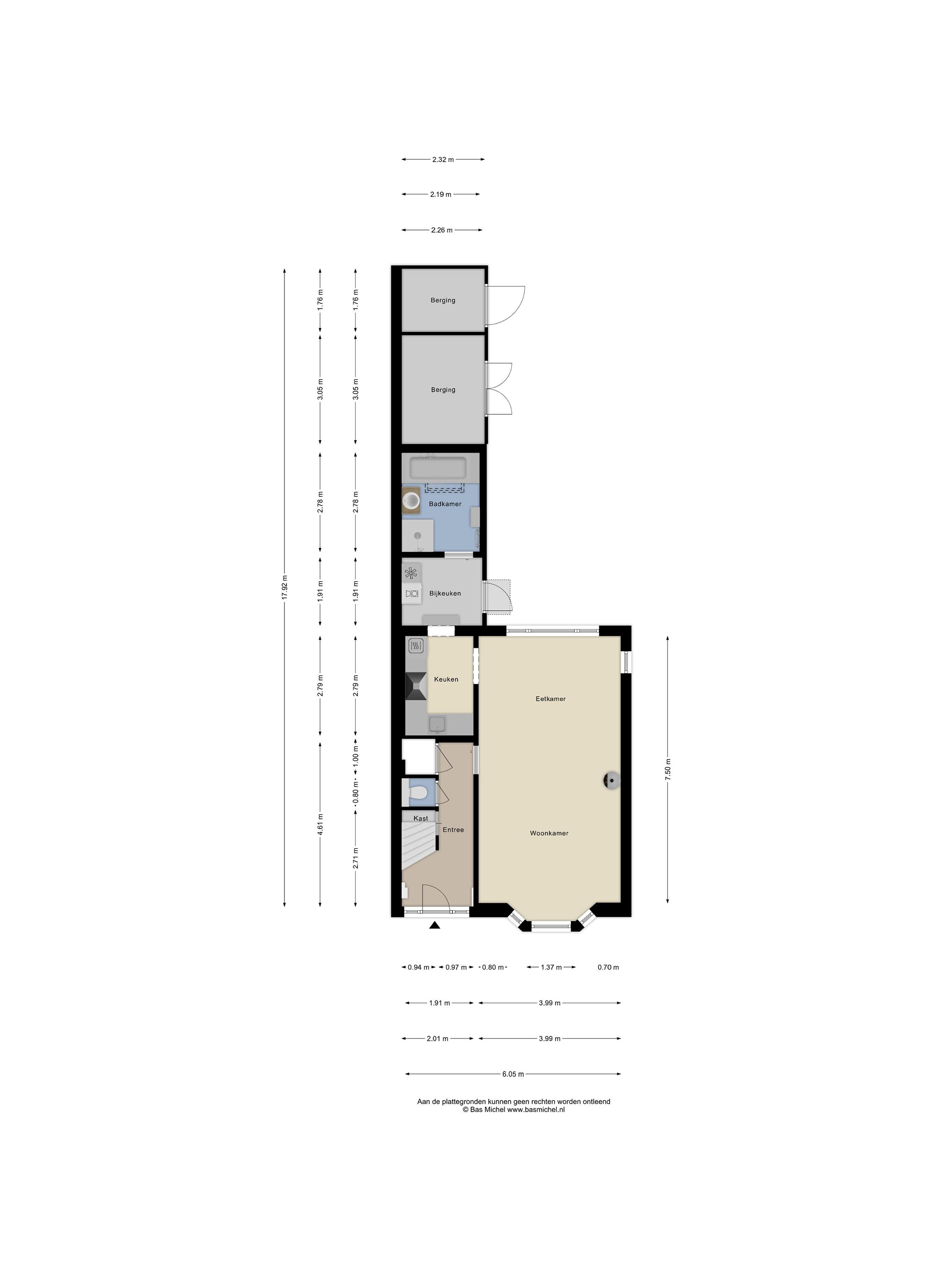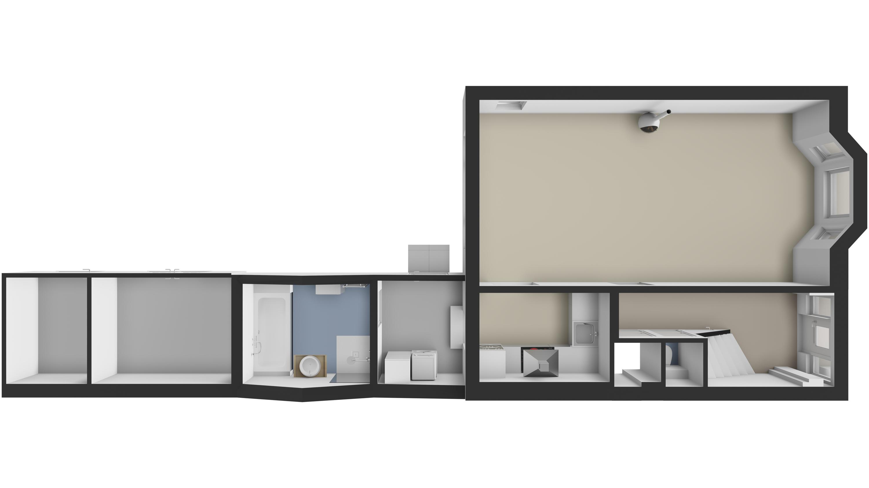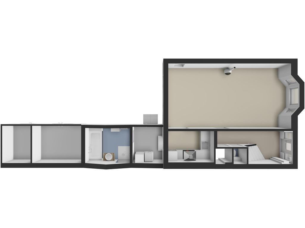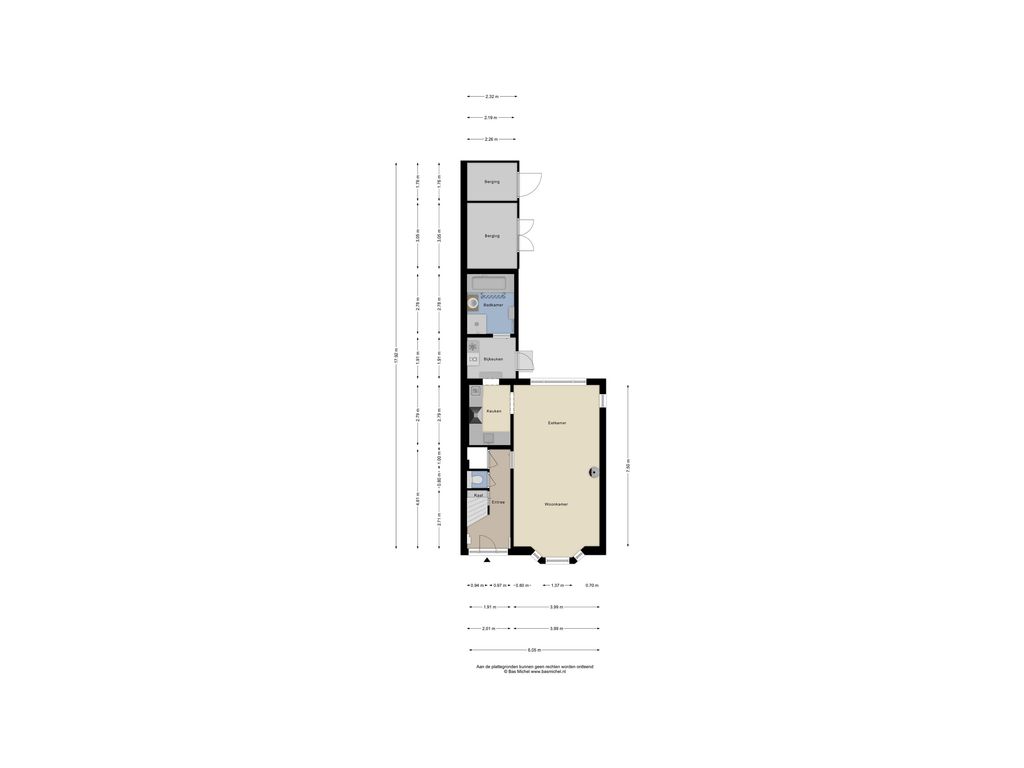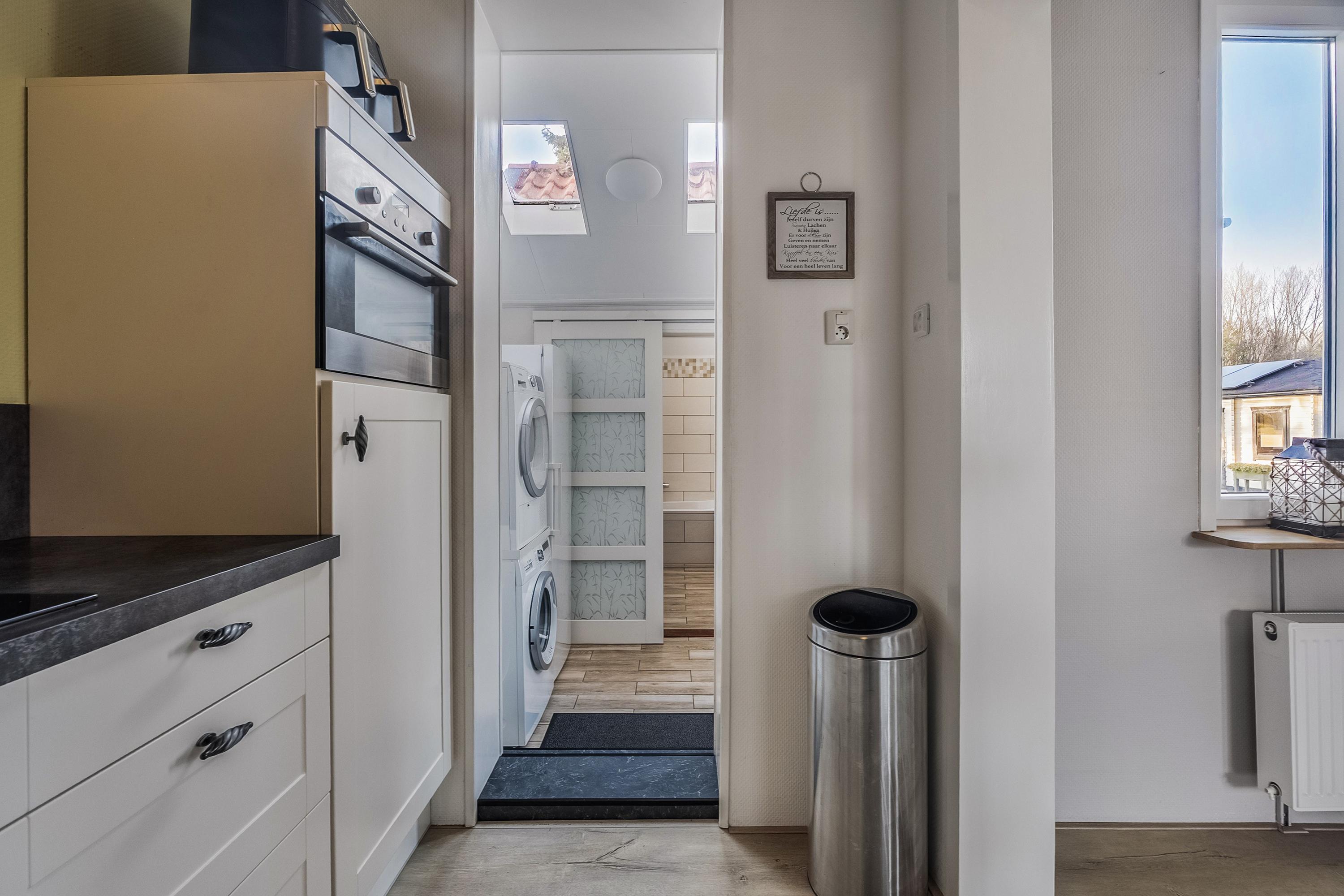 Bijkeuken (ca. 4 m2) met de wasmachine- en drogeraansluiting. De twee dakramen bieden voldoende natuurlijke lichtinval. De bijkeuken is verder voorzien van tegelvloer en wandtegels. De badkamer is via een schuifdeur bereikbaar. Via de bijkeuken heeft u toegang tot de achtertuin.