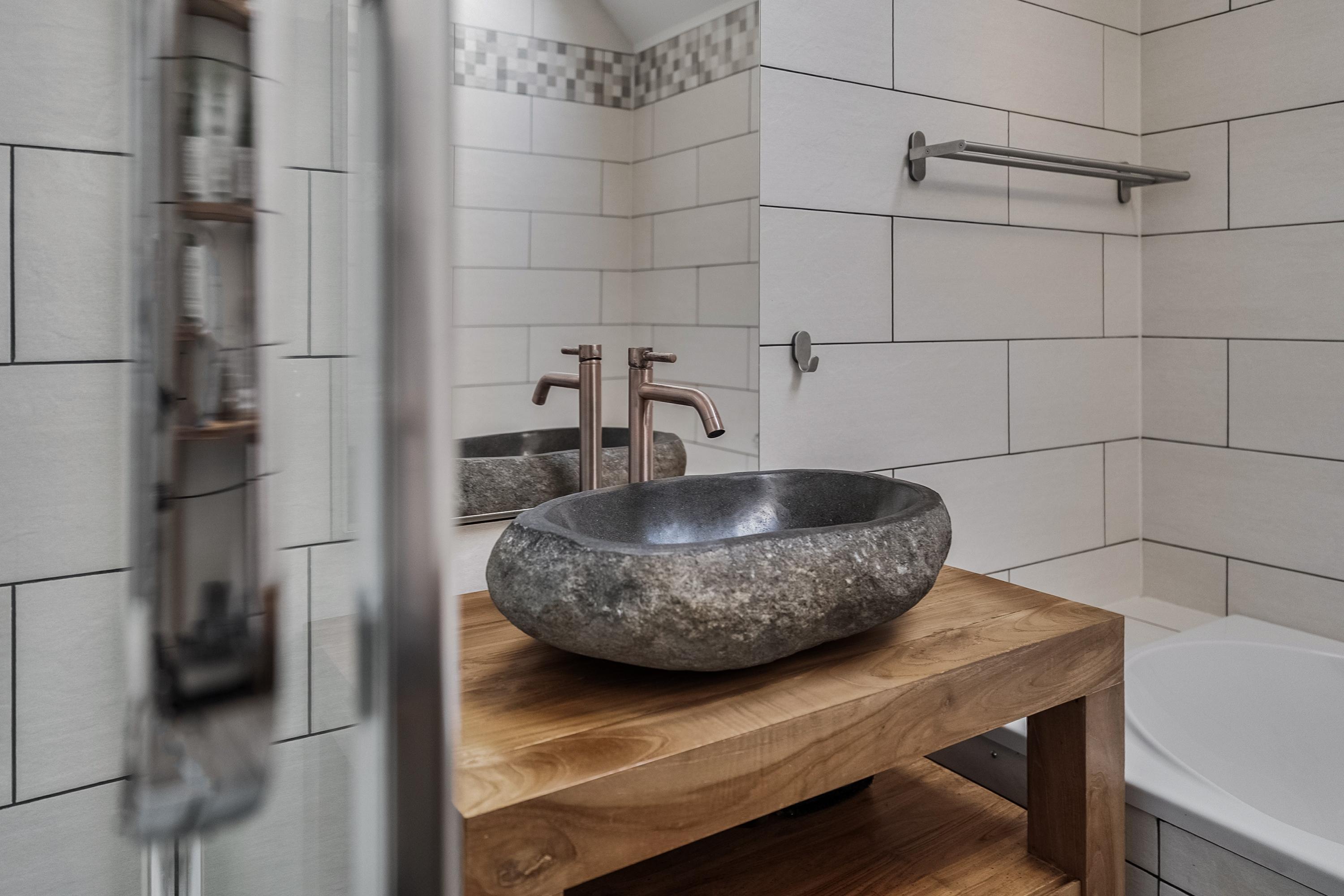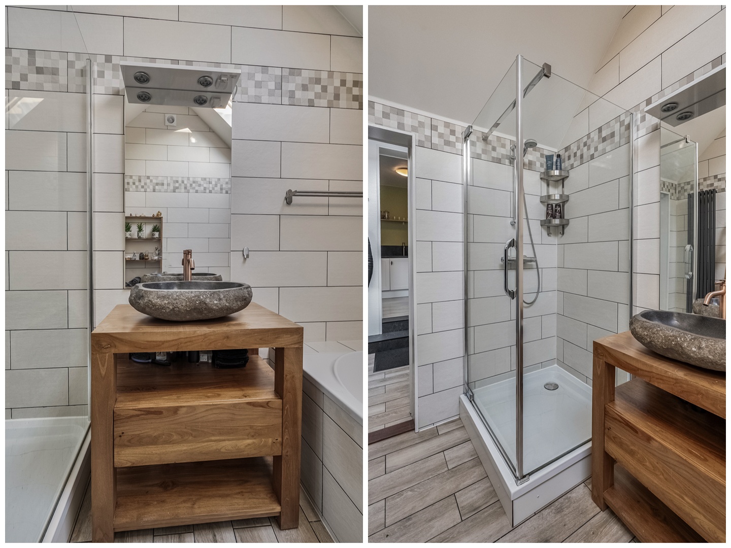 Moderne badkamer (ca. 6 m2) met sanitaire voorzieningen zoals een bubbelbad, een wastafel met wastafelmeubel, spiegel, verlichting, douchecabine met douche en designradiator. De badkamer is geheel betegeld en afgewerkt met houtlook tegelvloer. Het grote dakraam zorgt voor voldoende natuurlijk daglicht in de badkamer.