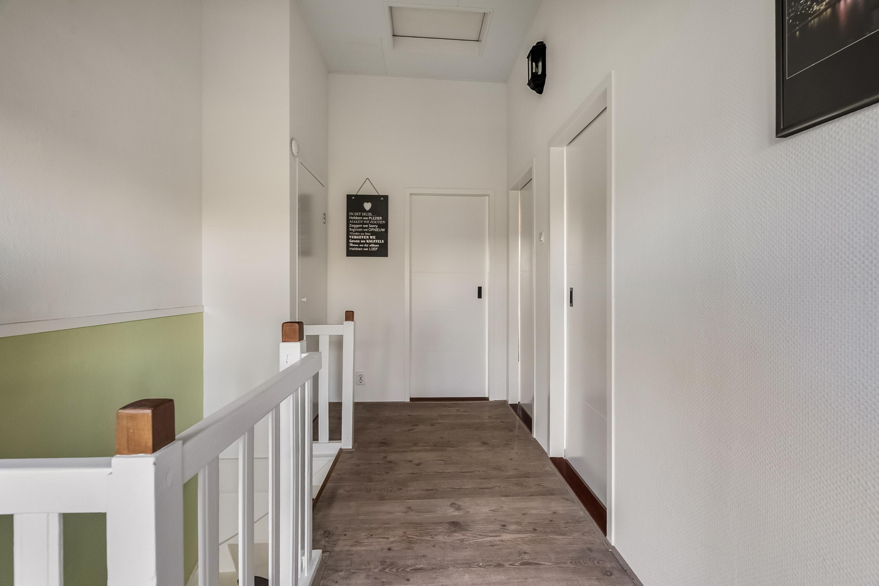 Ruime overloop met een vaste bergkast met stelplaats voor de HR C.V. combiketel (Remeha 2015). Dankzij de dakkapel aan de voorzijde van de woning biedt de overloop voldoende natuurlijke lichtinval. Toegang tot alle vertrekken. Via de overloop is de bergvliering bereikbaar.