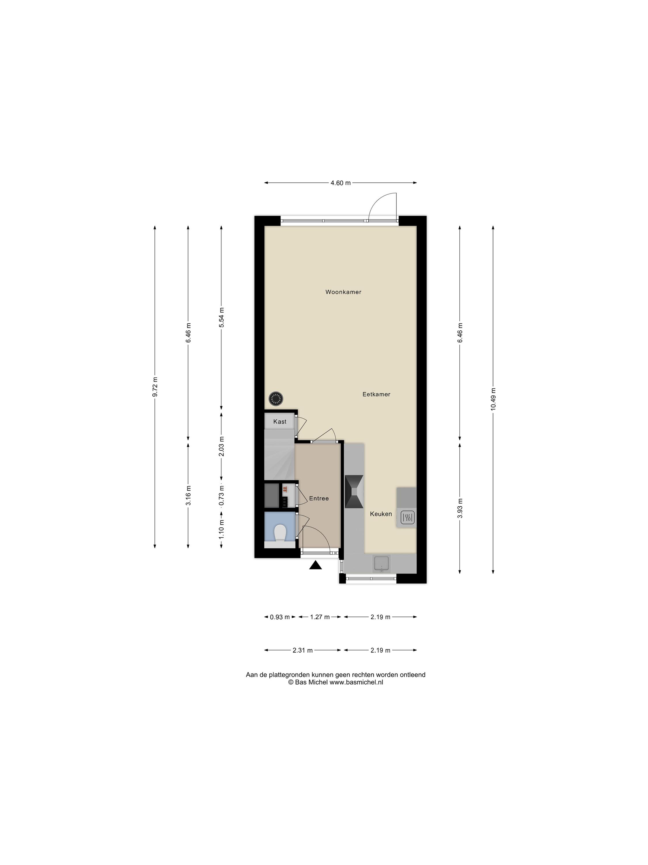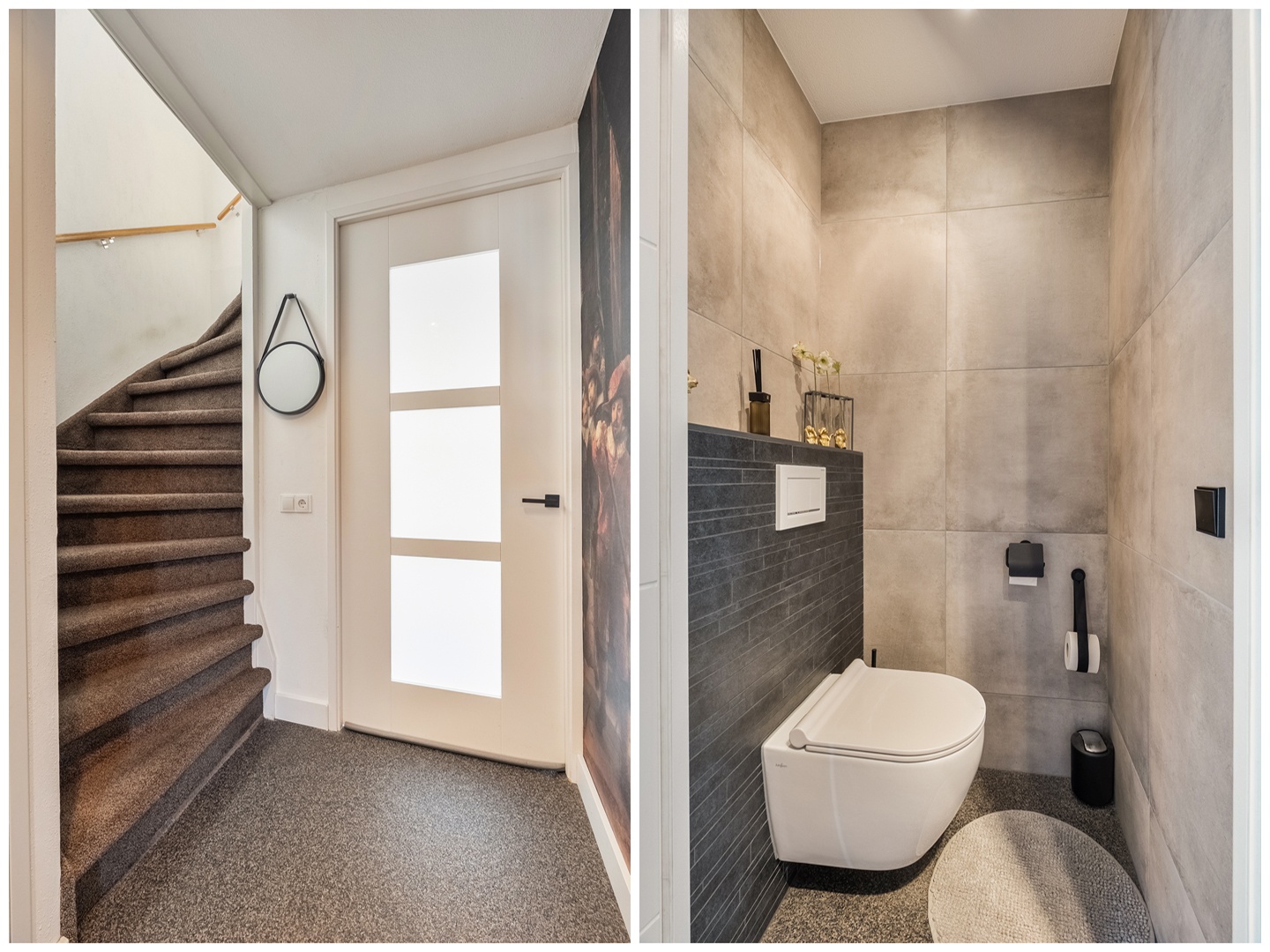 Via de ruime hal met meterkast betreed je de woning. Hier bevindt zich tevens de volledig betegelde toiletruimte in een moderne grijze kleurstelling, voorzien van een hangend toilet. De fraaie paneeldeuren en de trapopgang naar de eerste verdieping geven direct een verzorgde en sfeervolle indruk.