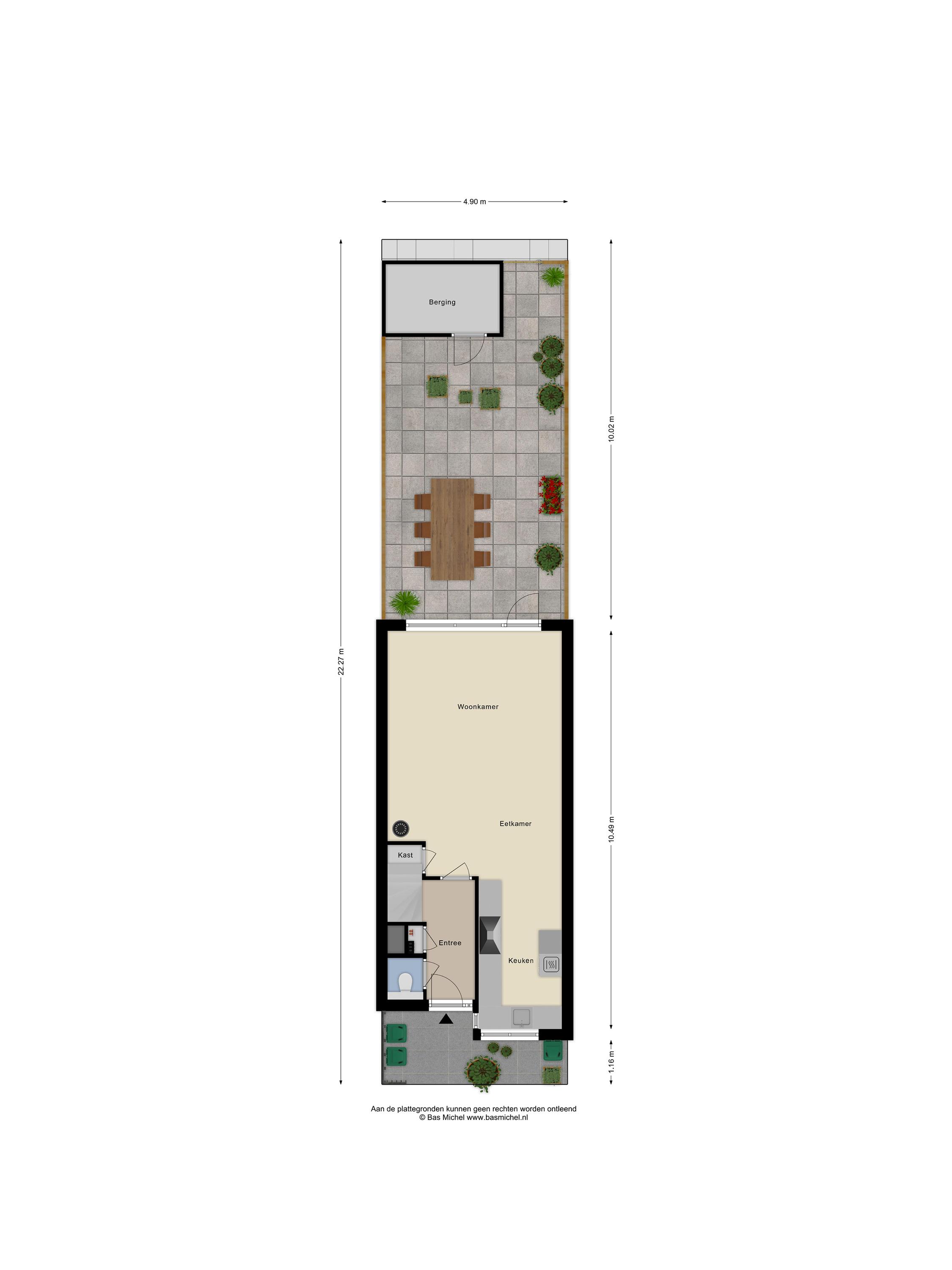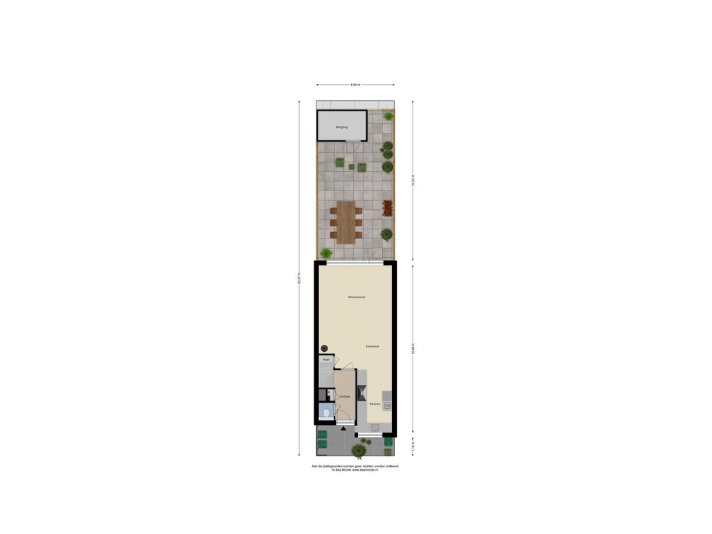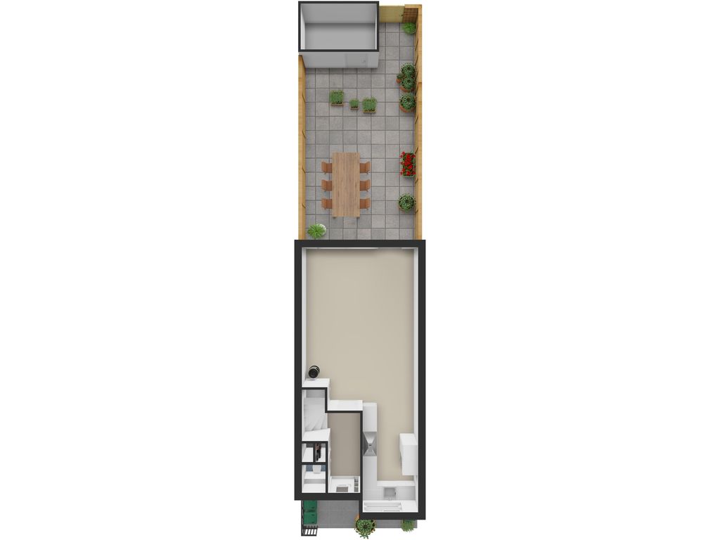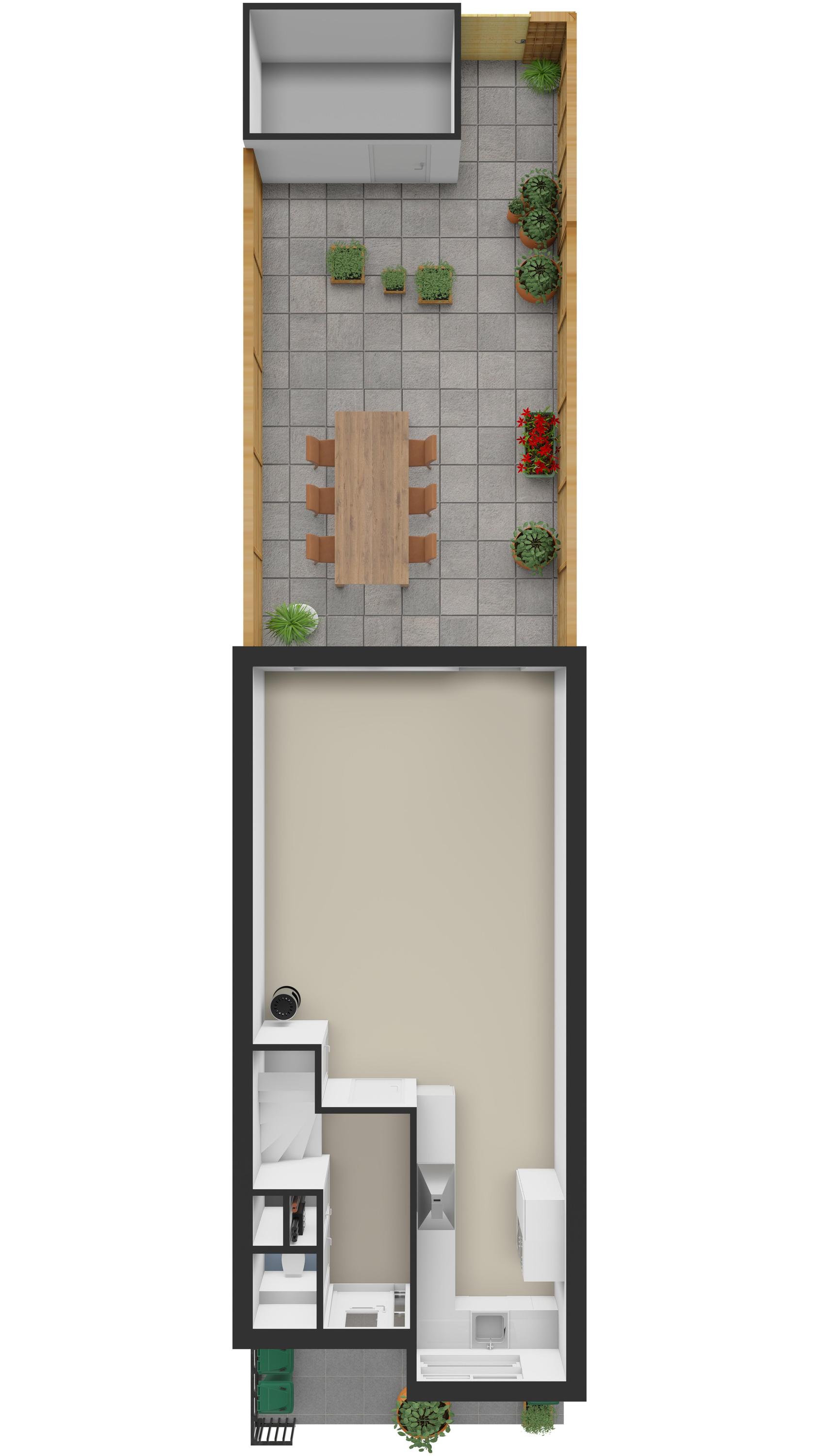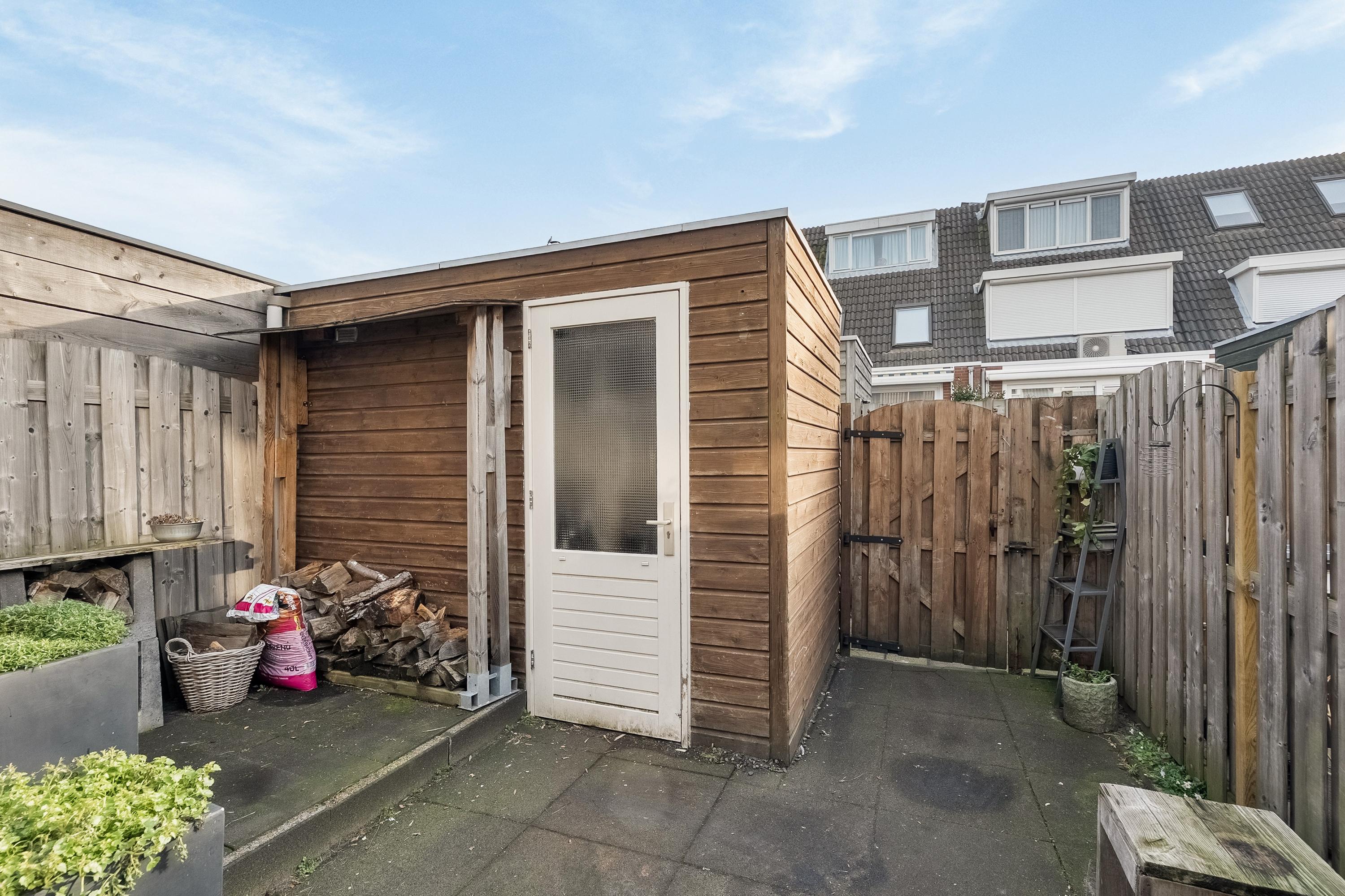 De achtertuin is gelegen op het zuidoosten en is verzorgd aangelegd met bestrating, houten schuttingen en een houten berging. De tuin is bereikbaar via een achterom en voorzien van een elektrisch bedienbaar zonnescherm, waardoor je hier optimaal van zonnige dagen kunt genieten.