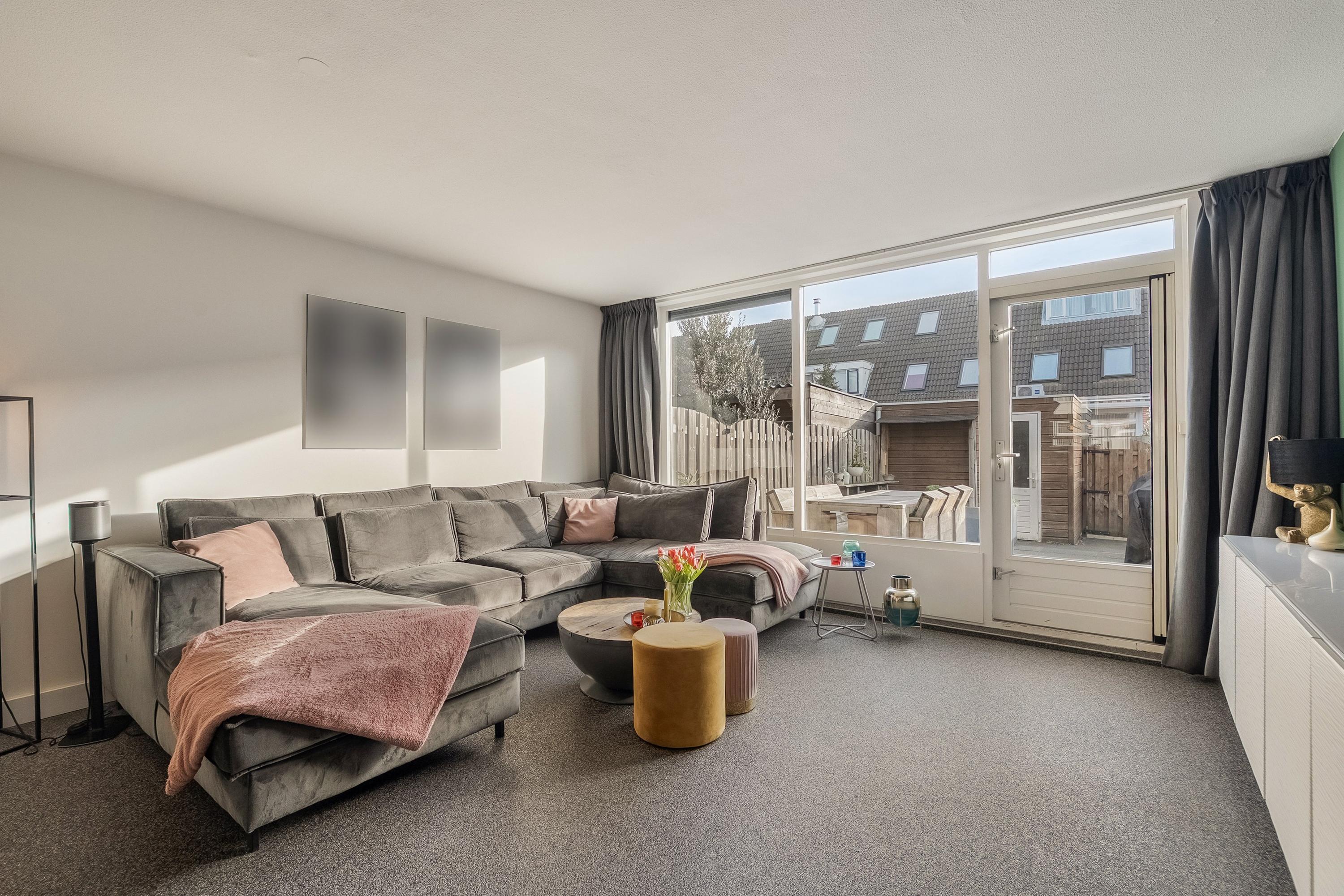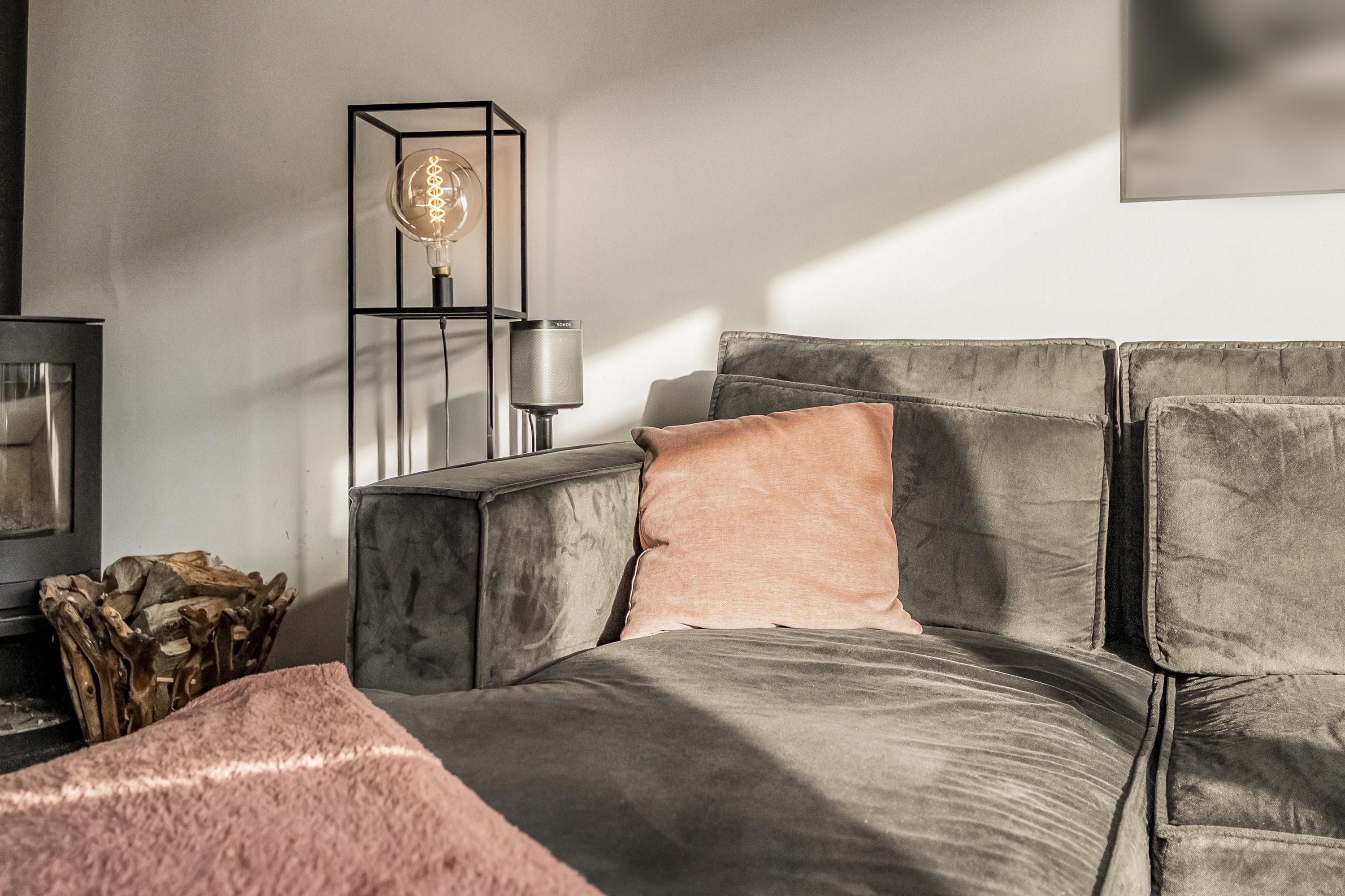 De tuingerichte woonkamer is opvallend licht dankzij de grote raampartij aan de achterzijde en biedt directe toegang tot de achtertuin. De grindvloer met comfortabele vloerverwarming zorgt voor een strakke uitstraling en aangenaam wooncomfort. In de praktische trapkast, uitgevoerd met een handige kast-in-kast, is extra bergruimte gecreëerd. De vrijstaande houtkachel vormt een sfeervol middelpunt in de woonkamer. De wanden zijn afgewerkt met een combinatie van strak stucwerk en behang.
