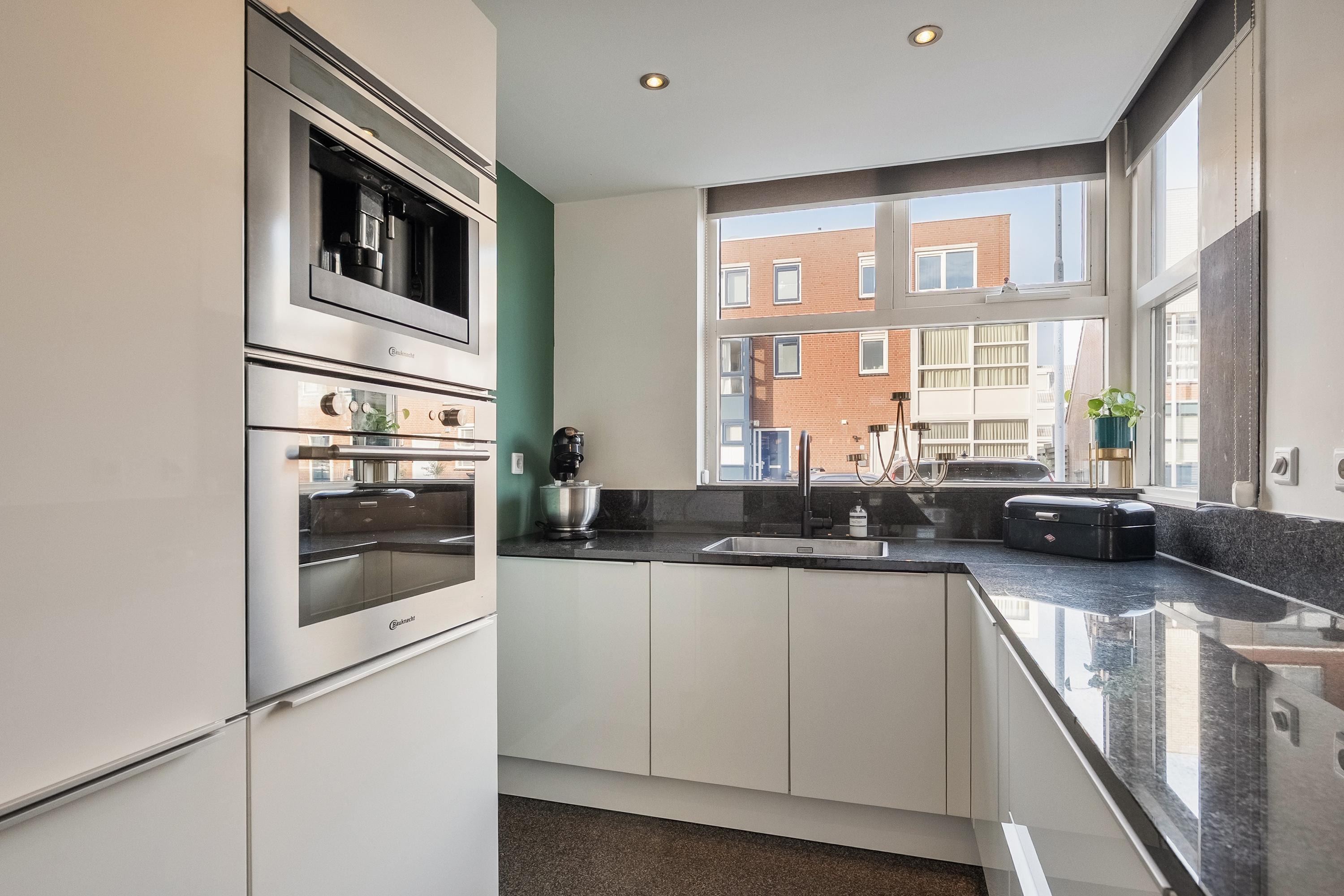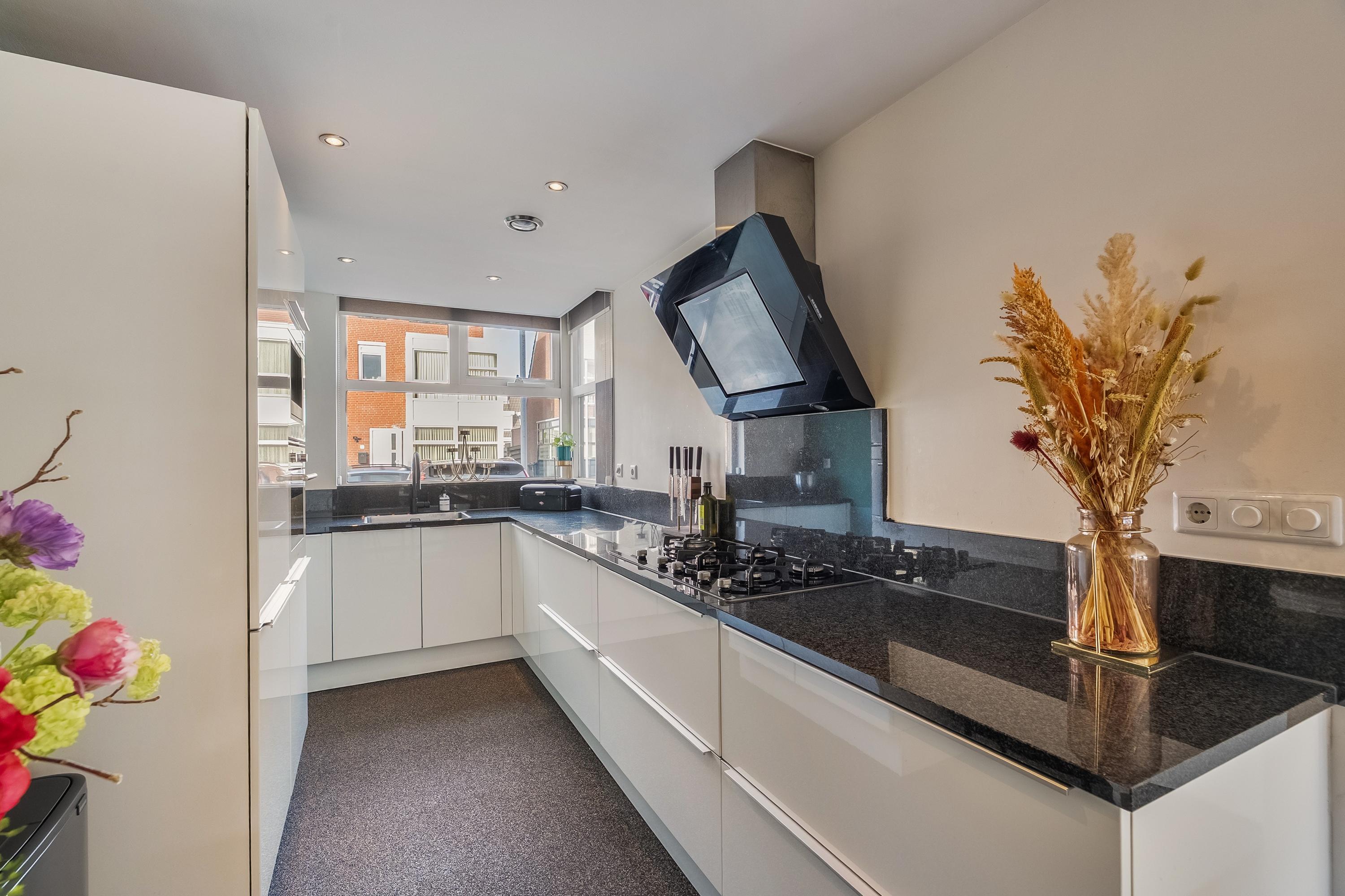 Aan de voorzijde bevindt zich de open keuken in hoekopstelling. Deze keuken is uitgevoerd in wit hoogglans met een zwart natuurstenen aanrechtblad en beschikt over een vrijstaande hoge kastenwand met koelkast, combi-oven en espressomachine. In de hoekopstelling vind je het spoelgedeelte met zwarte flexkraan, een 5-pits gaskookplaat en een bijpassende zwarte afzuigkap. Het verlaagde plafond met inbouwspotjes maakt het geheel compleet.
