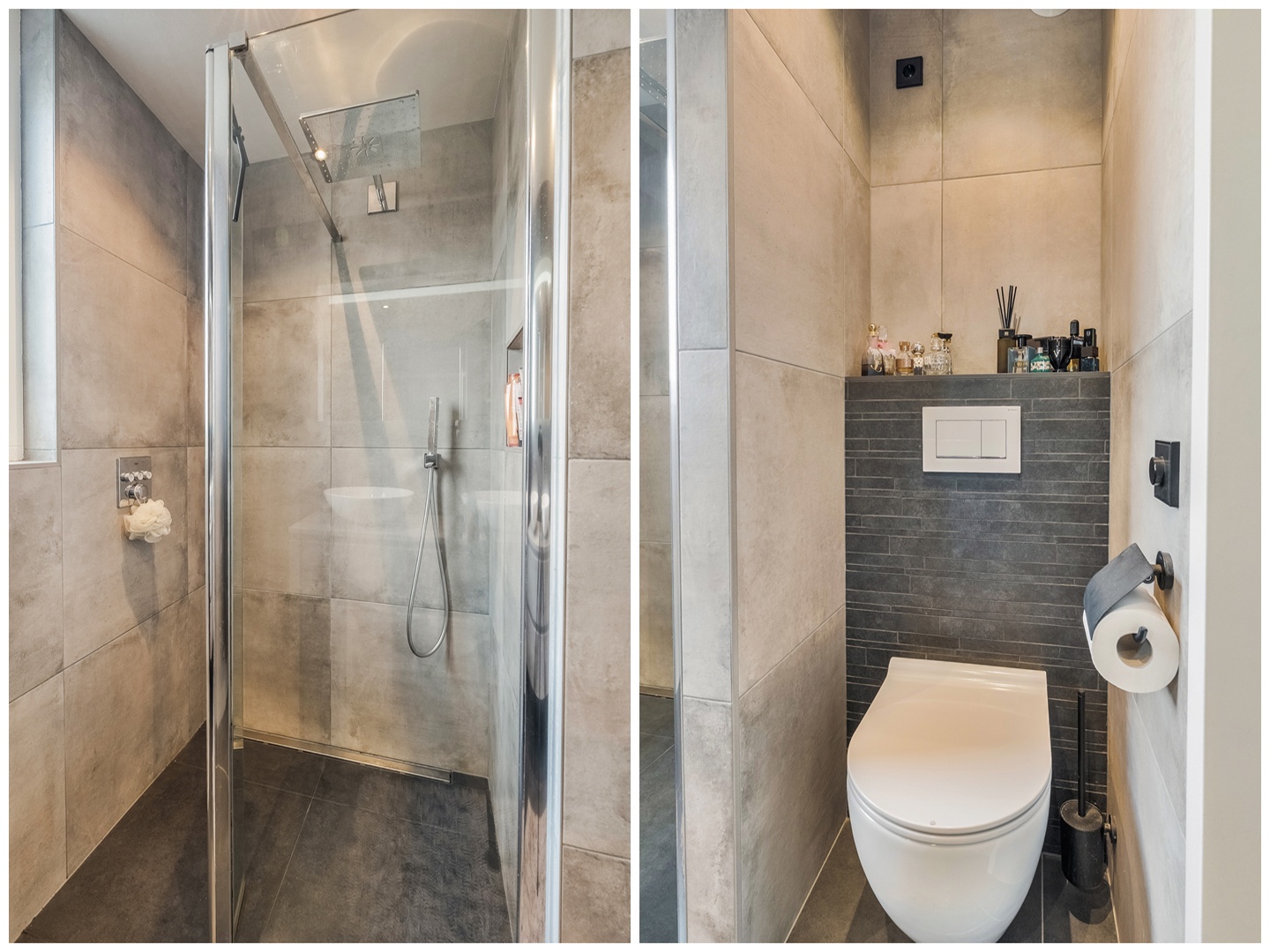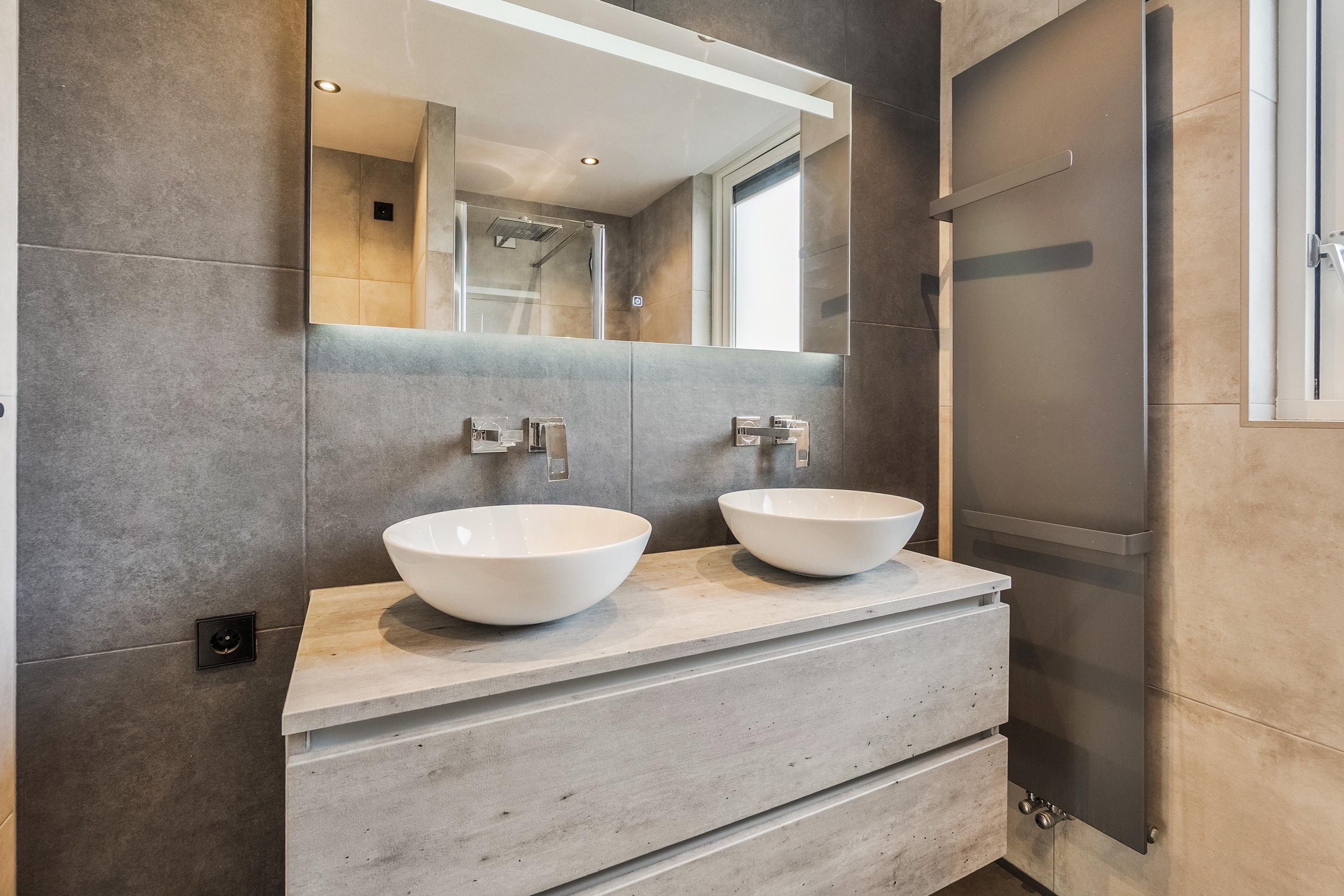 De moderne badkamer (2020) is volledig betegeld in een grijze kleurstelling en uitgerust met een ruime inloopdouche met glazen douchewand, een dubbel wastafelmeubel met twee waskommen en een verwarmde spiegel met dimbare verlichting. Daarnaast is er een tweede hangend toilet aanwezig.