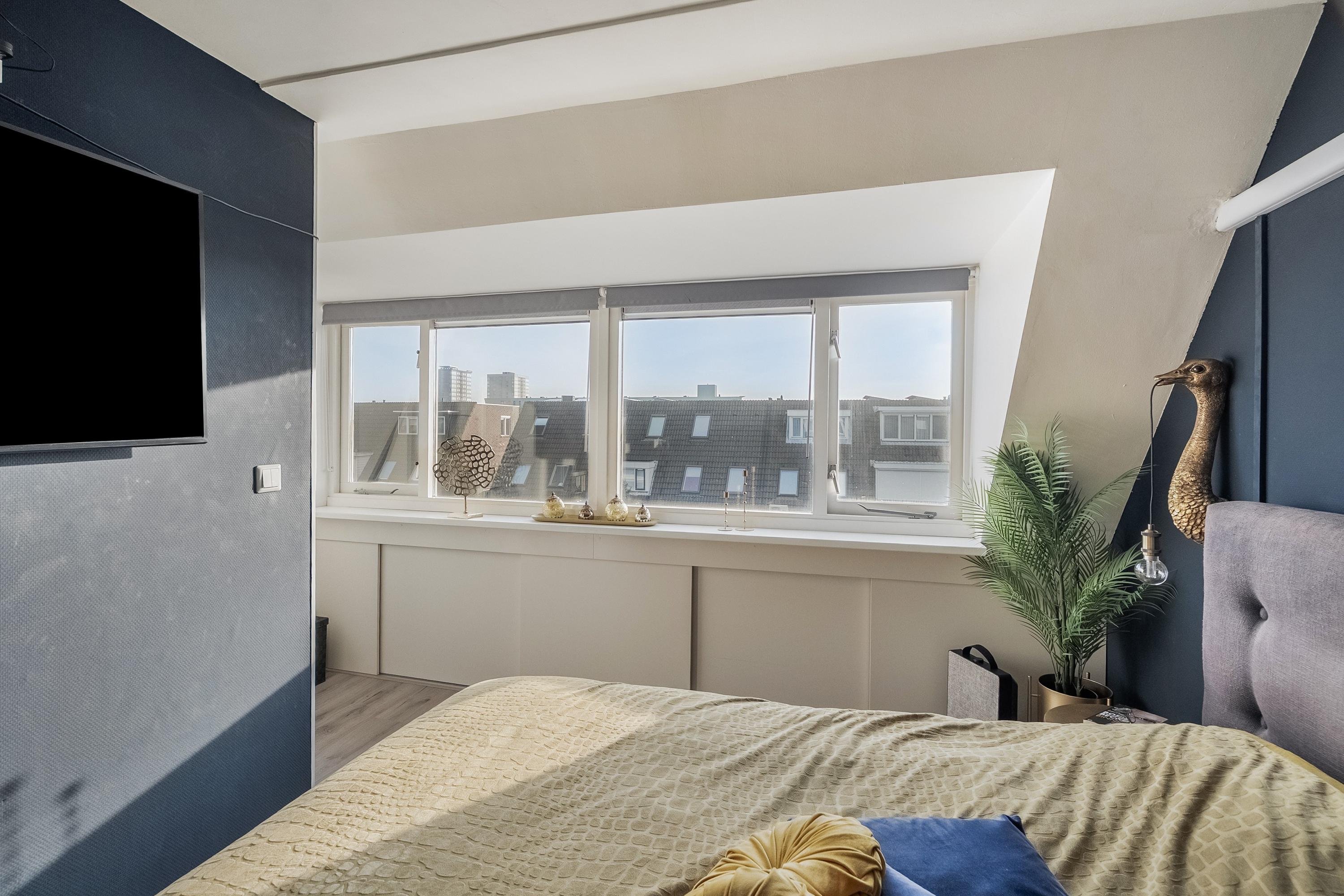 Slaapkamer 1 is gelegen aan de achterzijde en beschikt over twee Velux dakramen, airconditioning, een laminaatvloer en strak gestucte wanden.