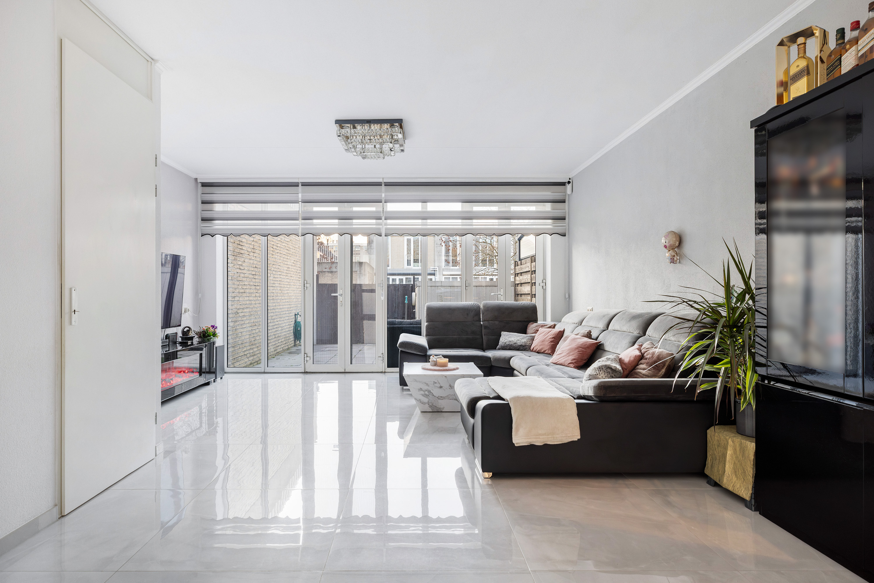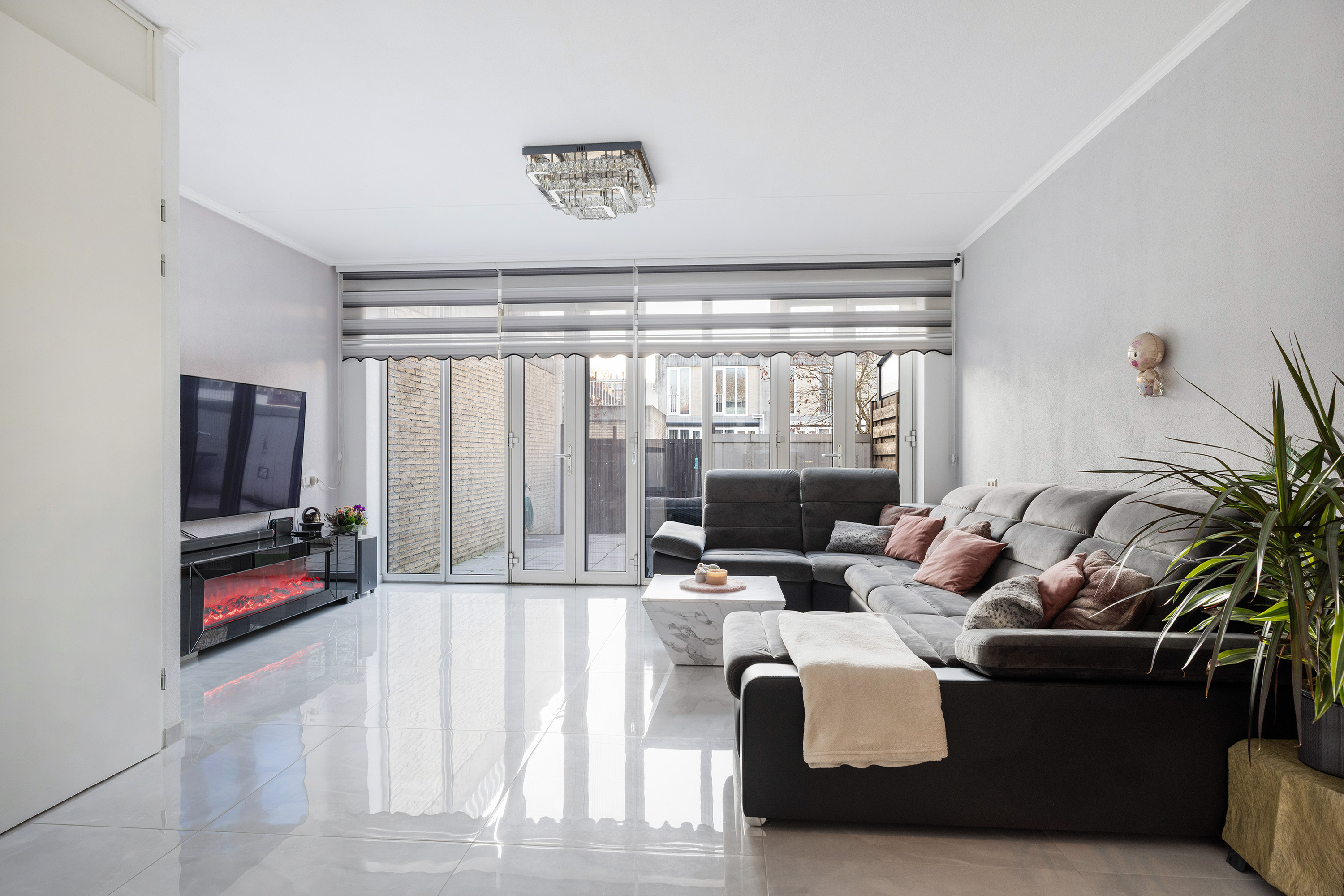 De tuingerichte woonkamer is sfeervol en licht, dankzij de grote raampartijen en dubbele openslaande deuren naar de achtertuin. De ruimte is strak afgewerkt met grote lichte plavuizen, vloerverwarming en spachtelputz wandafwerking. In de trapkast vindt u veel extra bergruimte.