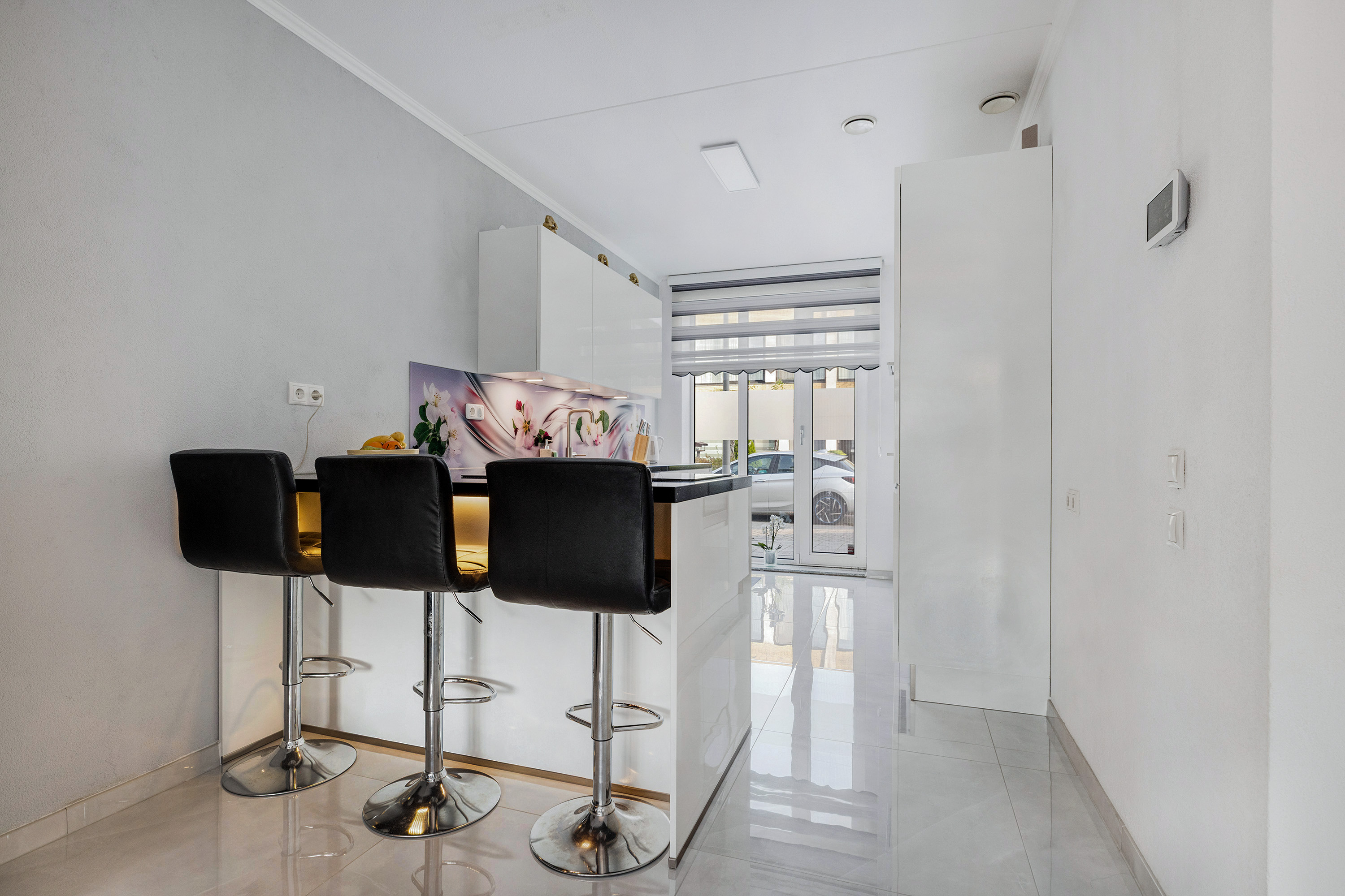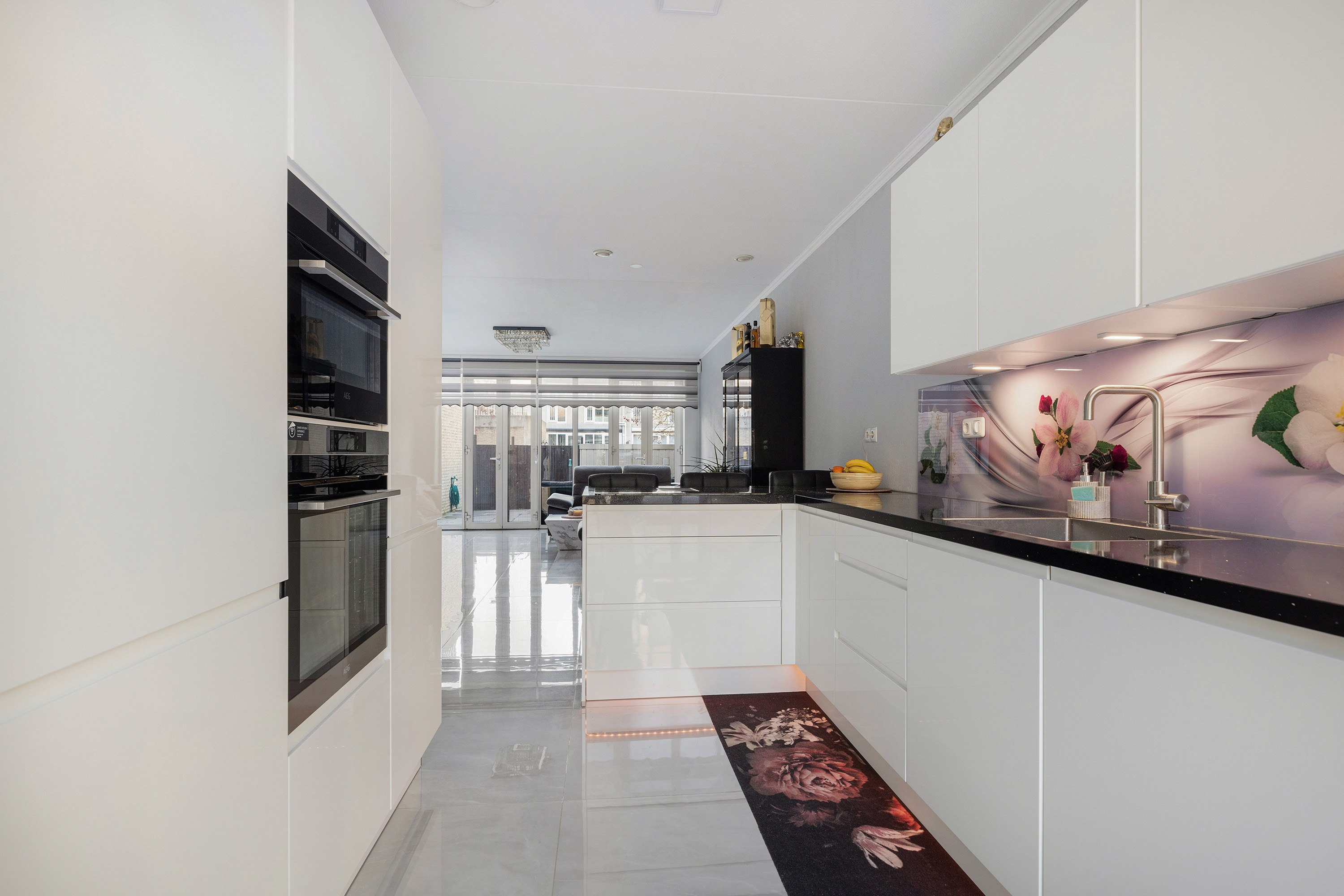 De luxe open woonkeuken (2021) is een absolute eyecatcher. Uitgevoerd in hoogglans wit met een donker stenen blad, voorzien van een hoekopstelling met eetbar en een vrijstaande wand met apparatuur. De keuken beschikt over o.a.: