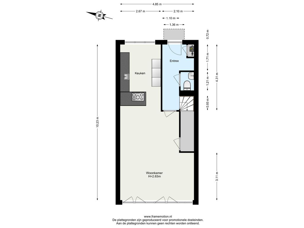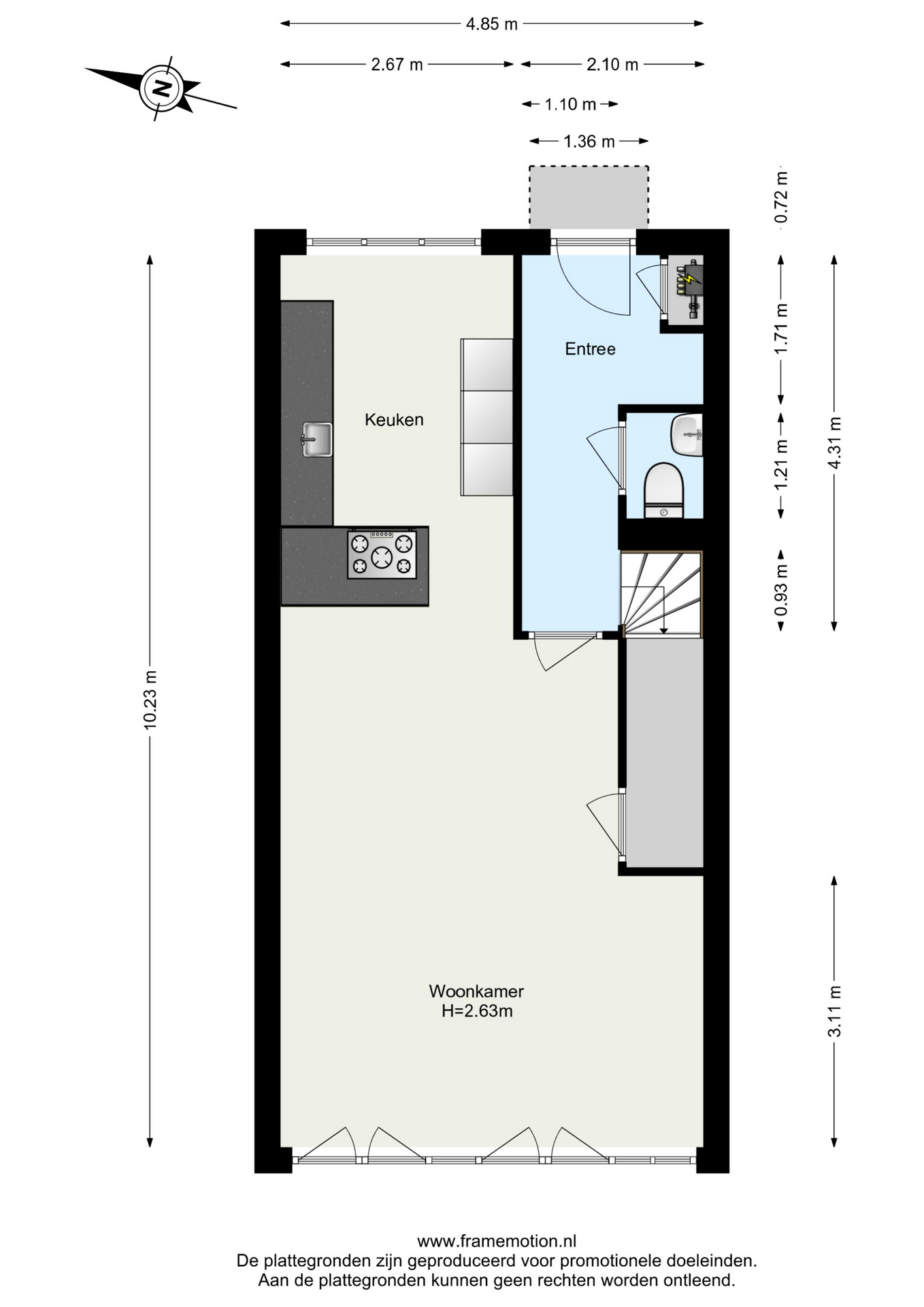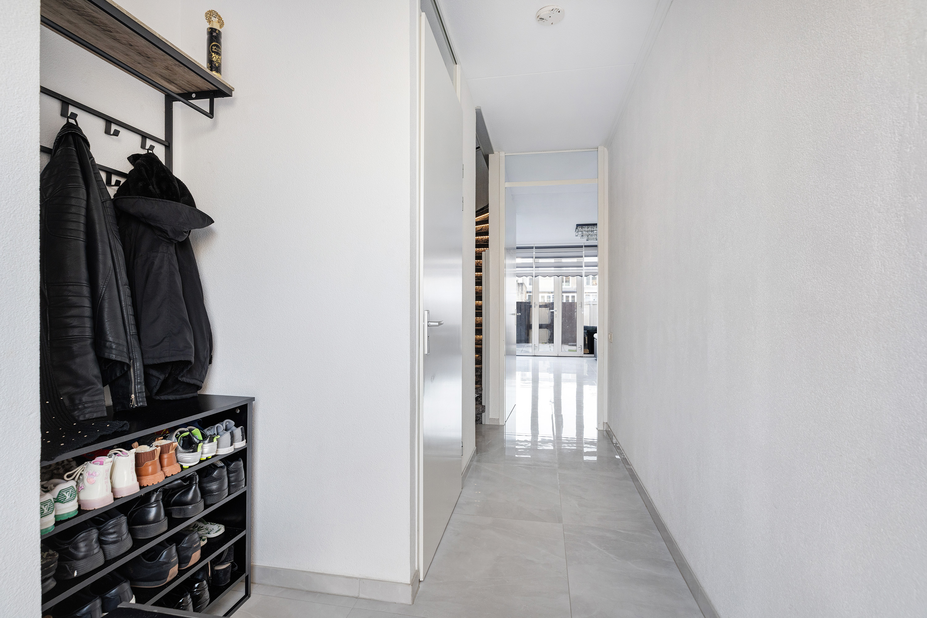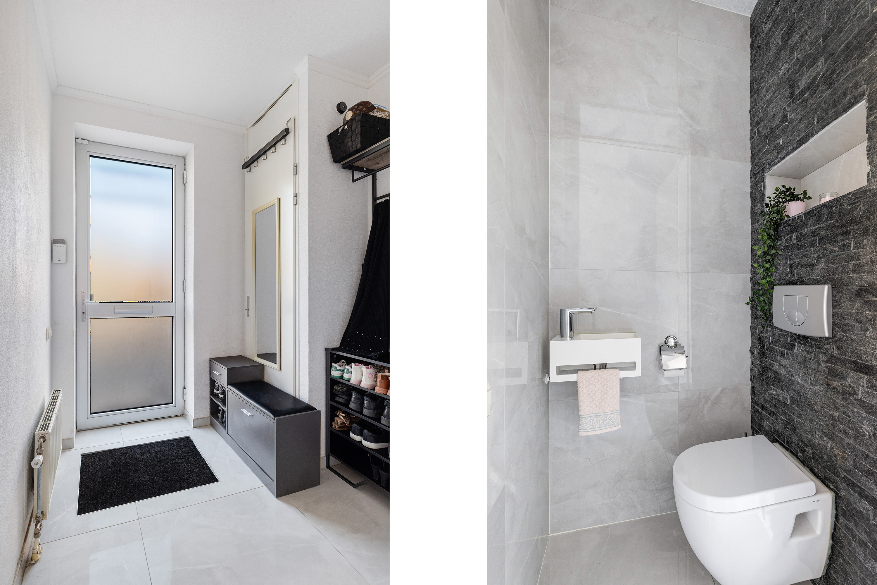 Via de ruime entree betreedt u de hal met meterkast en een modern afgewerkte toiletruimte. Het toilet is volledig betegeld in een subtiele licht-donkere kleurstelling en uitgerust met een hangend toilet en fonteintje. De trap naar de verdieping is voorzien van vloerbedekking, geïntegreerde verlichting en een stijlvolle zwarte stalen trapleuning.